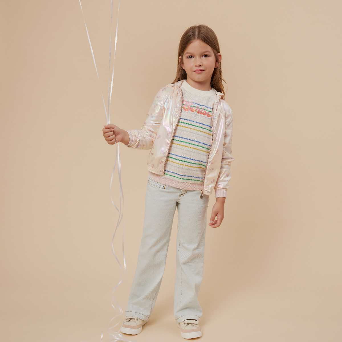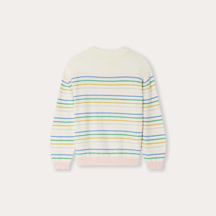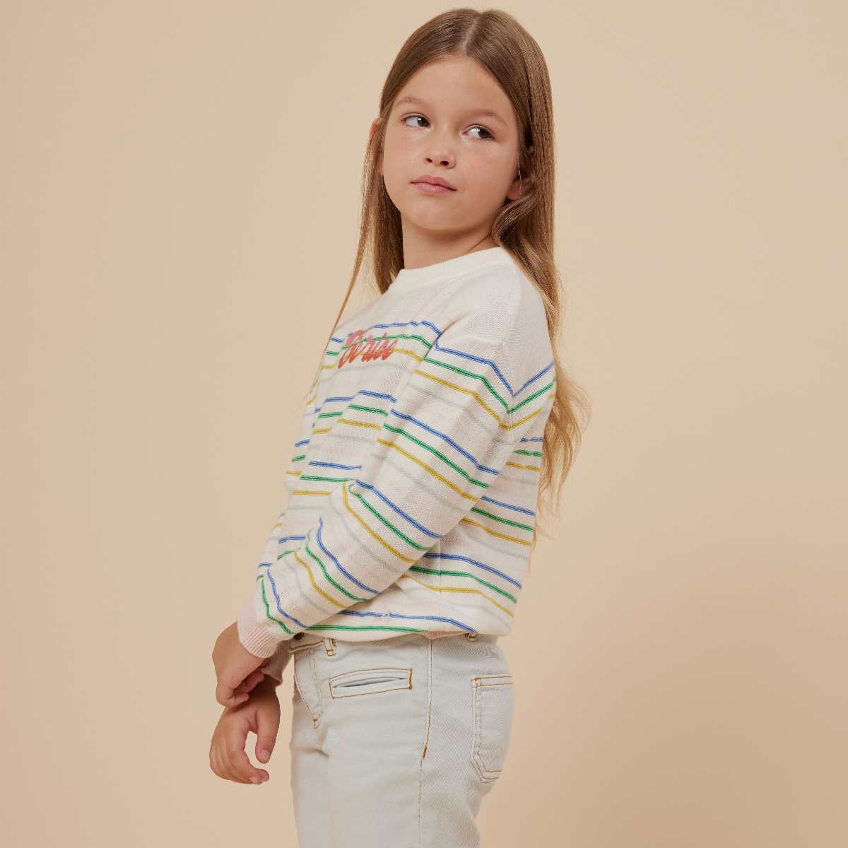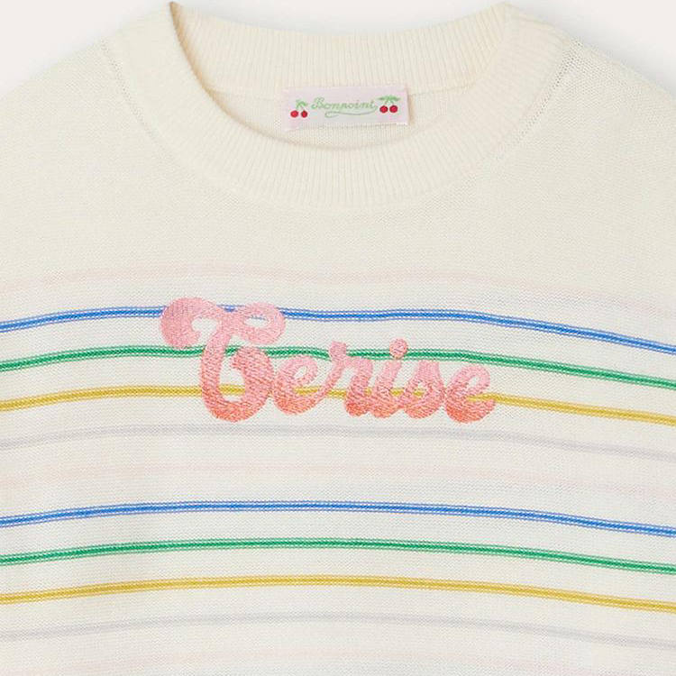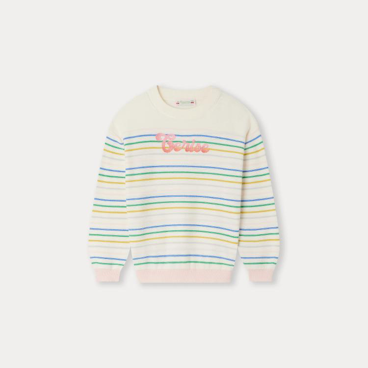 マルチカラーのボーダーが装いに彩りをプラスするオーガニックコットン製のセーター。前面には”Cerise”(チェリー)の刺繍が施され、ボンポワンらしい要素をプラスしました。