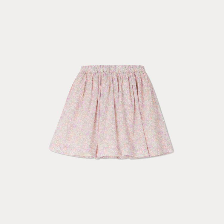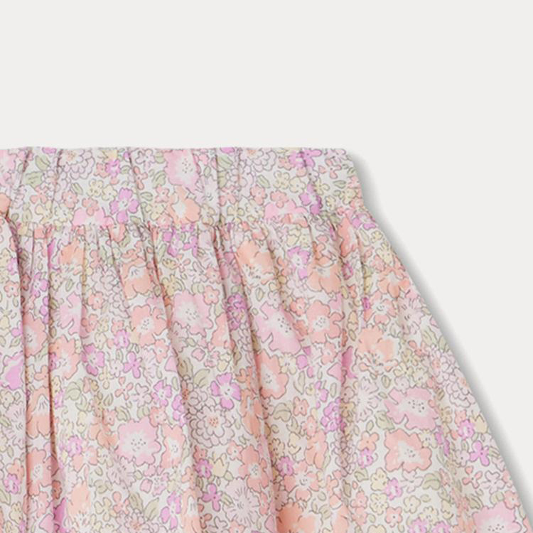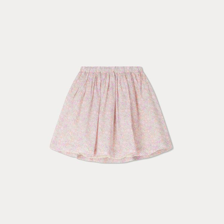 花柄プリントのリバティ生地を使用した、繊細なタッチのスカート。ウエストゴム下のギャザーがボリュームと動きを与える、楽しいスタイルです。