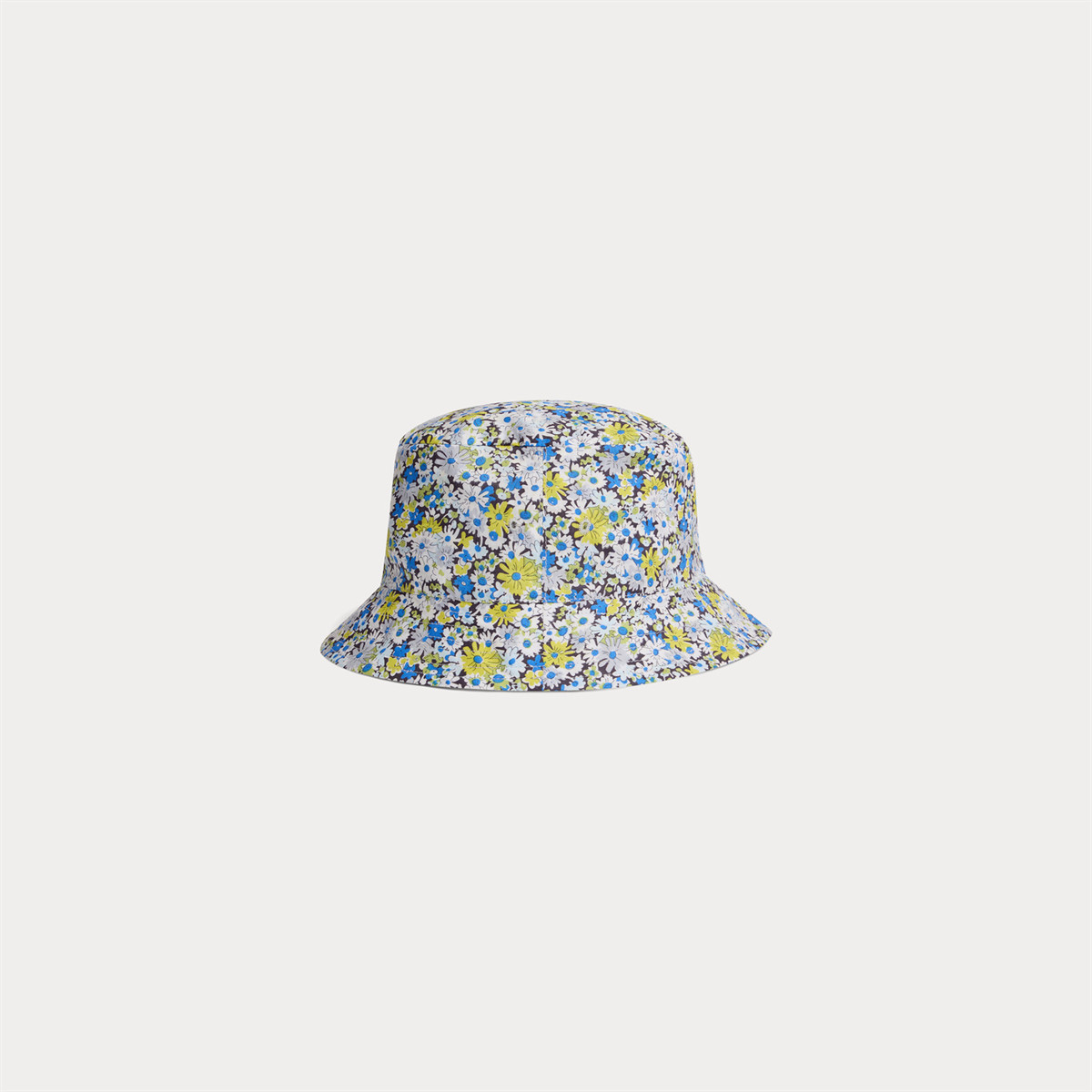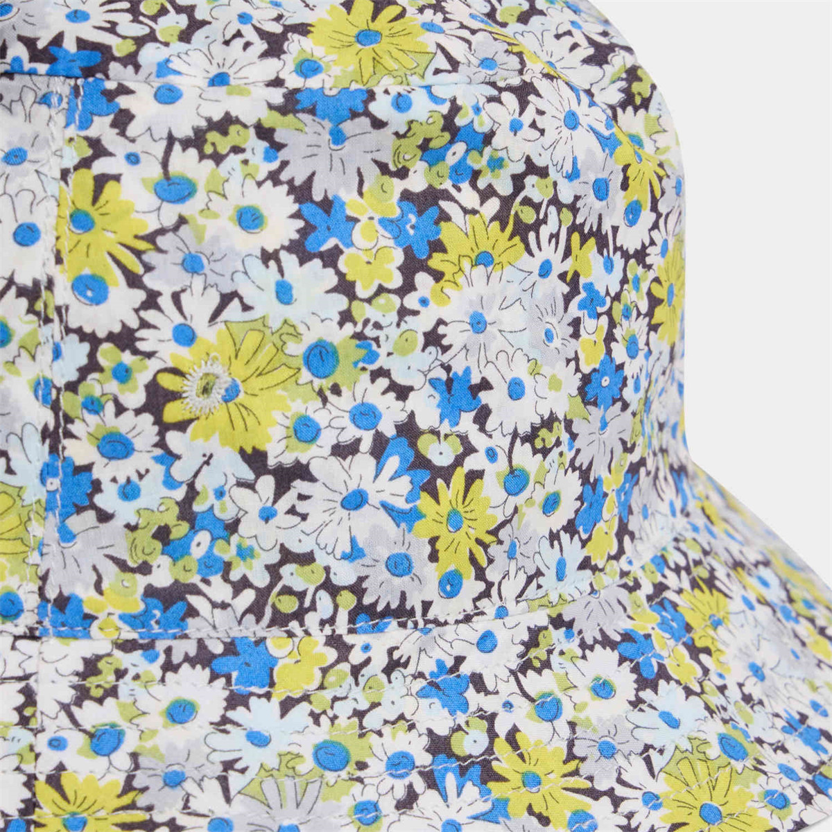 オーガニックコットンを使用した、花柄のリバティファブリックを使用したベビー用バケットハット。つばが広く、小さなお子さまを日差しから守ります。