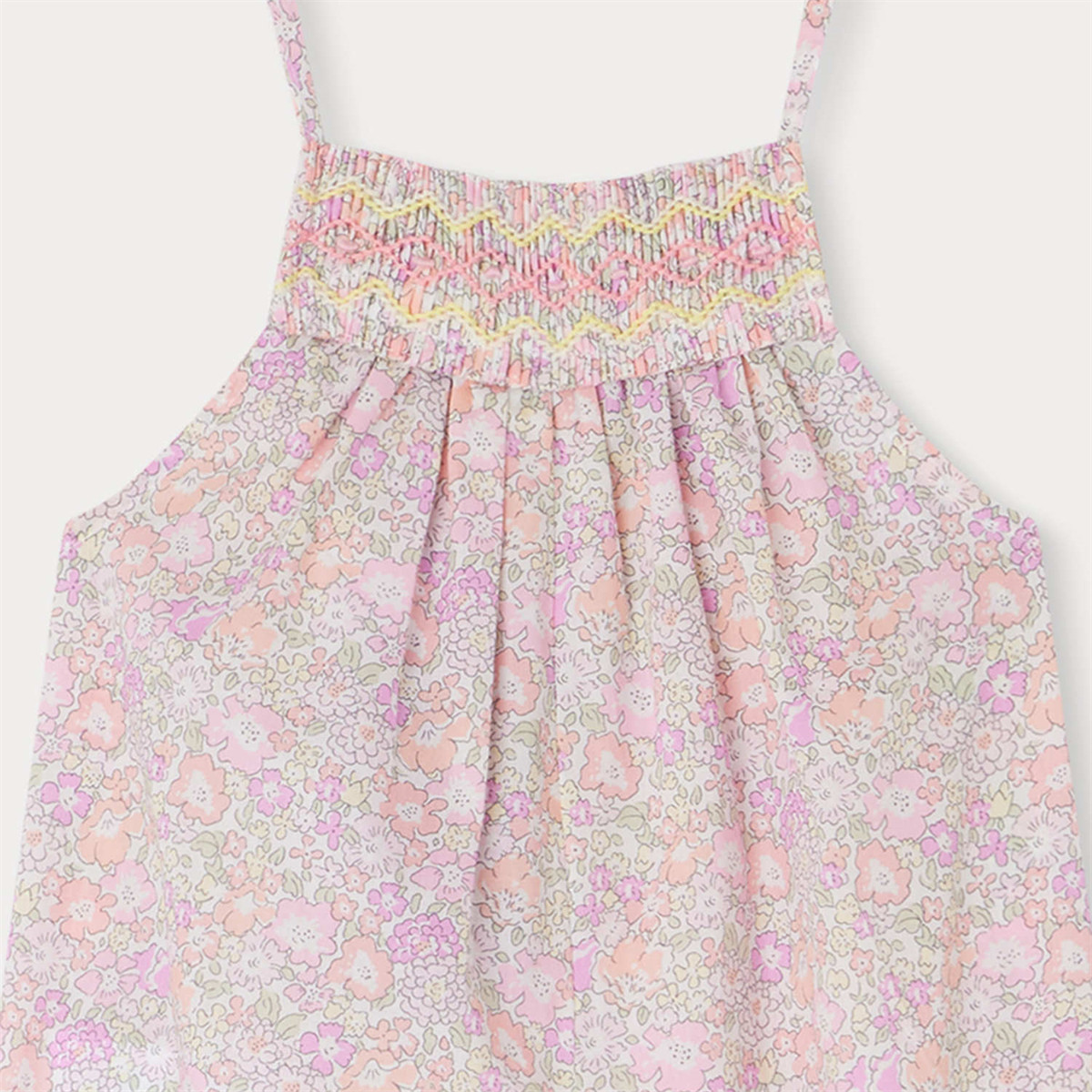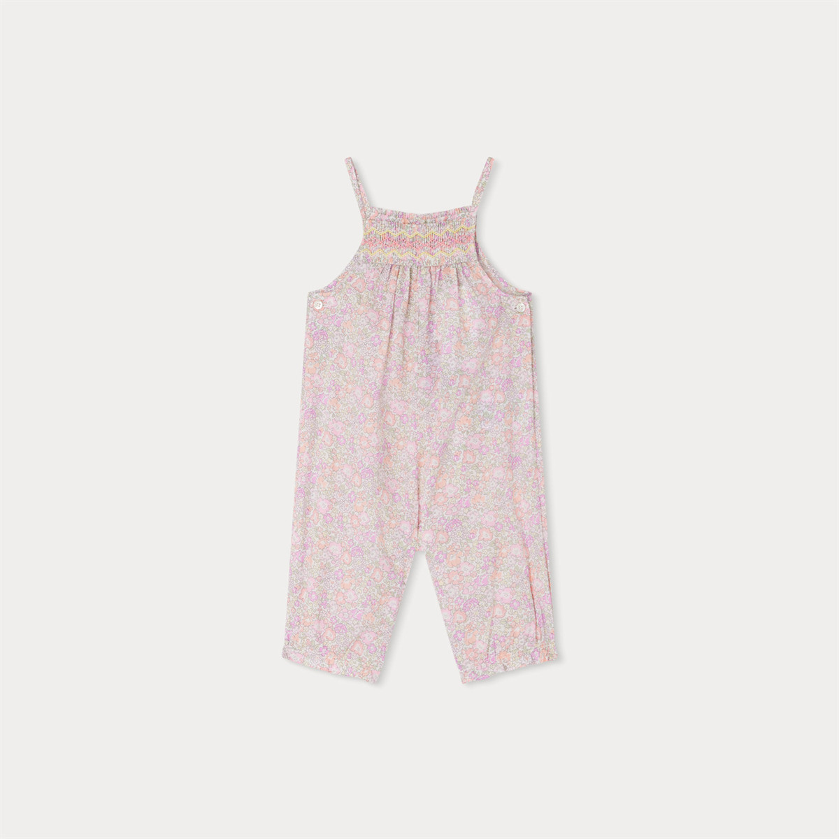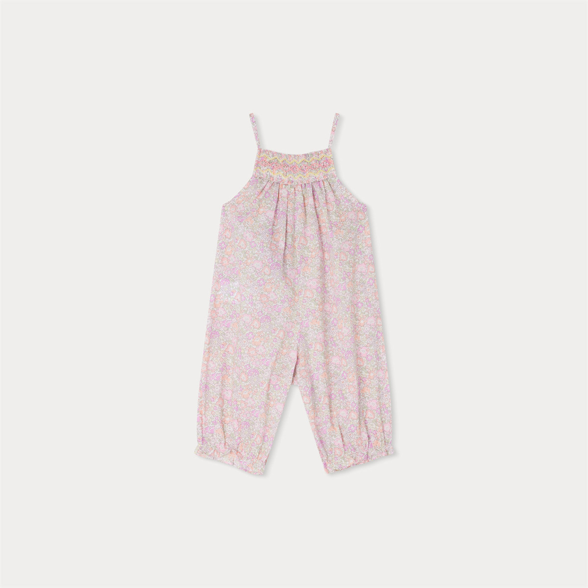 オーガニック認定のリバティ社製生地を使用したベビー用オーバーオールは、胸元にあしらわれた手刺繍のスモッキングが特徴。両サイドのボタンと股下のスナップボタンで着脱も簡単です。