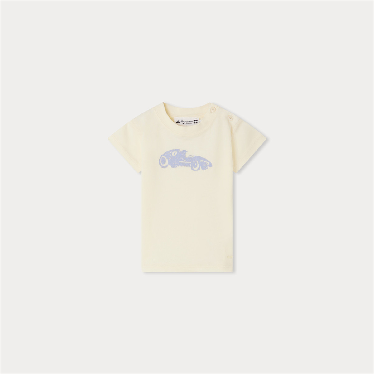レーシングカーのモチーフをあしらった、オーガニックコットンのベビーTシャツ。肩に控えめなボタンが付いているので、着脱も簡単です。