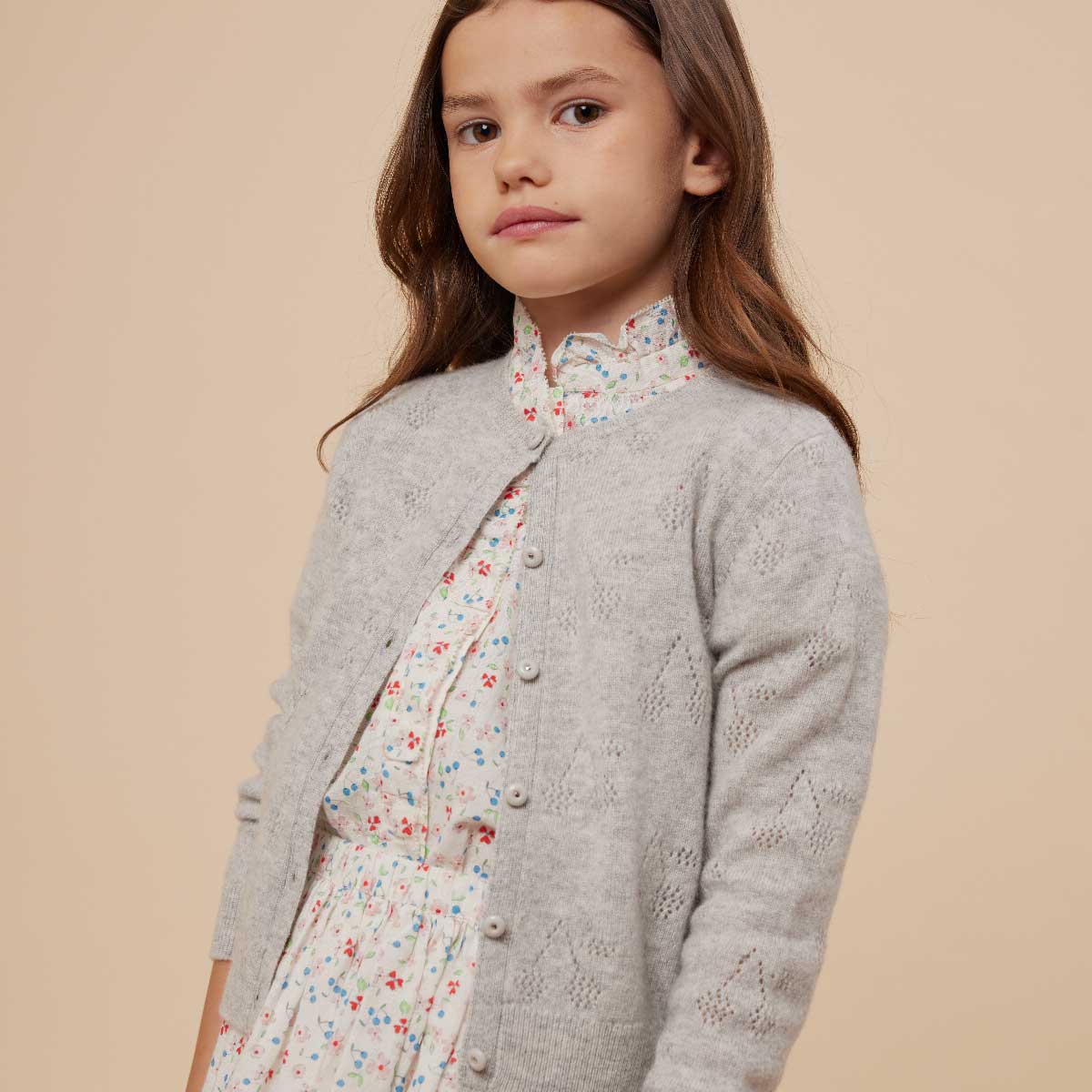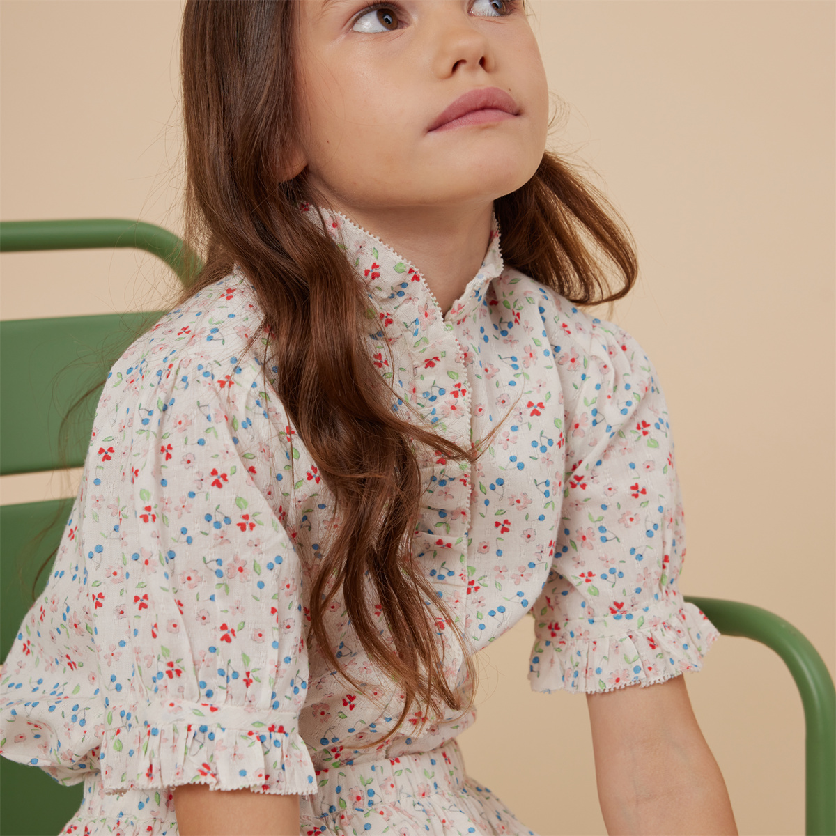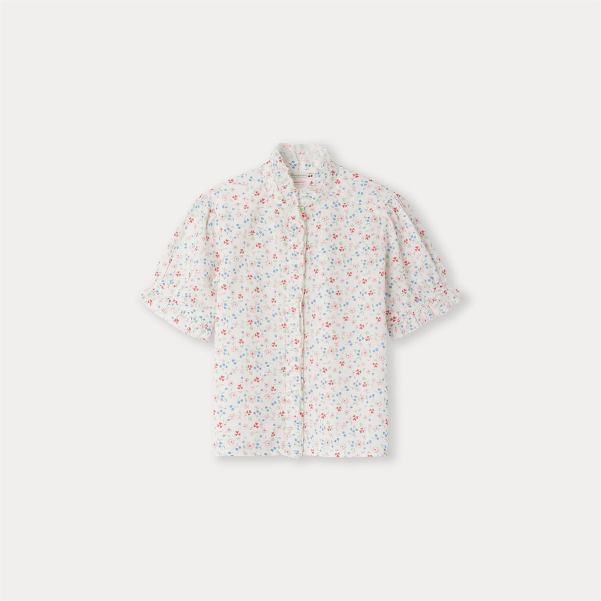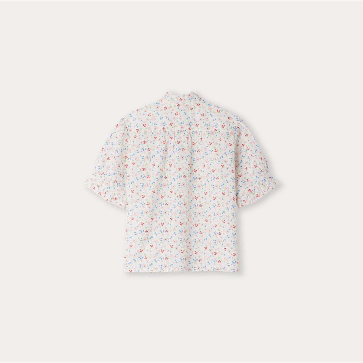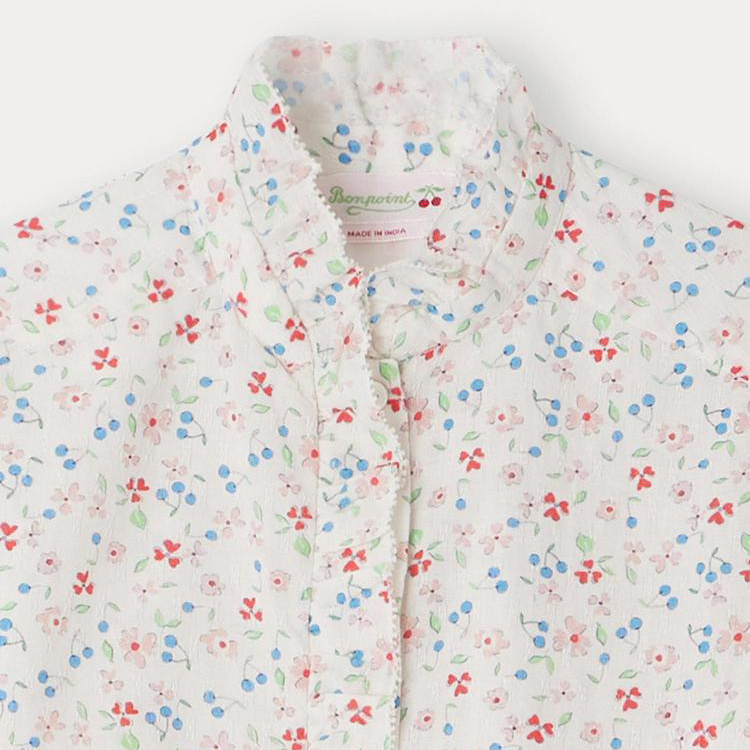 エレガントなラッフルカラーのブラウス。小花柄と小さなチェリーを全面にあしらった、女の子らしく上品な一枚です。セットアップでお楽しみいただけます。