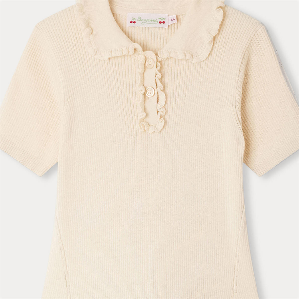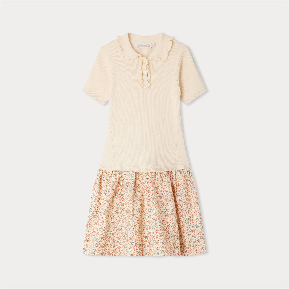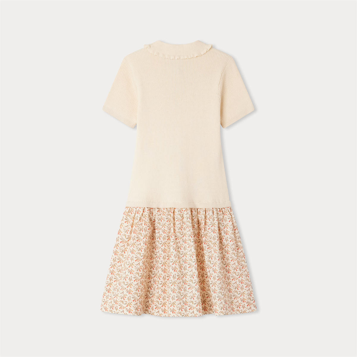 オーガニック認証コットンを使用した、半袖トップスと花柄コットンスカートの2素材からなるドレス。ピーターパン襟とボタンタブにはフリルがあしらわれています。