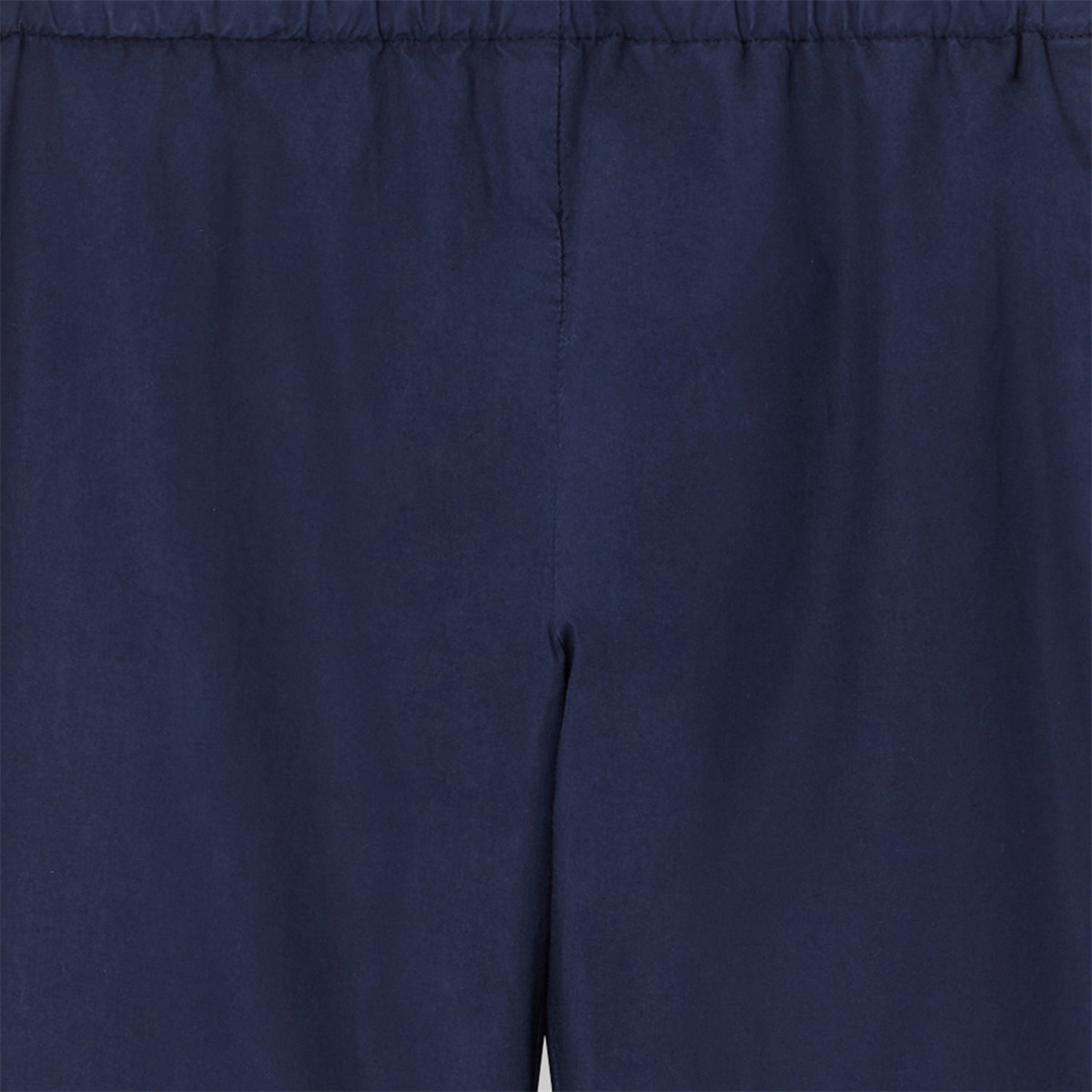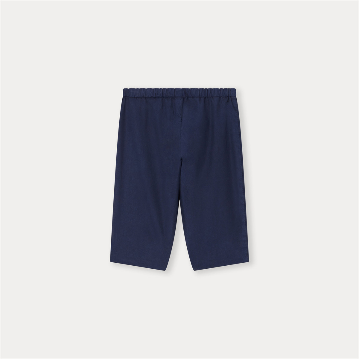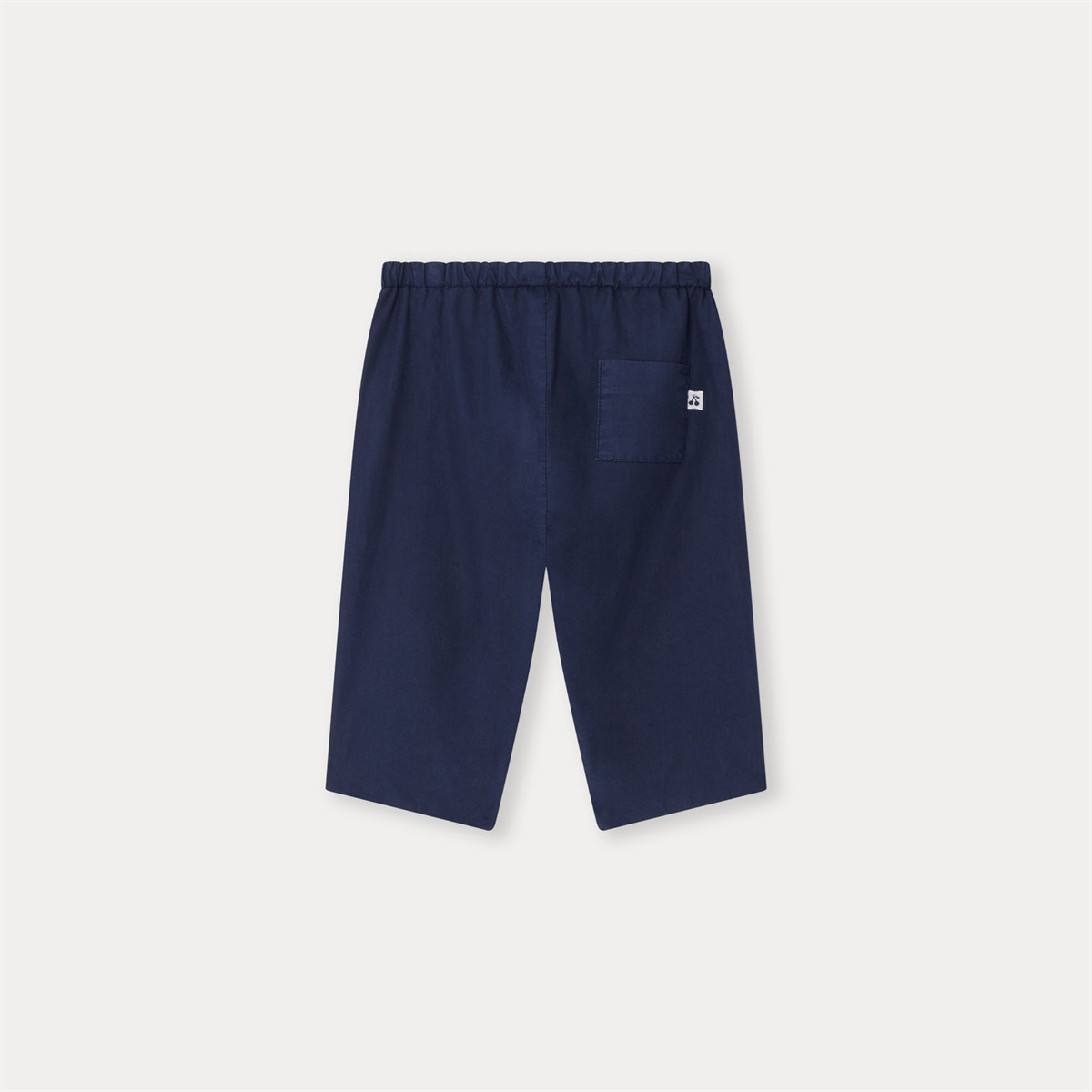 オーバーダイ加工を施したポプリン生地のベビーパンツは、ウエストがゴム仕様で、裏地はすべてソフトなコットン製。バックポケットにはチェリーを配したのラベルがあしらわれています。