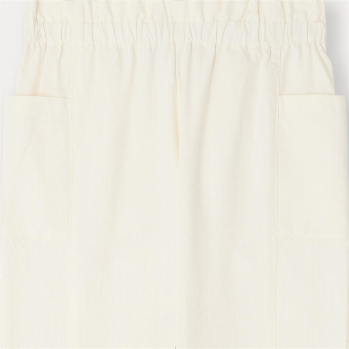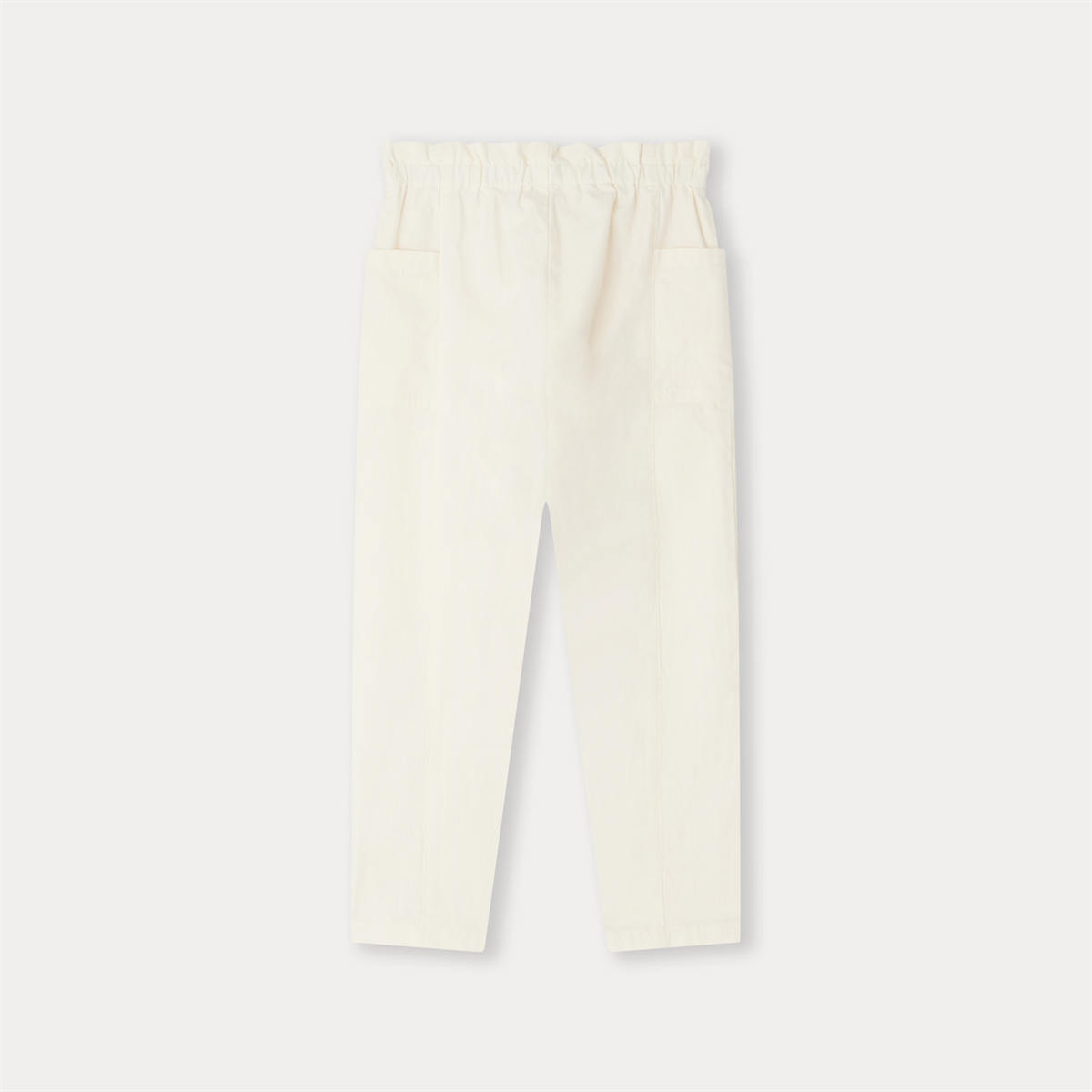 オーガニックコットン素材、ストレートカット、ゴムウエストで、快適さとエレガンスを兼ね備えたパンツ。両サイドにパッチポケット付き。