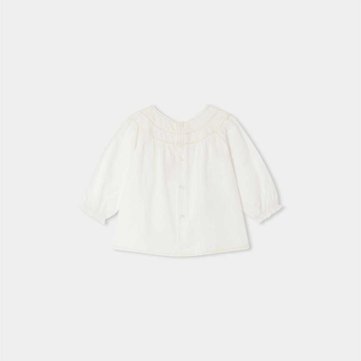 スタイリッシュで着心地のよい、オーガニックコットンボイルのベビー用ブラウス。手刺繍とカレーレースのインサートが特徴です。
