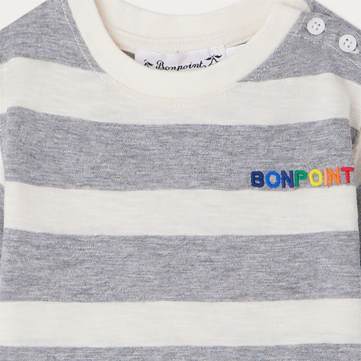 ワイドなストライプと胸にレインボーのBonpoint刺繍をあしらったコットンジャージ製のベビーTシャツ。クルーネックのデザインで、肩のボタンで簡単に着脱できます。