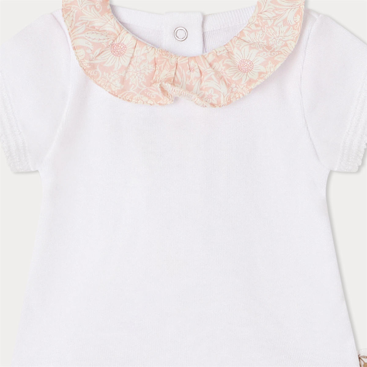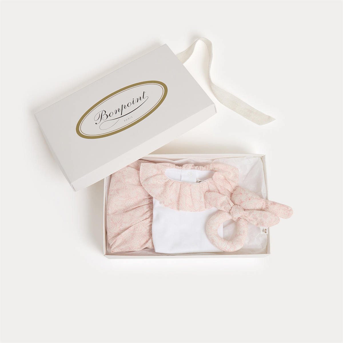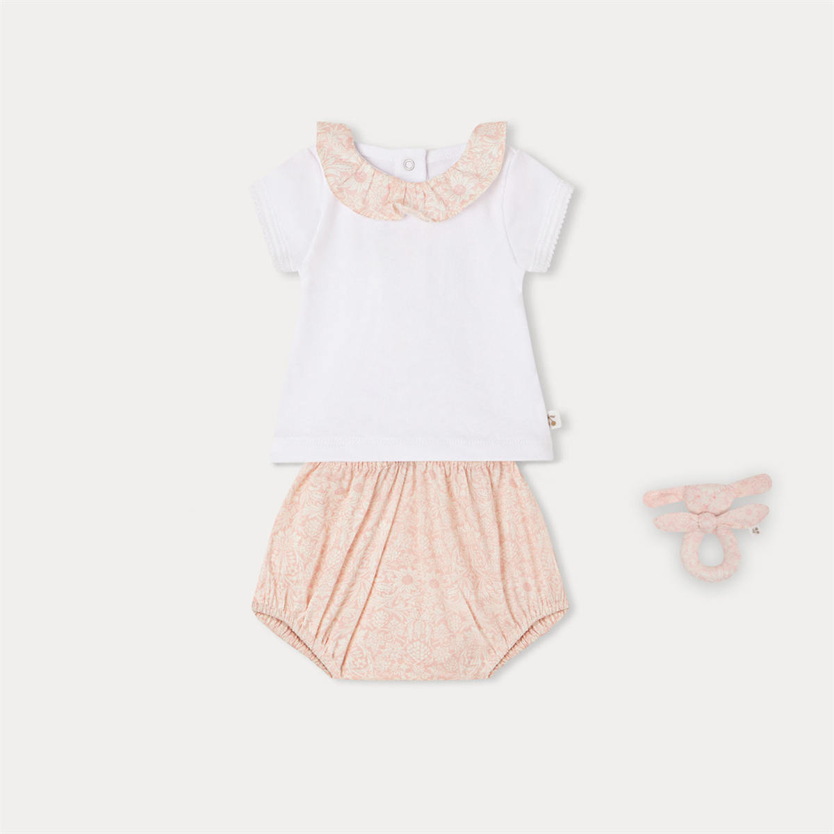ピーターパンカラーとブルマにオリジナルプリントを施した、ベビー用ギフトセット。お揃いのソフトトイと一緒にお届けします。