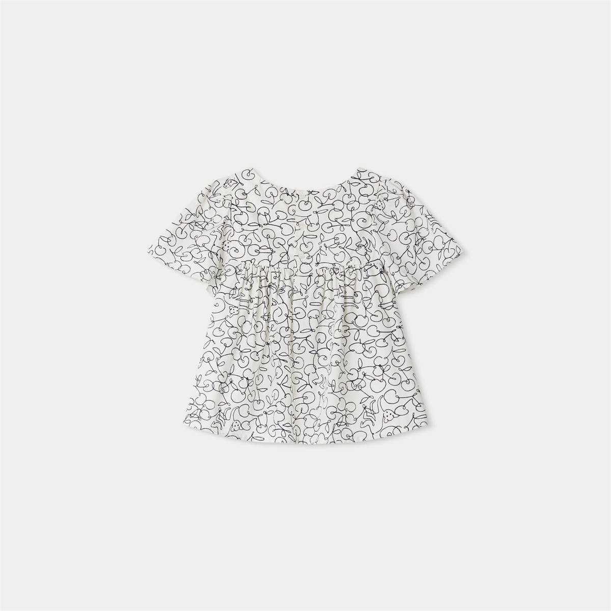 モノトーンで爽やかなブラウス。手書き風のチェリーが全面に配され、ところどころに猫も隠れているキュートな一枚。胸元にはギャザーが入り、シルエットも愛らしいのが特徴。