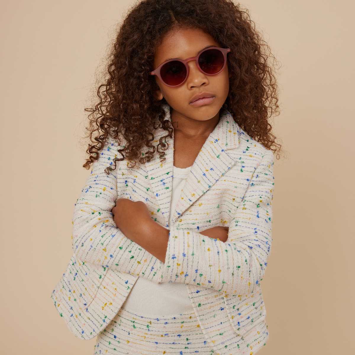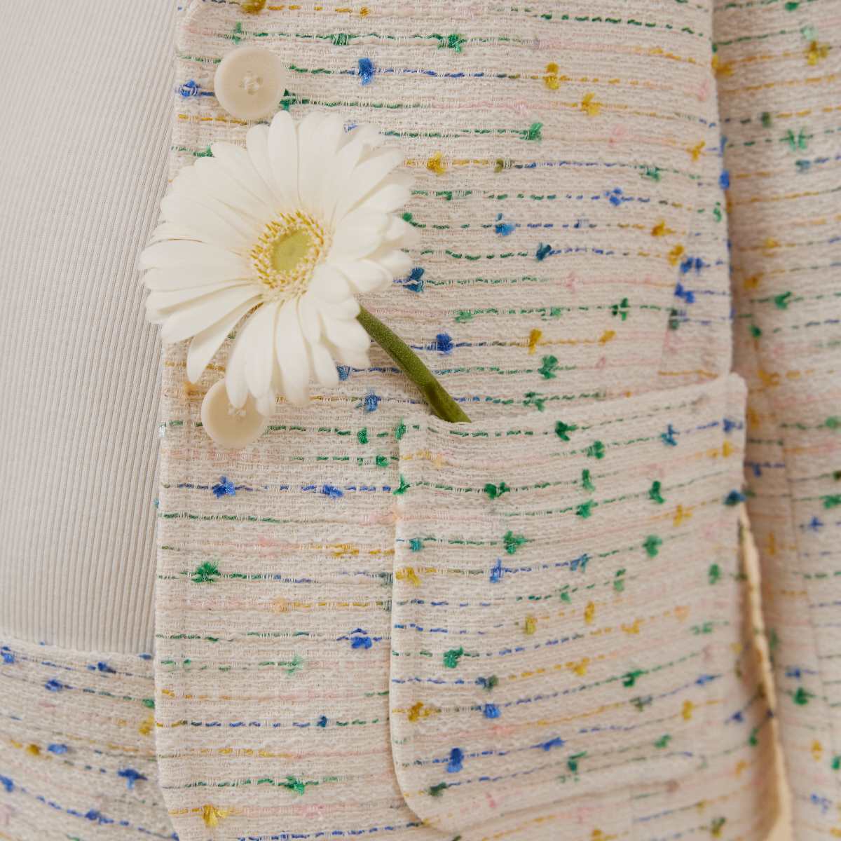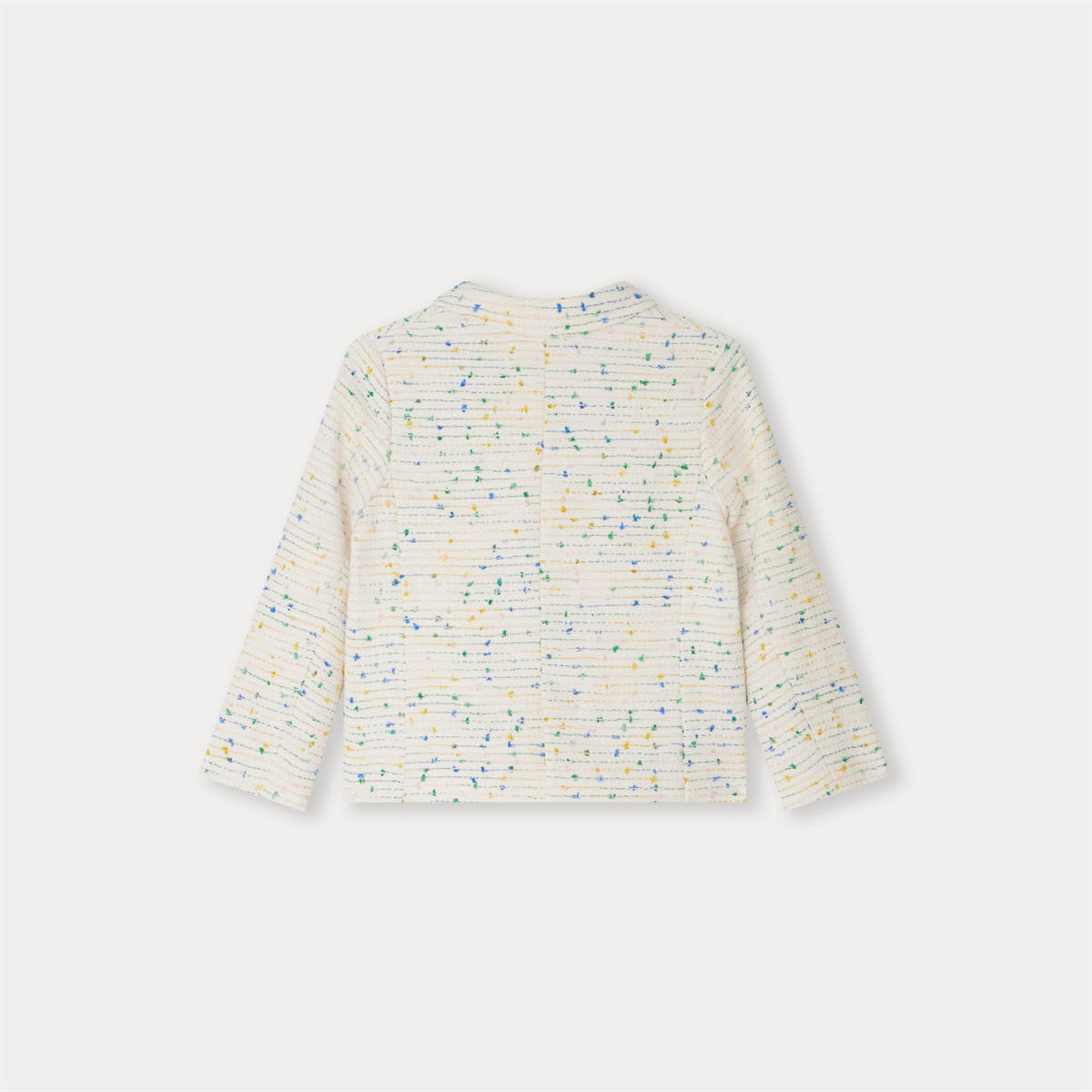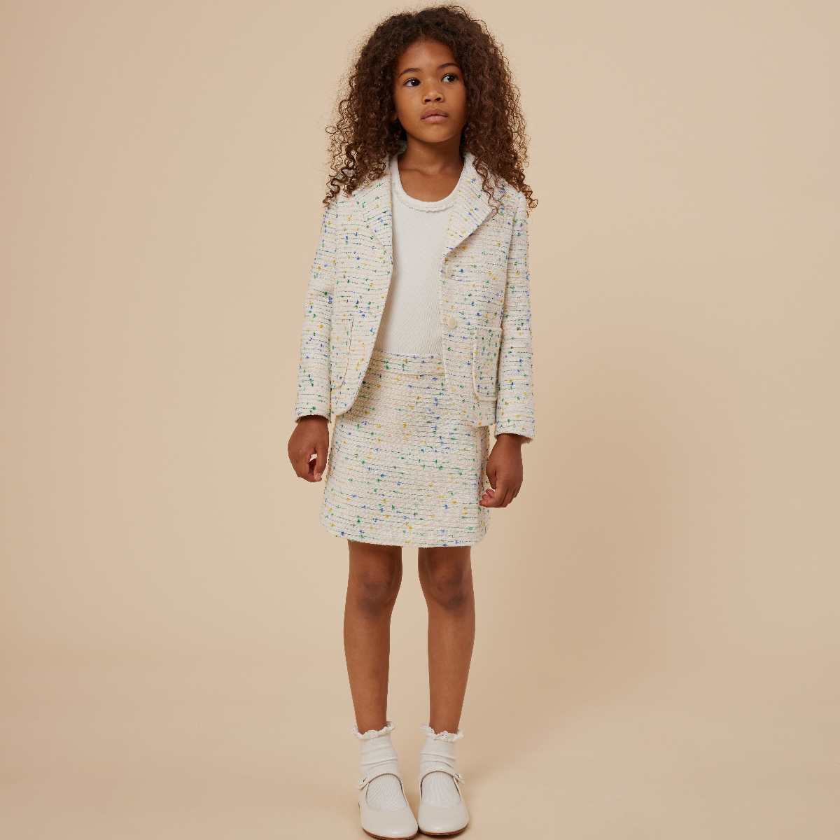 デコラティブなマルチカラー素材が、女の子の装いを引き立てるツイードジャケット。コットンリッチなこのアイテムは、ノッチドラペルがエレガントなデザインをさらに引き立てます。