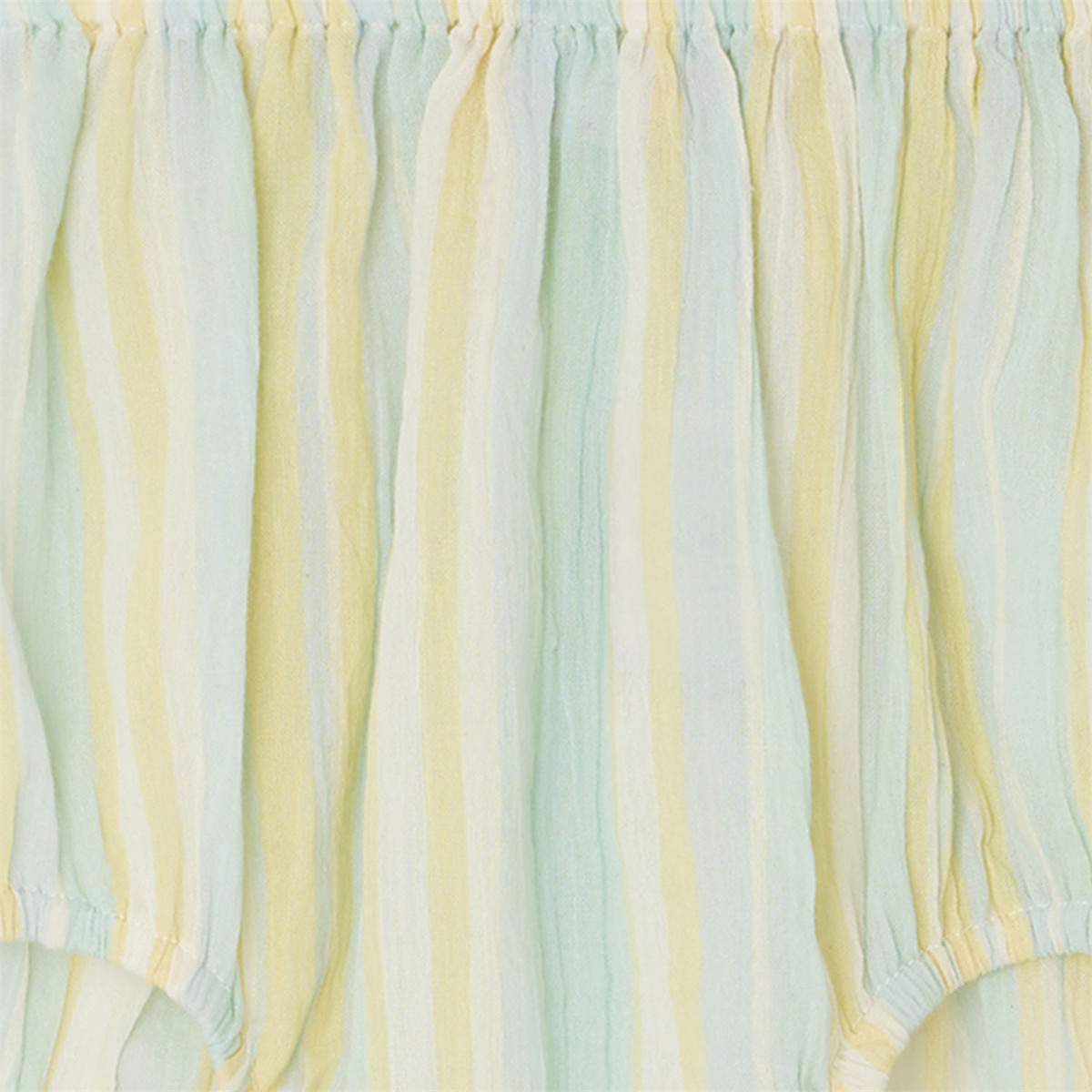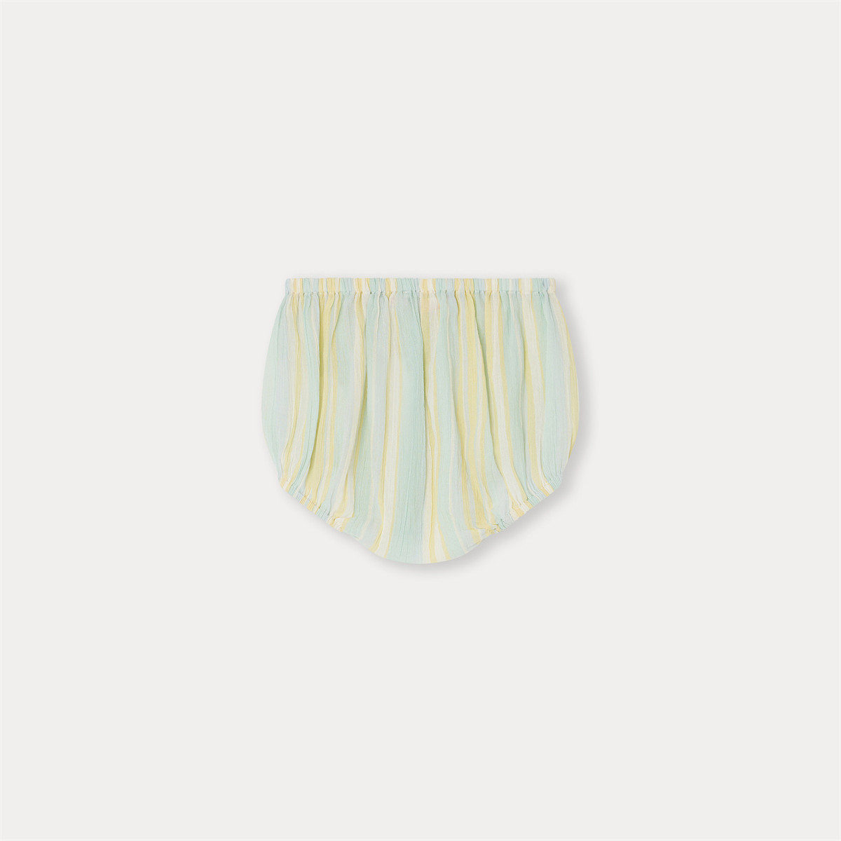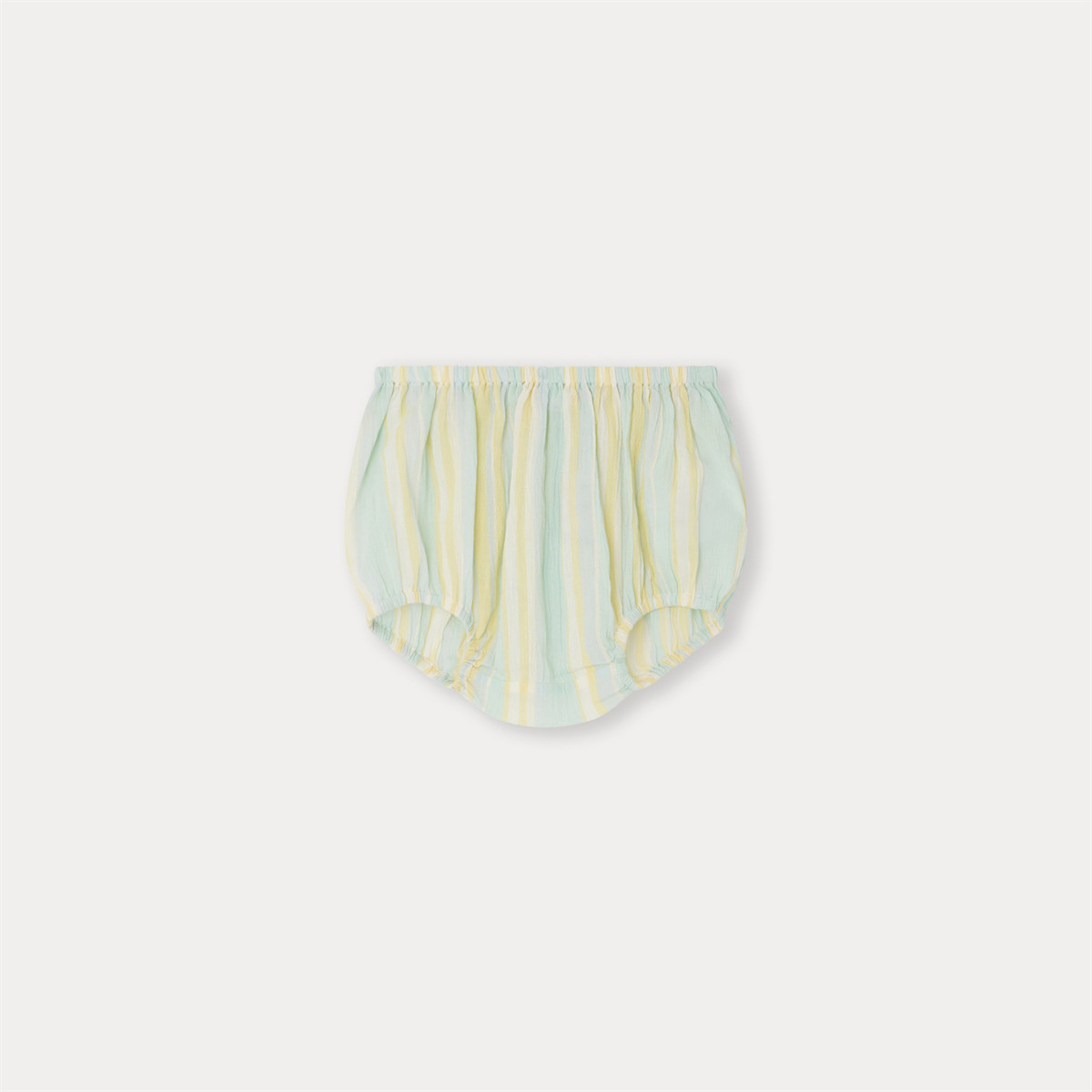 3色のストライプ柄がどんな服装にも彩りを添えるブルマ。軽量のコットンクレープを使用しているので、履き心地も抜群です。 ブラウスとセットアップで着ていただくのがボンポワンのおすすめ。