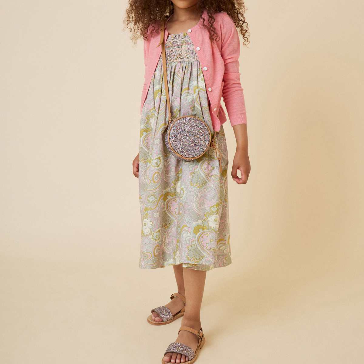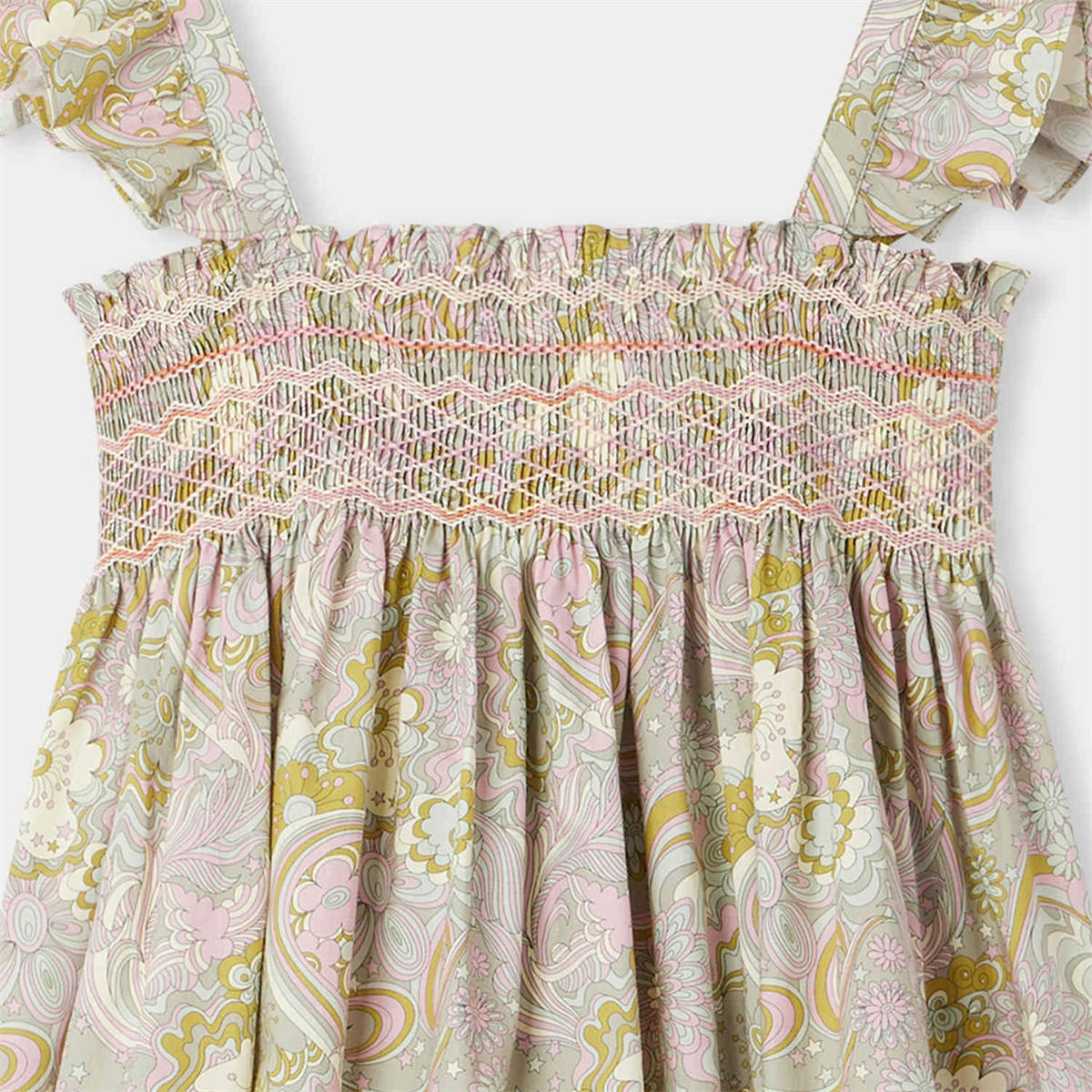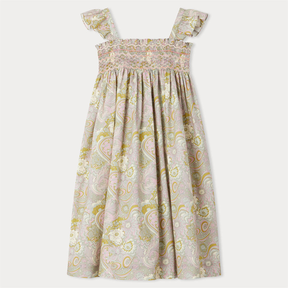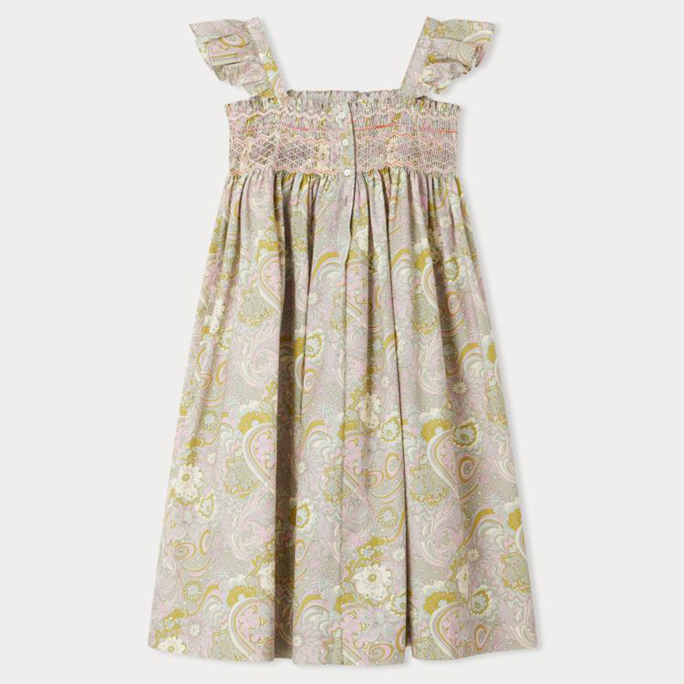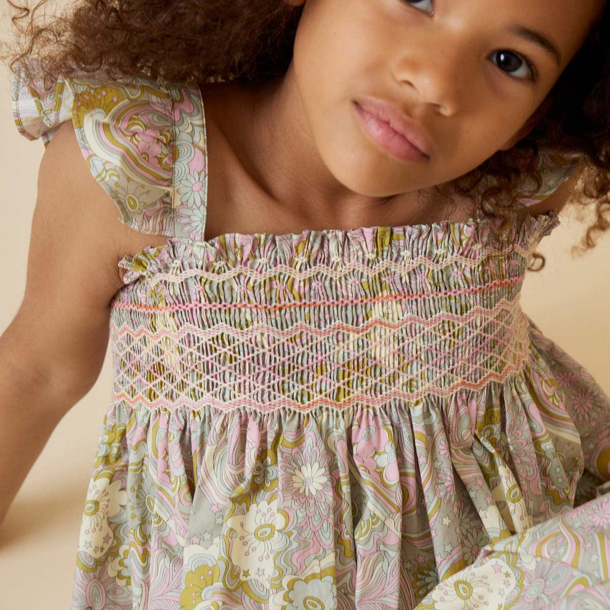 リバティファブリックを使用したエレガントなドレス。胸元のスモッキングには手刺繍が施され、ギャザーがドレスに動きを添えています。