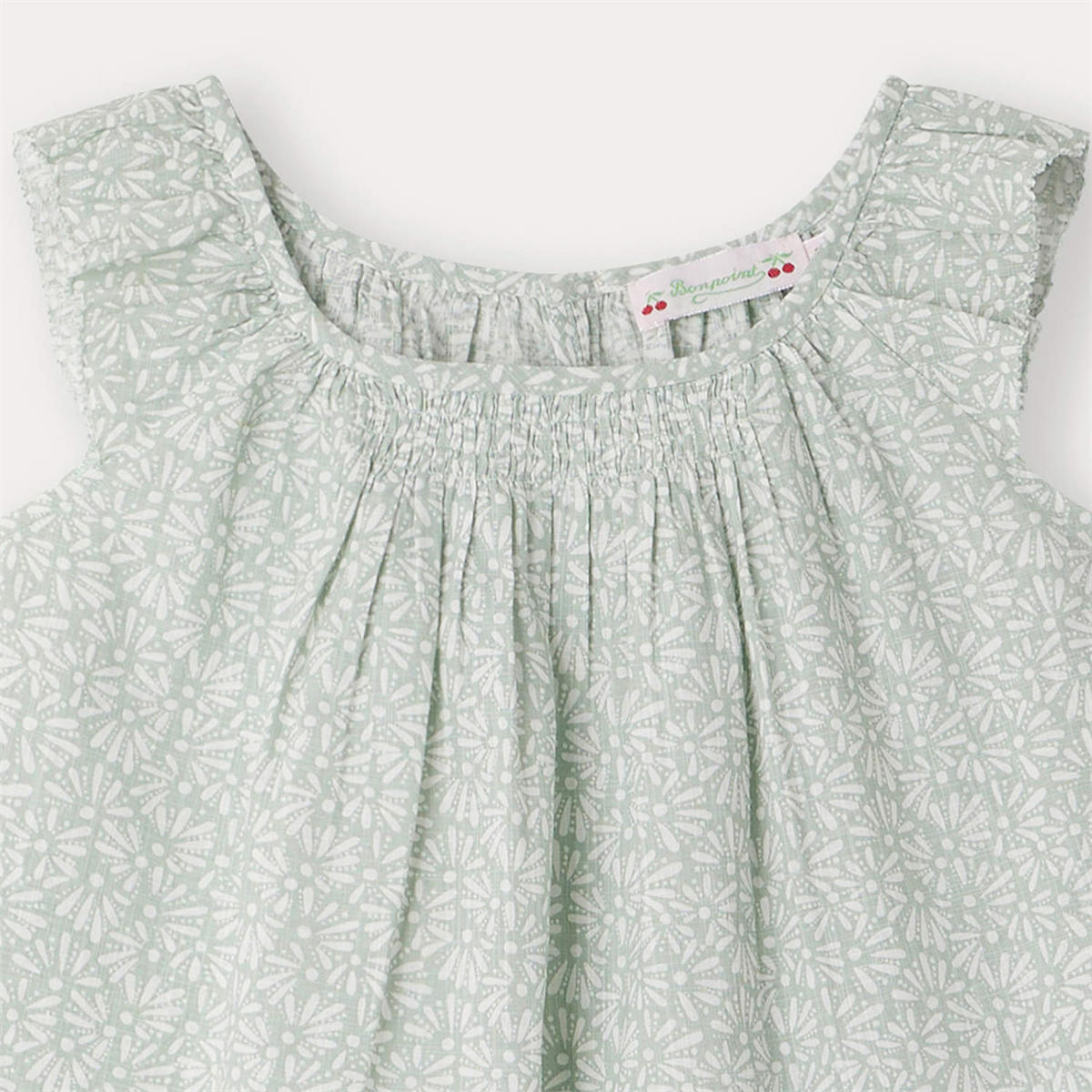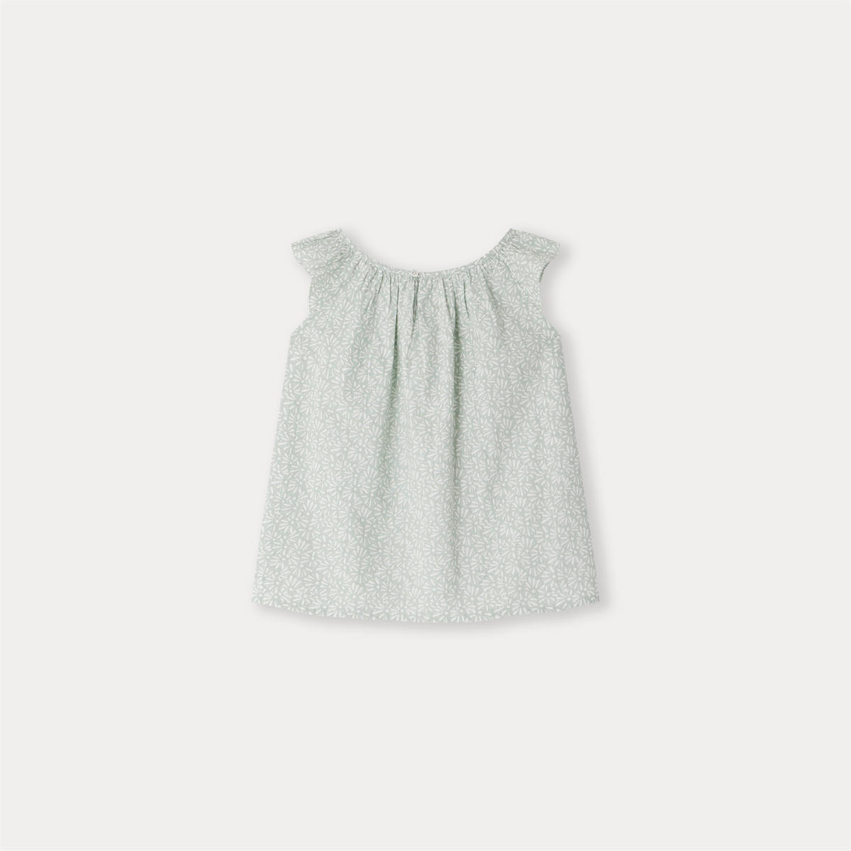 魅力的な自然をイメージしたプリントに、ネックラインの下に刺繍のプリーツをあしらったブラウス。肩に繊細なフリルを施しました。