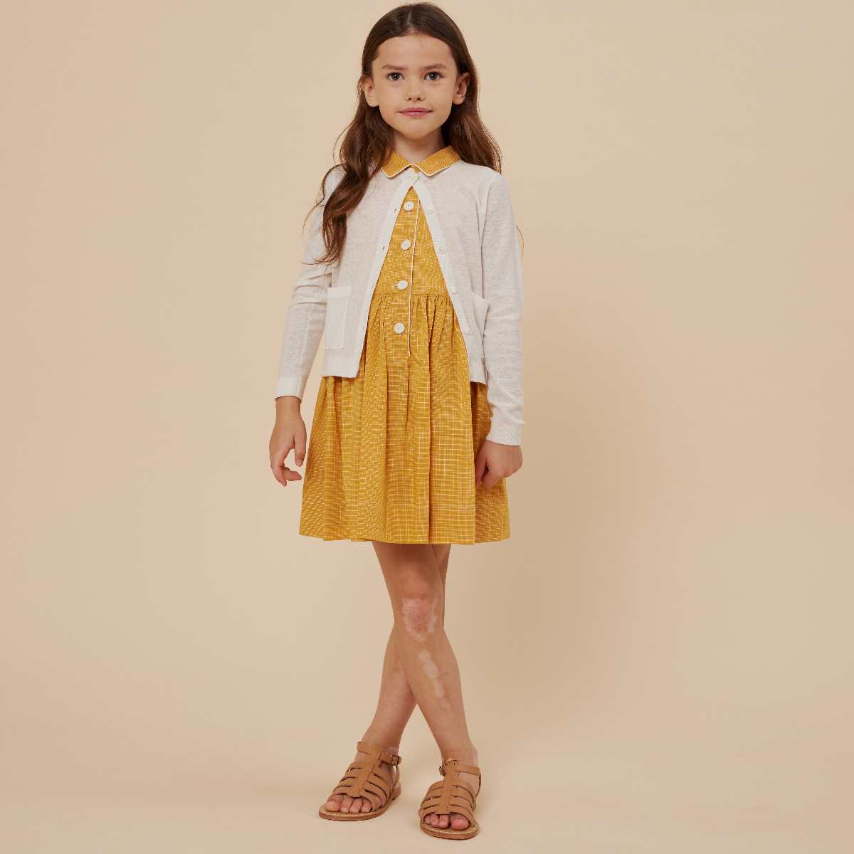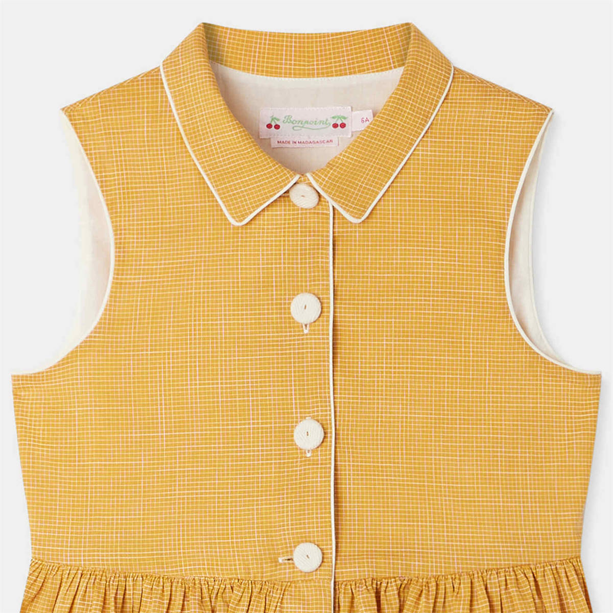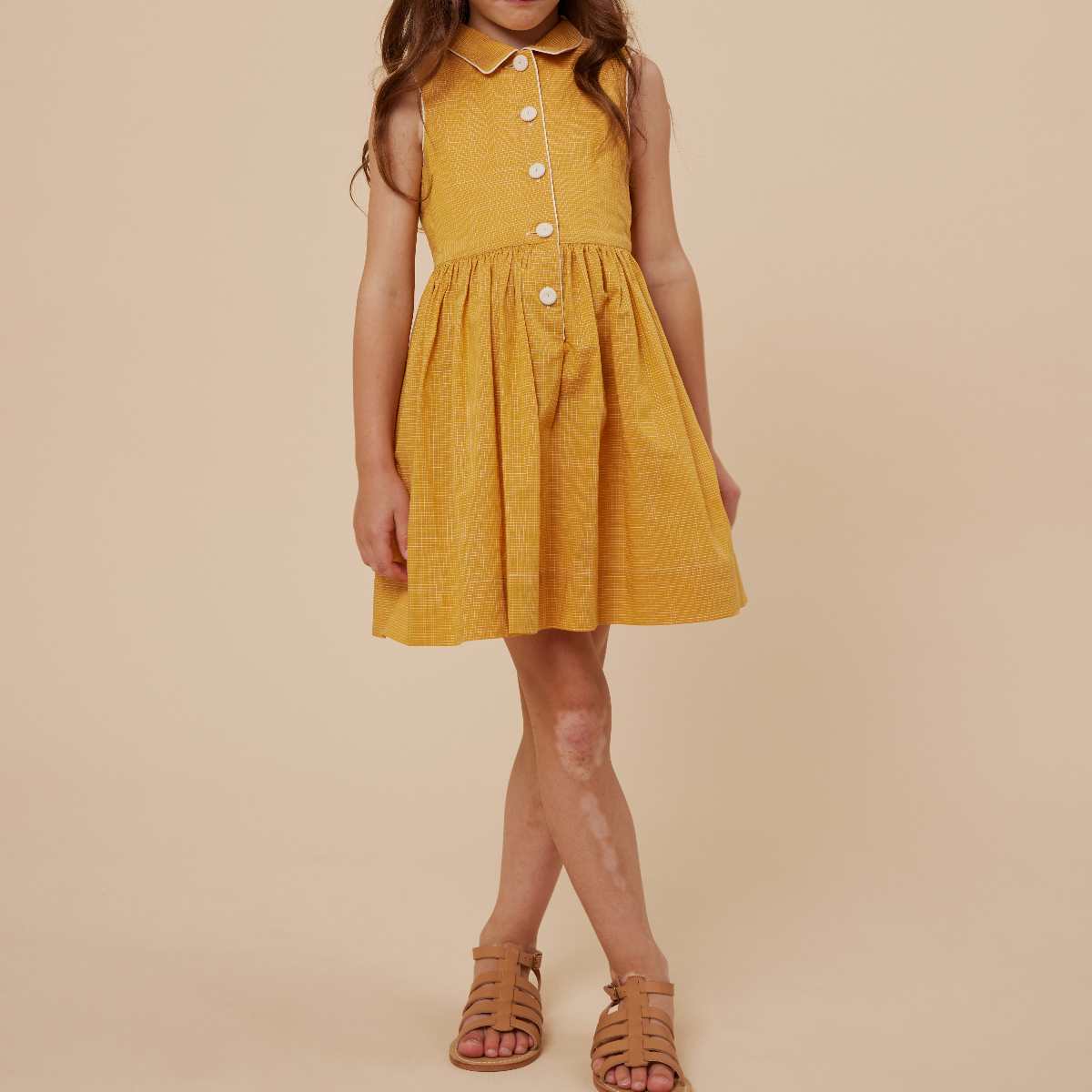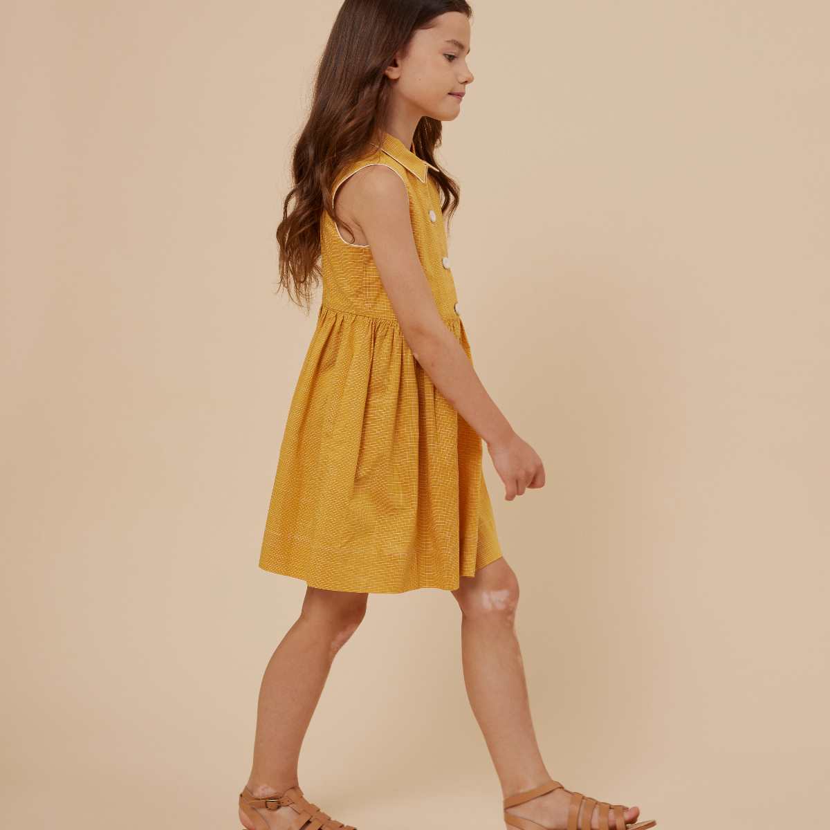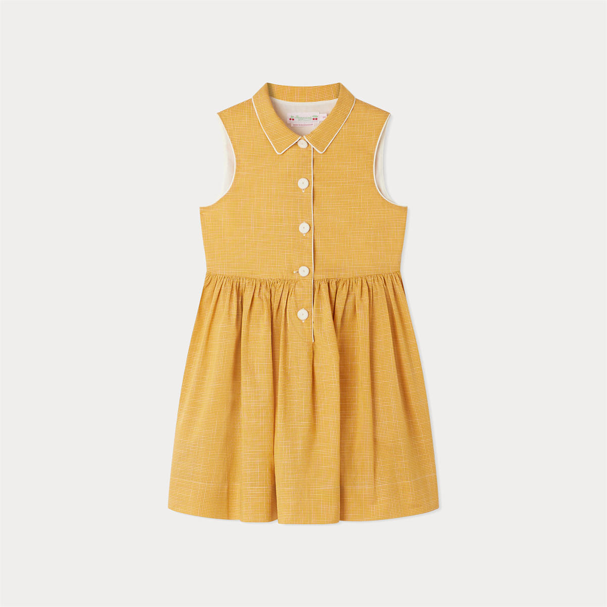 チャーミングなディテールが満載のシャツワンピースは、フロントを5つの大きな布製ボタンが特徴。ノースリーブの襟とアームホールはコントラストの効いたパイピングで仕上げられています。