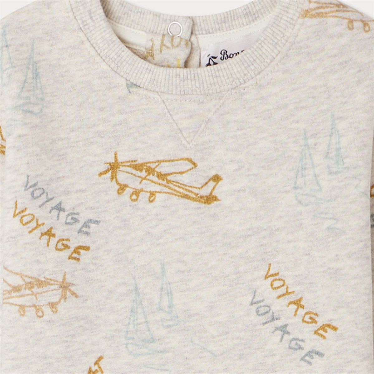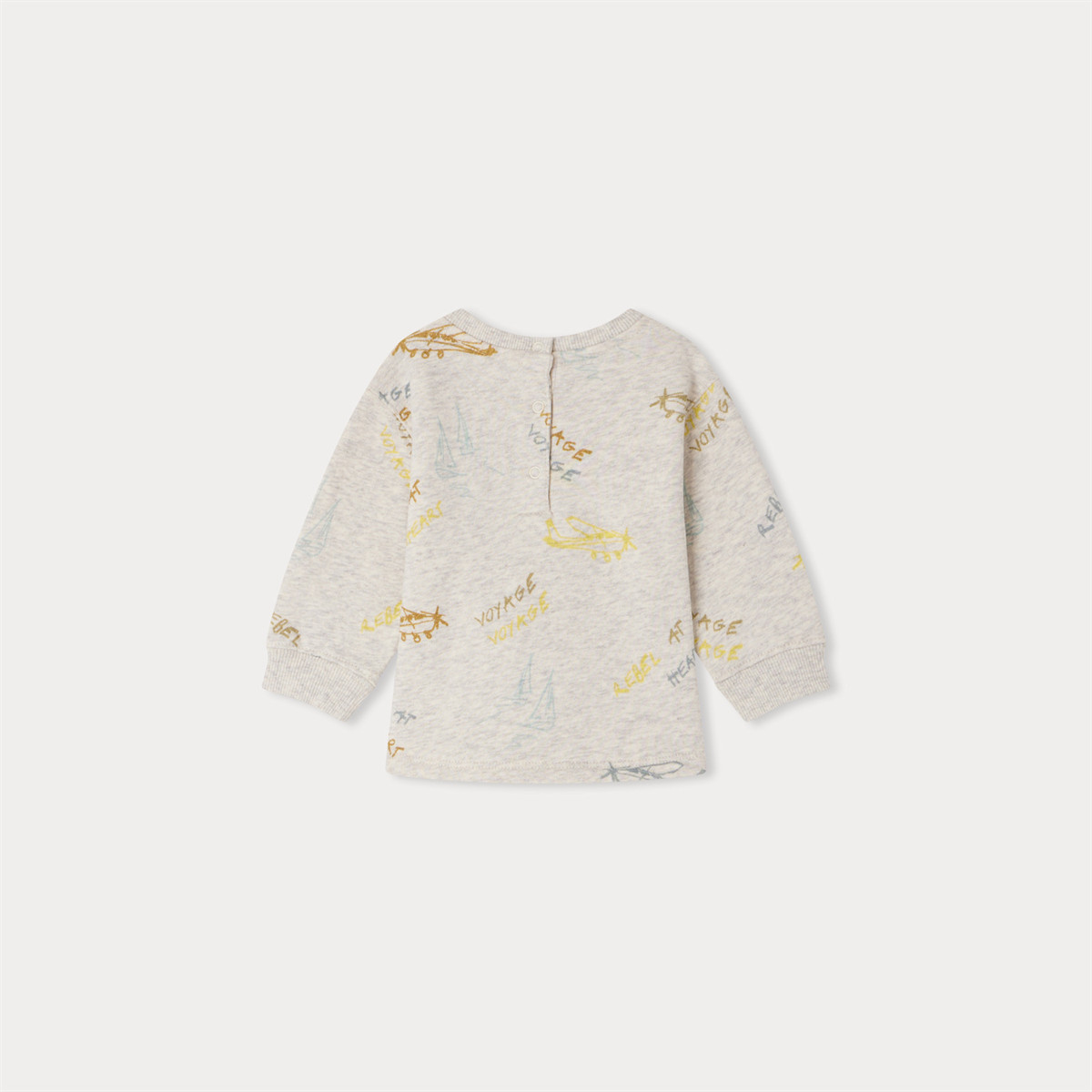 淡く美しい総柄プリントが印象的なベビースウェットシャツ。クルーネックの下にあしらったV字のパネルがオリジナリティをプラスします。