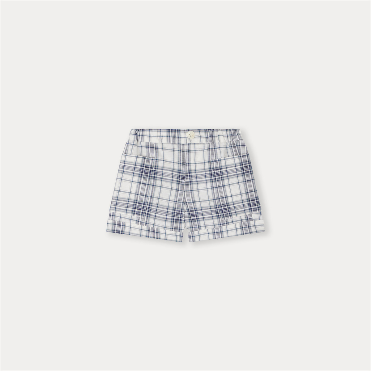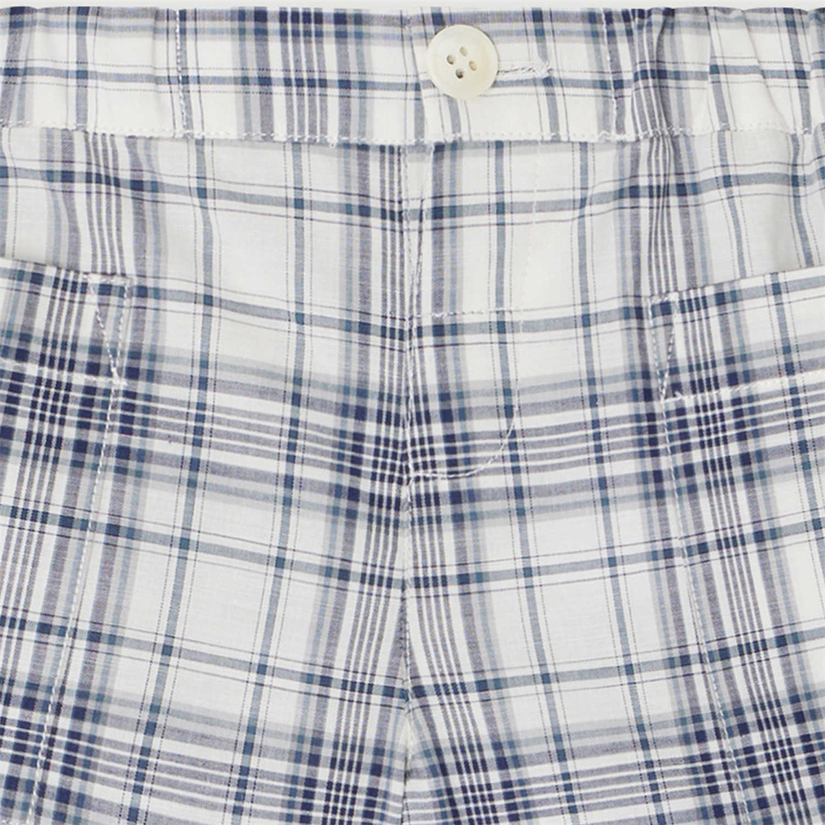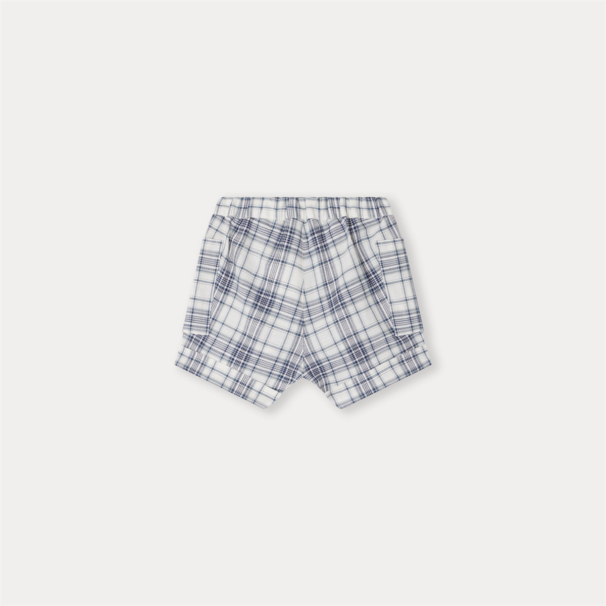 チェック柄のベビー用ショートパンツは、モダンでありながらカジュアルな印象を与える大きなサイドポケットが特徴です。