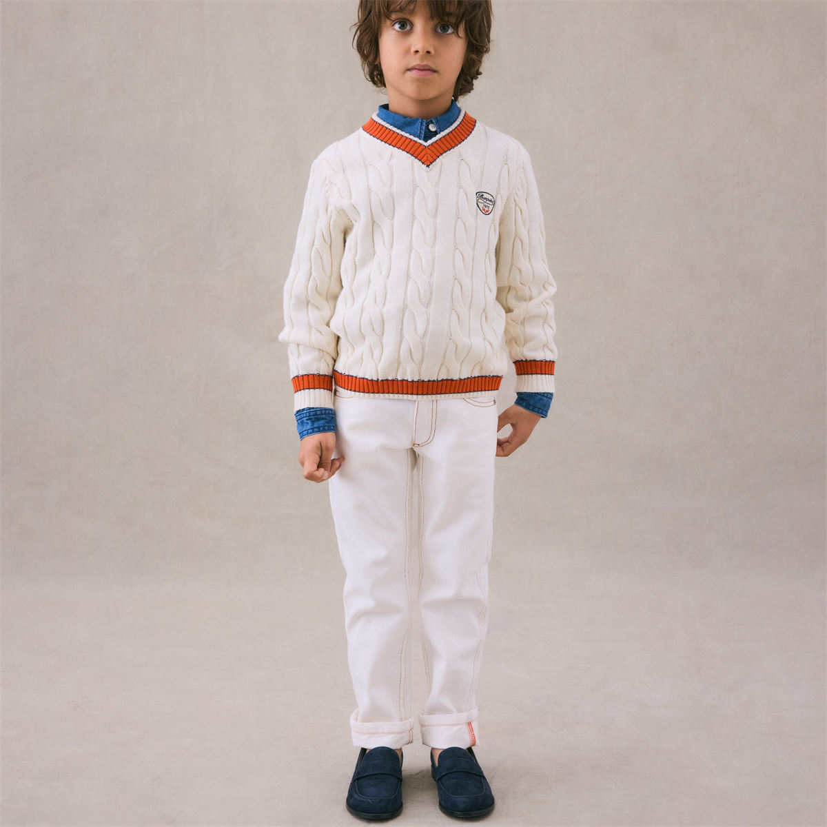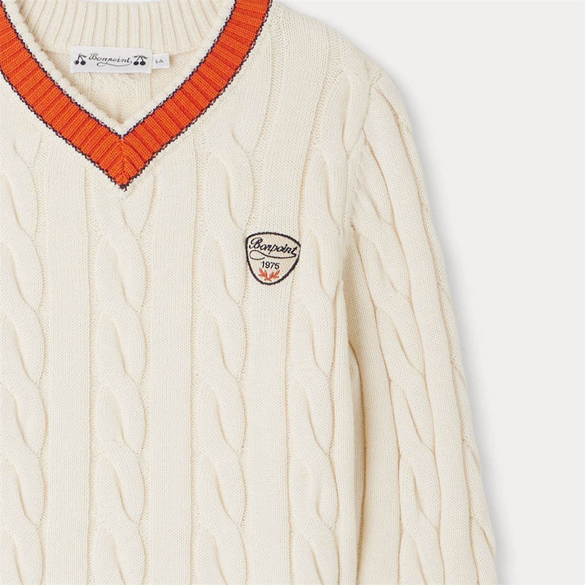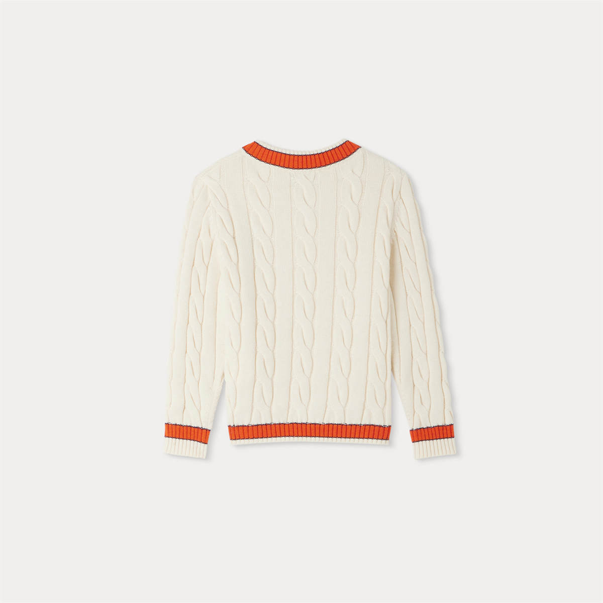商品説明:襟、裾、袖口のコントラストがユニークなプレッピースタイルのセーター。カシミヤ混紡のケーブルニットは特にソフトな着心地です。