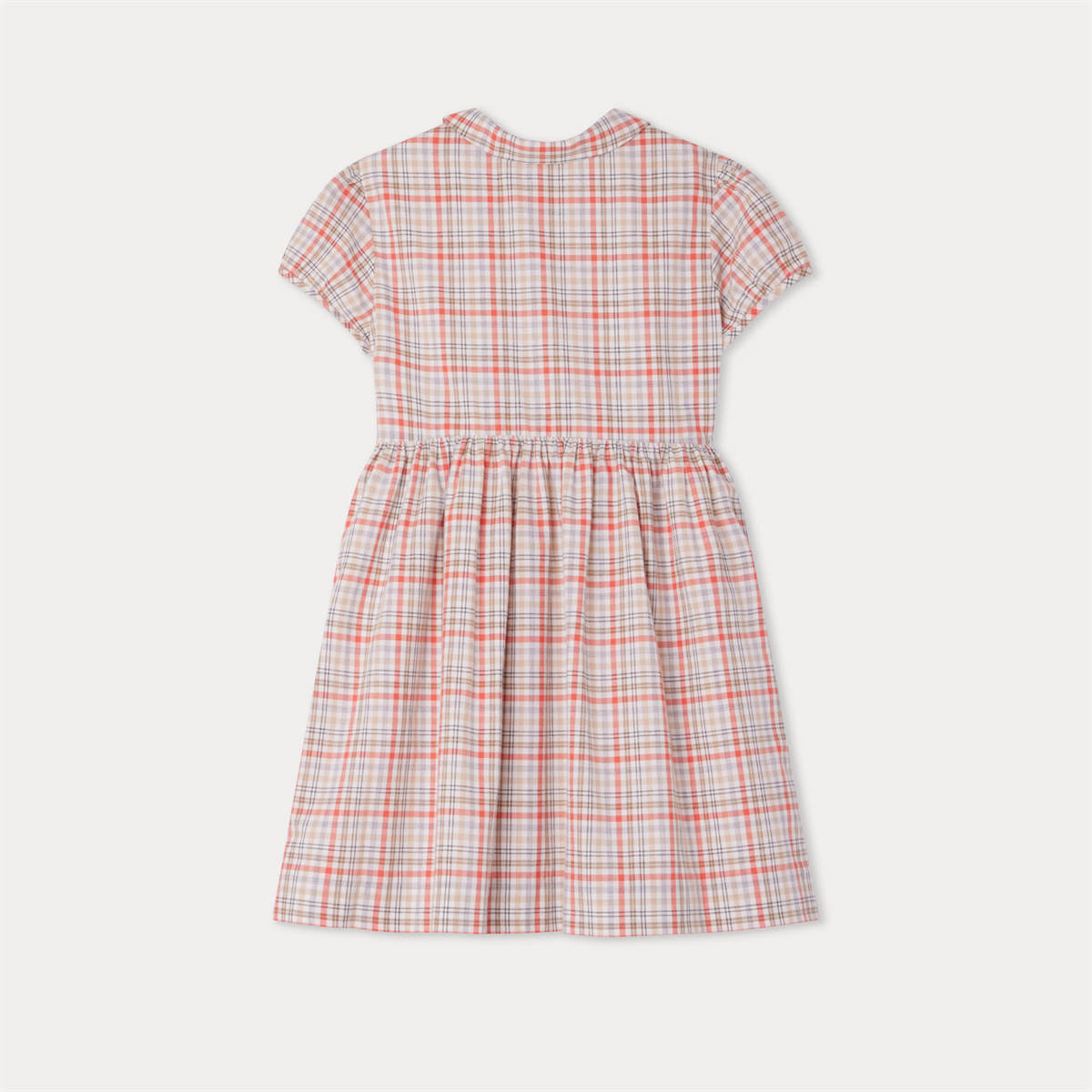 商品説明:チェックのモチーフとプリーツ入りのウエストラインがポイントのドレス。エレガントなバルーンスリーブが特徴的。胸元にはチェリーの刺繍が施されています。