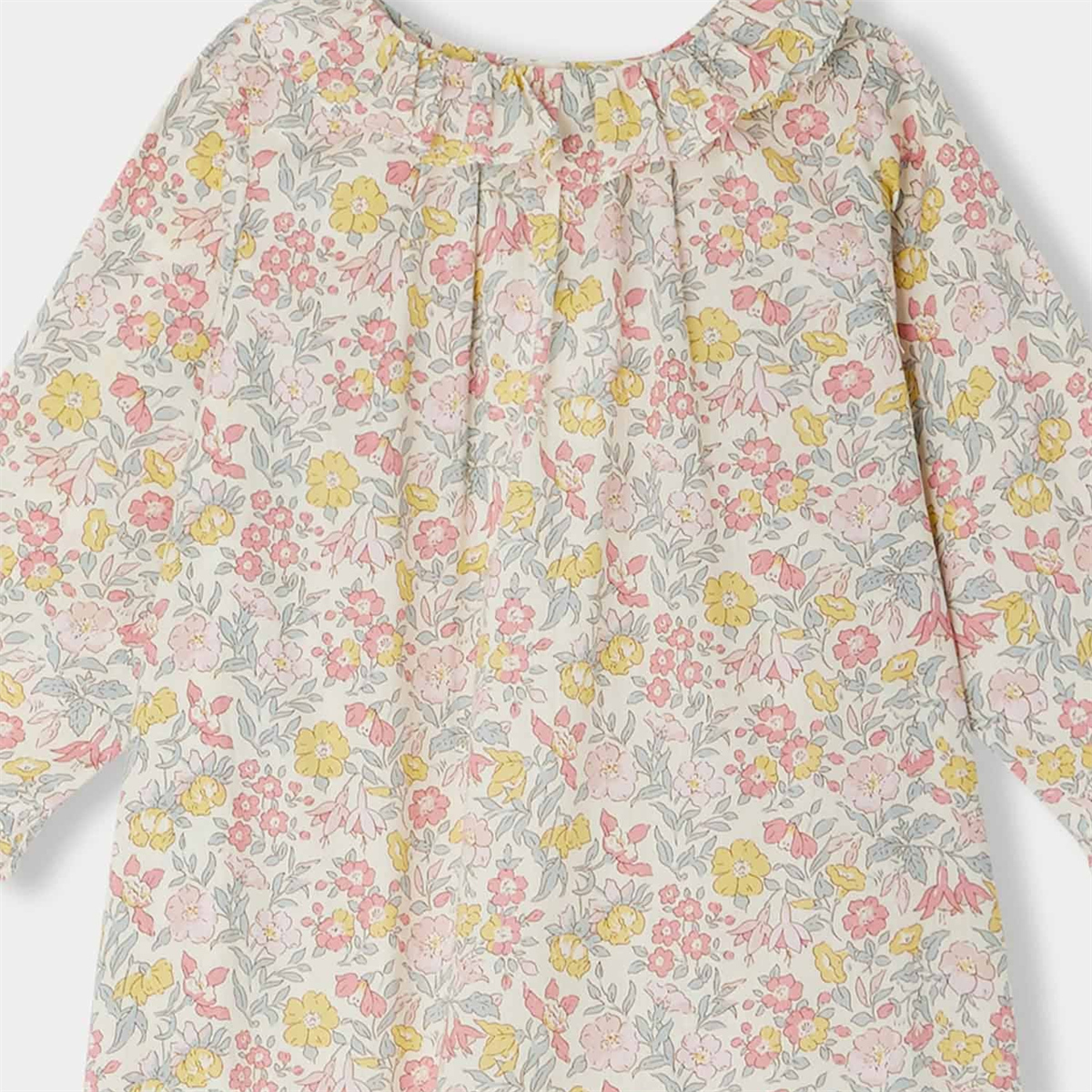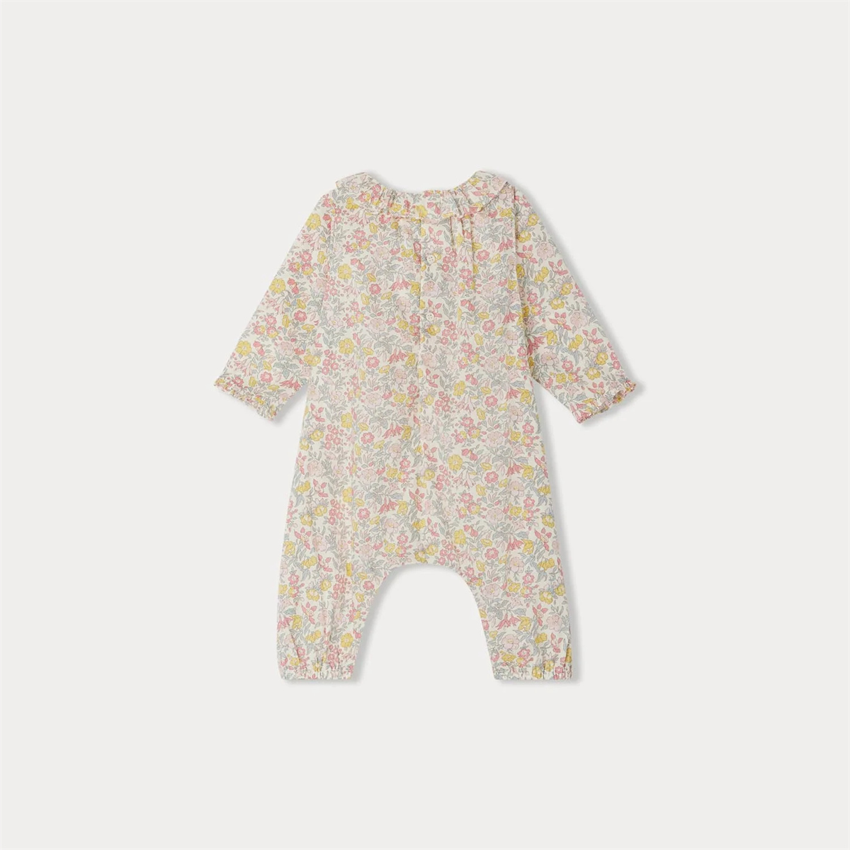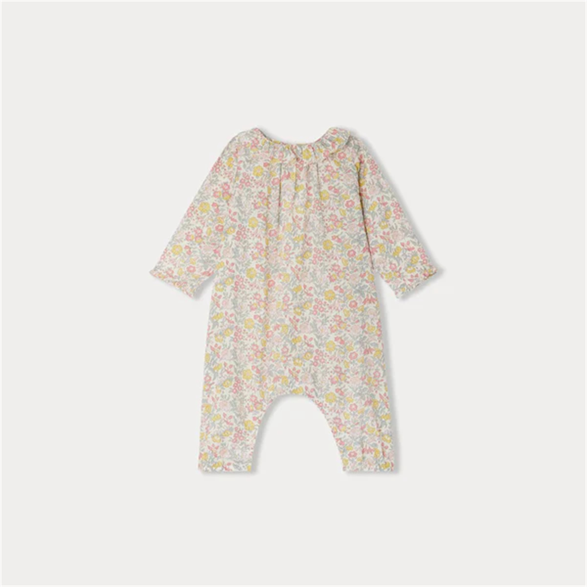商品説明:フリルとギャザーのディテールが魅力的なリバティのコンビネゾン。背中のボタン、前立てと股下のスナップボタンで、着脱も簡単です。
