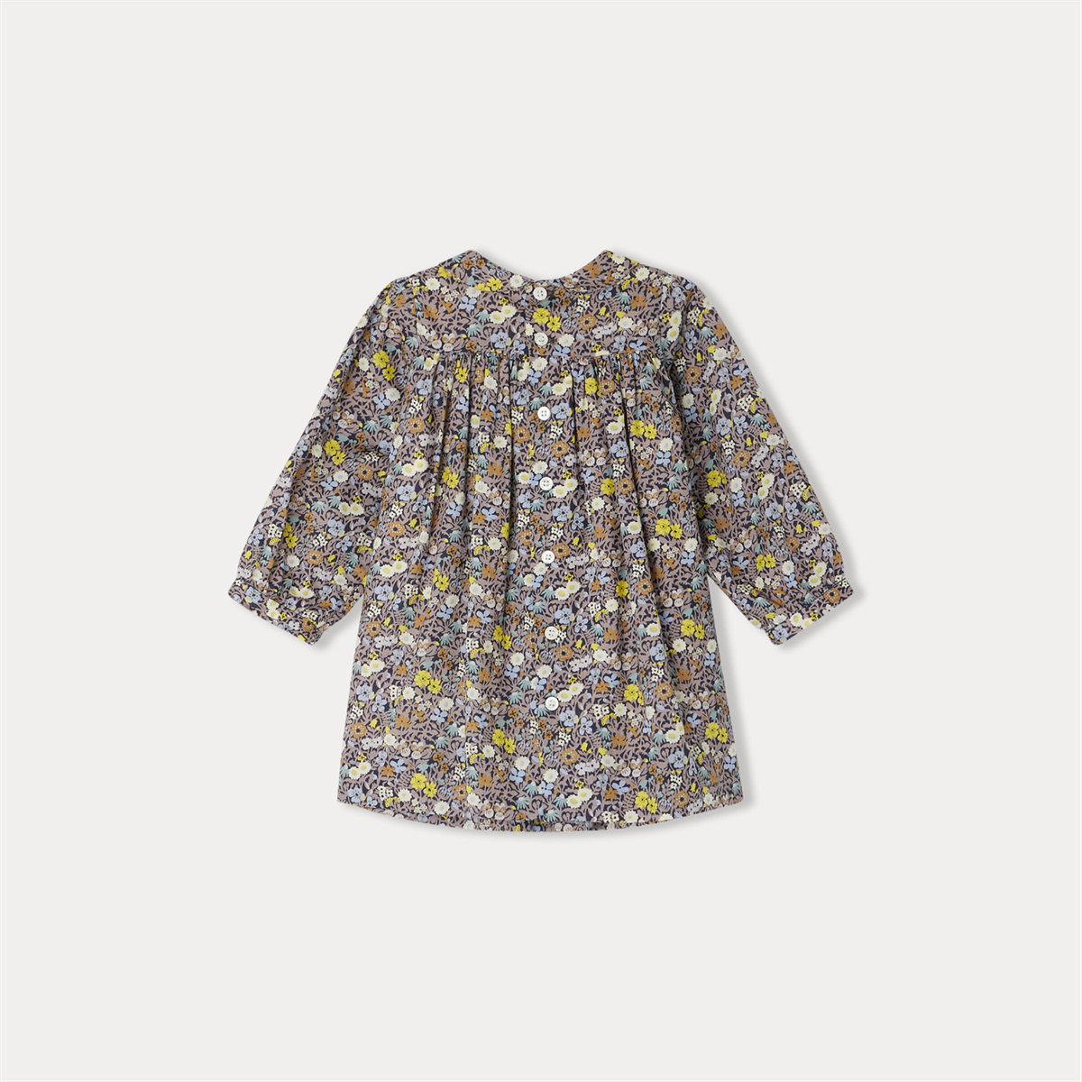 商品説明:オーガニックコットンを使用したベビードレス。リバティ素材を使用し、胸元には手刺繍のスモッキングが施されています。