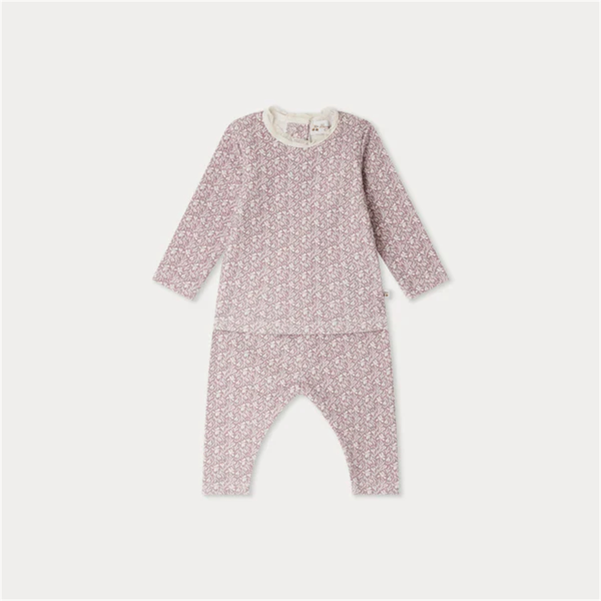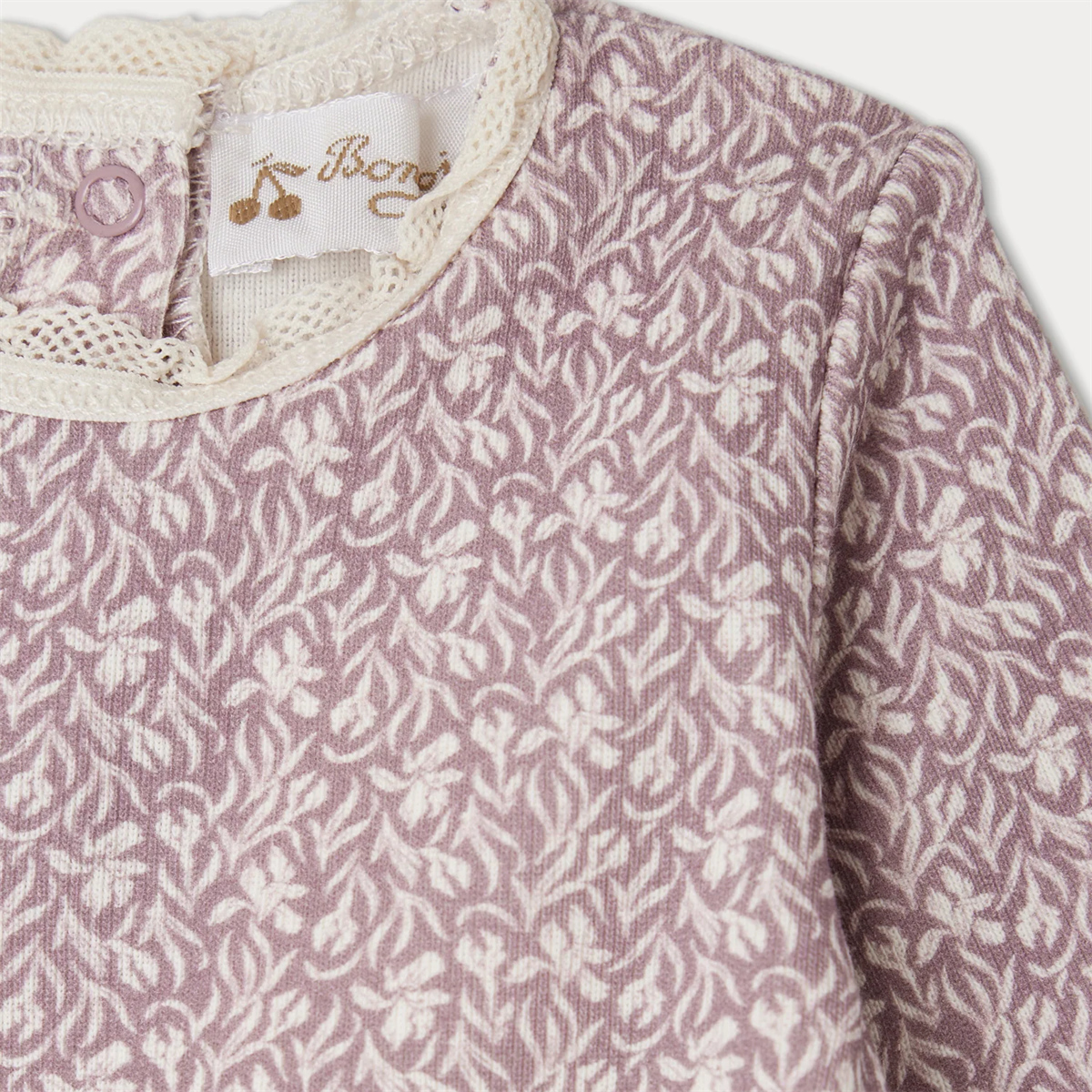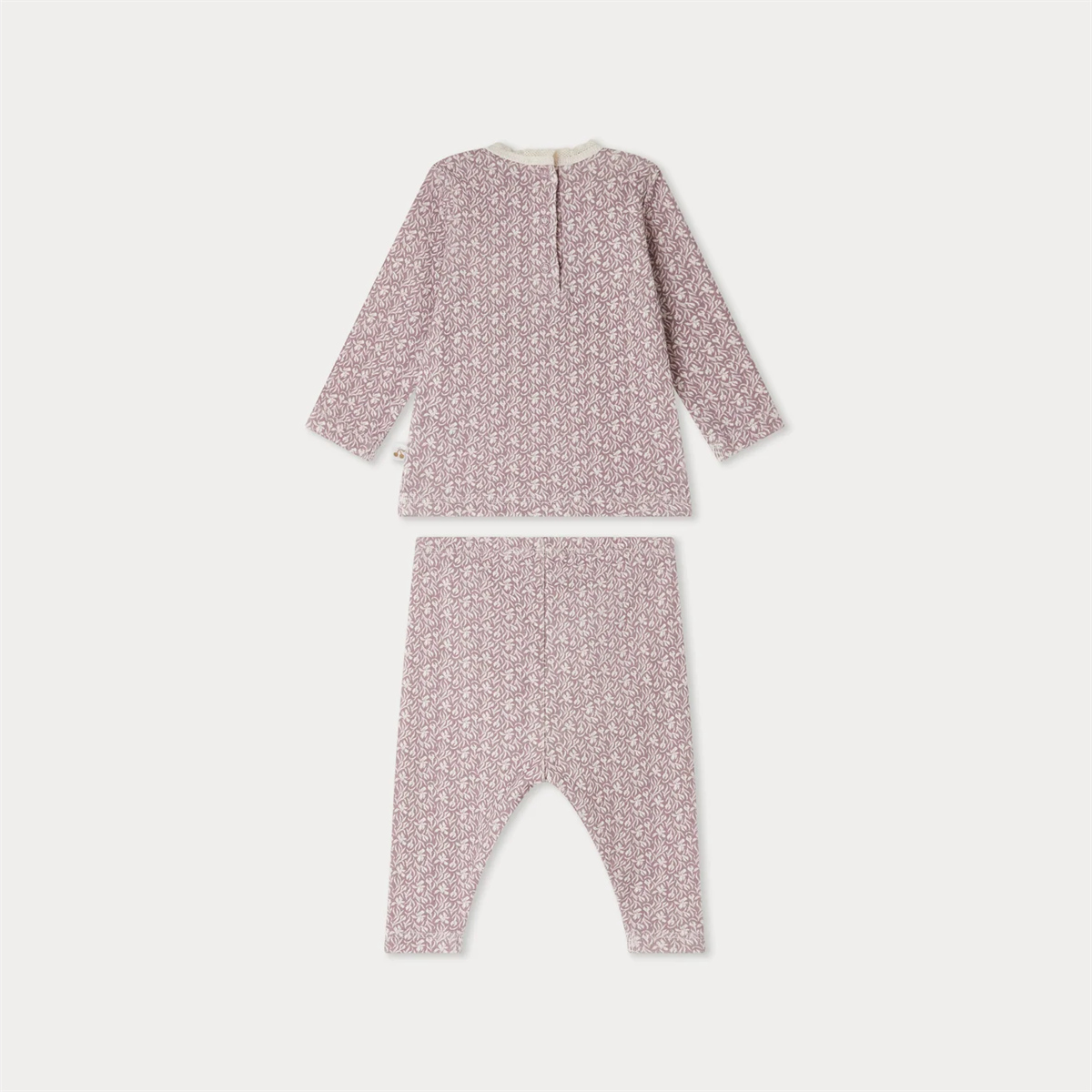 商品説明:チャーミングなアイリスプリントとレースで縁取られた襟が特徴のベビーパジャマ。背中のボタンで留めるので、着脱も簡単です。