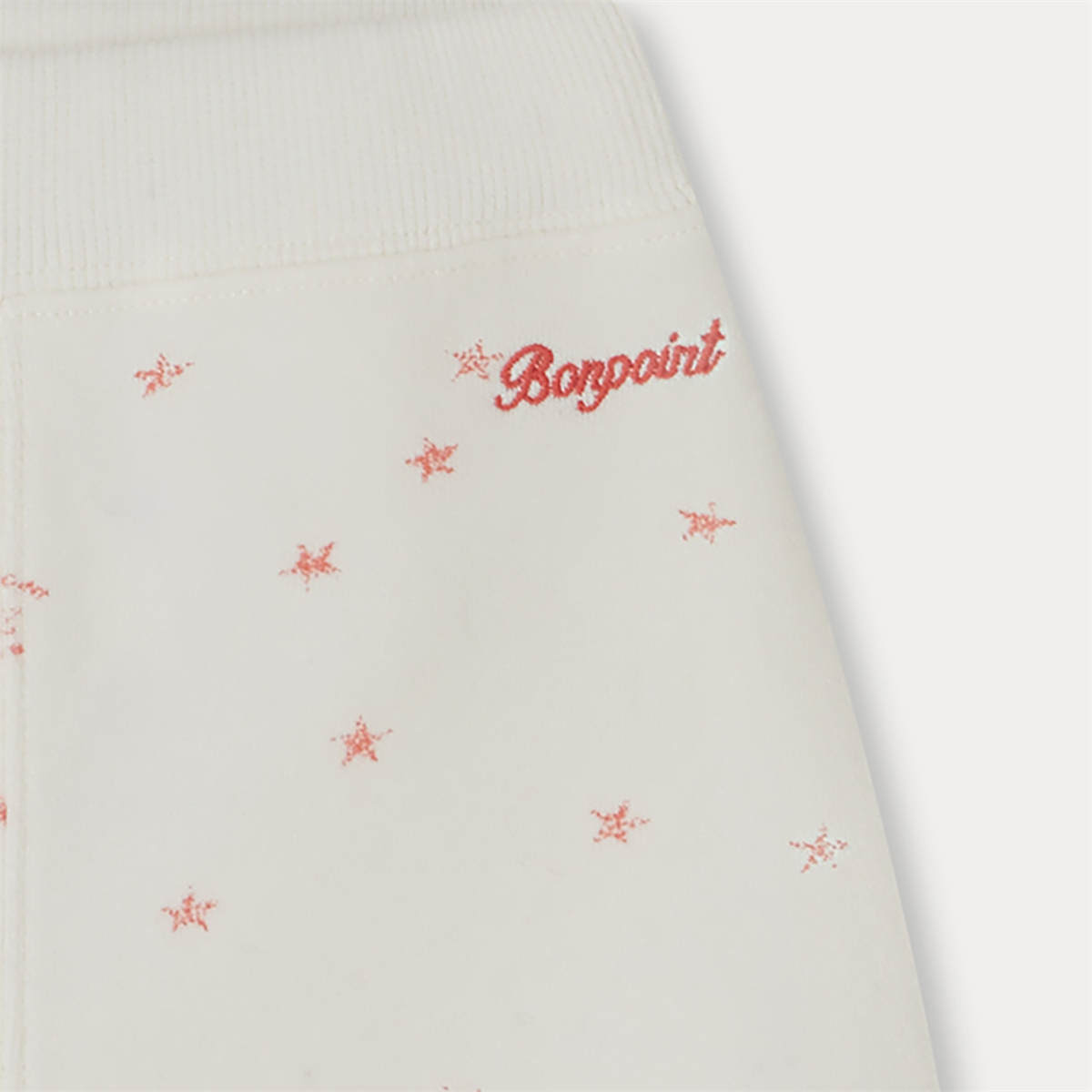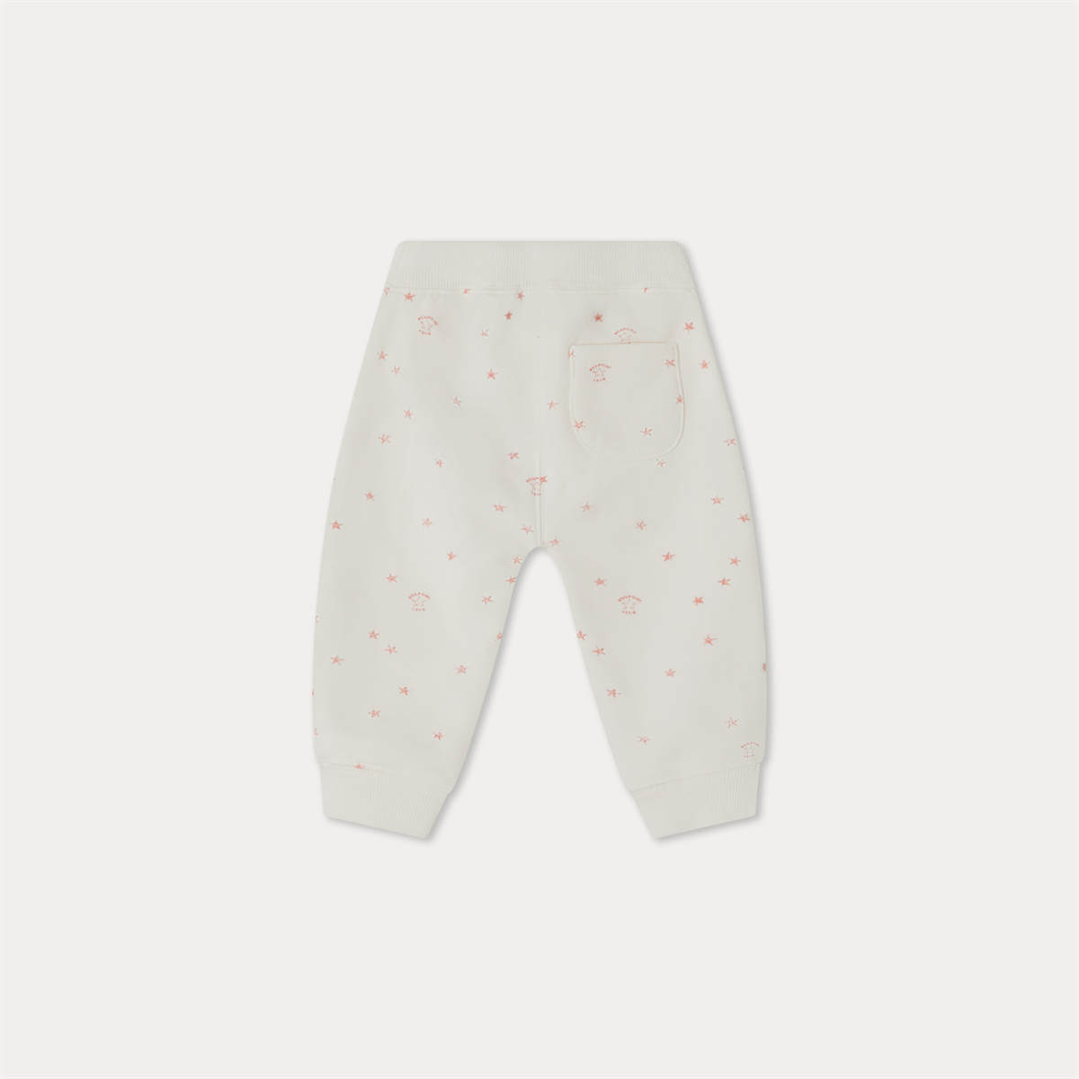 肌触りのよいオーガニックコットン・フリースを使用した、ベビー用スウェットパンツ。星の総柄プリントとメゾンのロゴが特徴です。