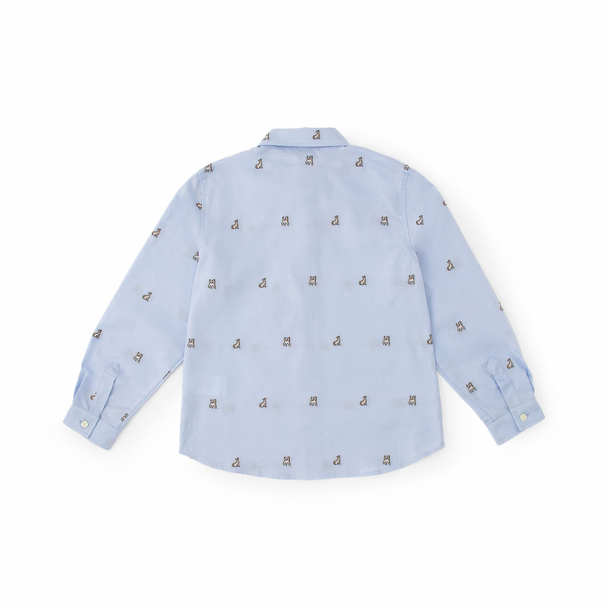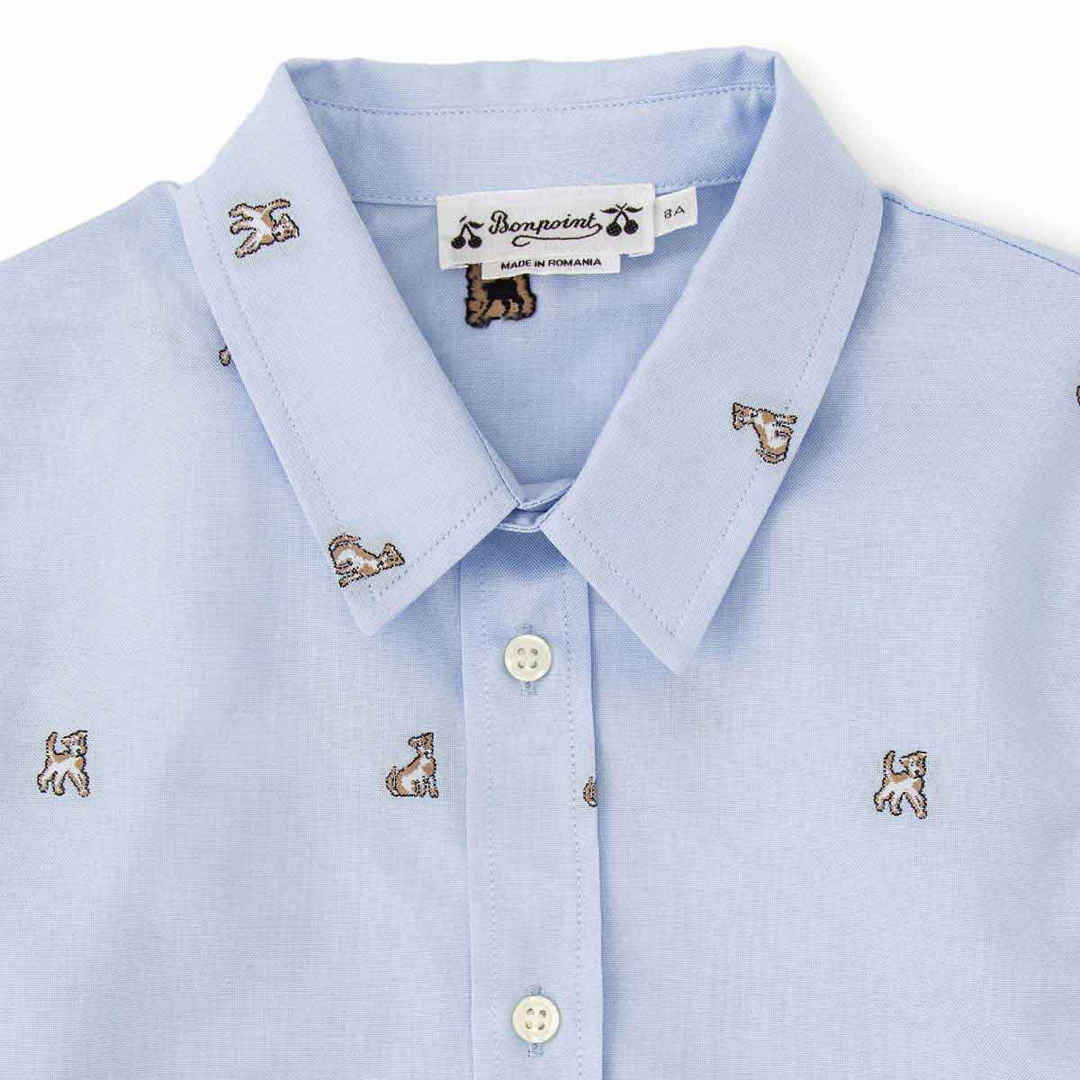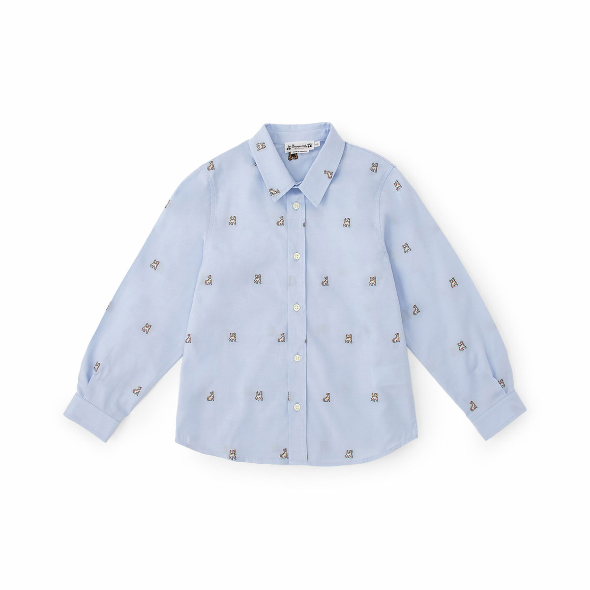 ブルーが爽やかなシャツに愛らしい犬を散りばめた一枚。一枚ではもちろん、羽織りとしても活躍。冬はセーターやカーディガンとのレイヤードをお楽しみください。