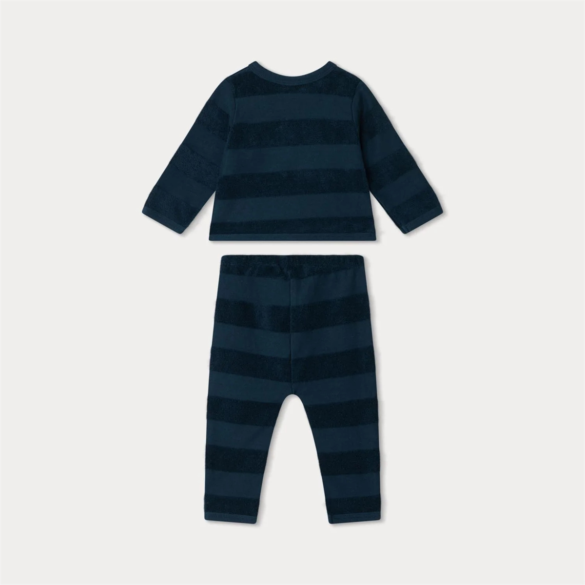 2色の幅広のボーダーが特徴の、タオル地のアンサンブル。トップスは同系色のボタンで留めるクロスオーバータイプ。