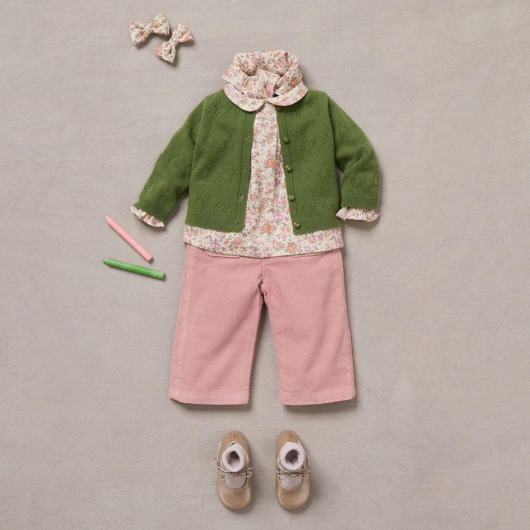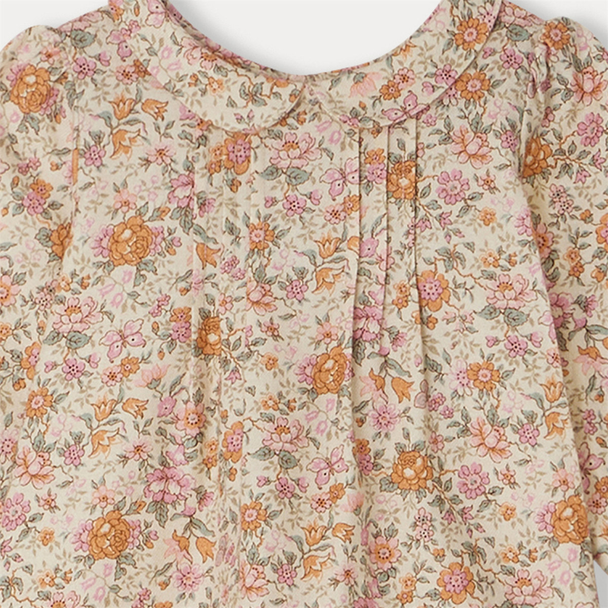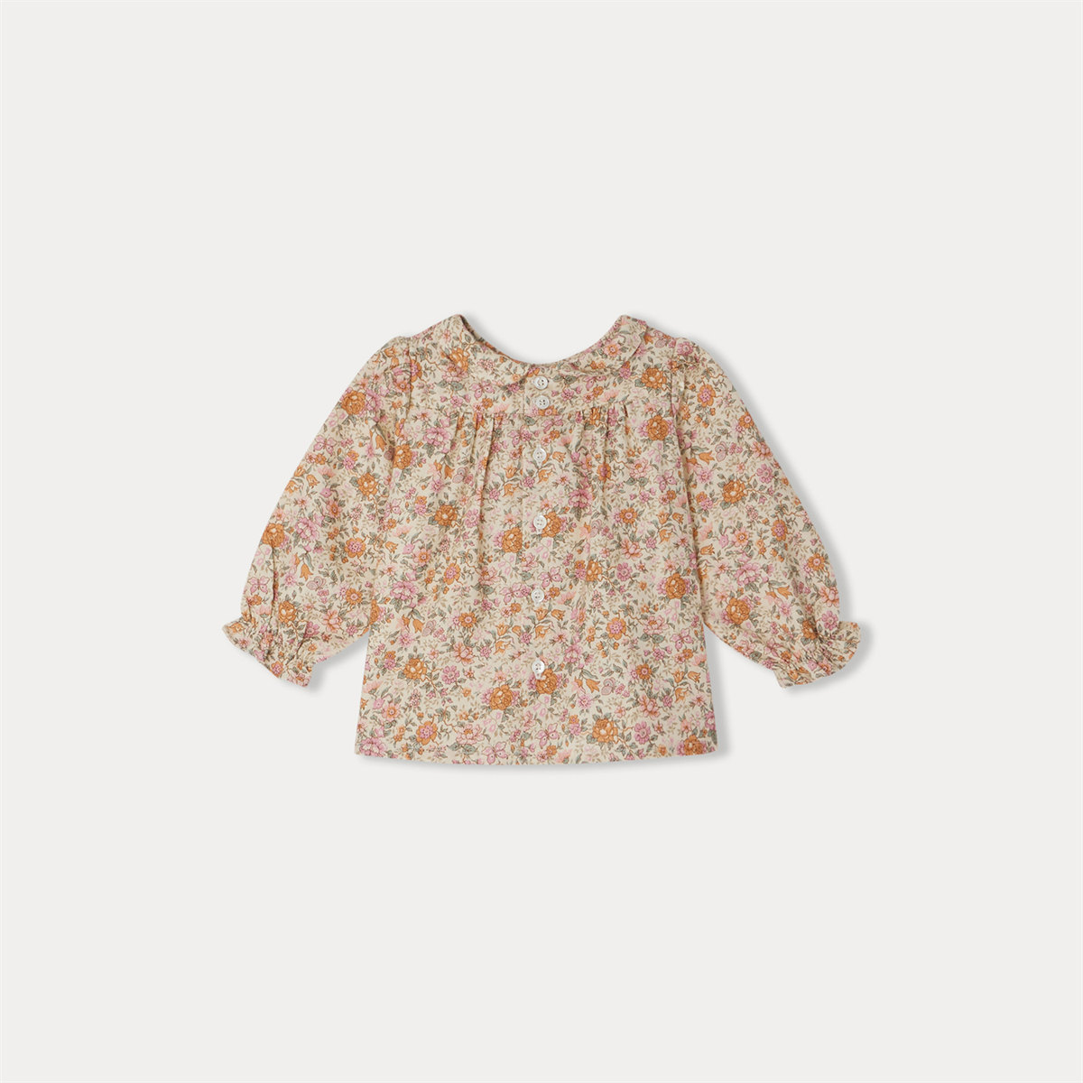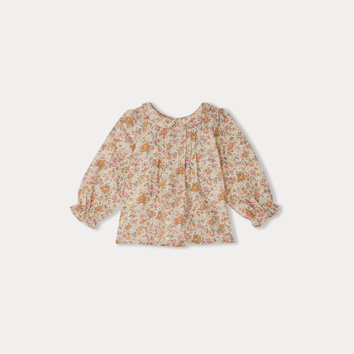 可憐な小花がプリントされたリバティ生地のベビーブラウス。ピーターパンカラーと前身頃のフラットプリーツがレトロな魅力を添えています。