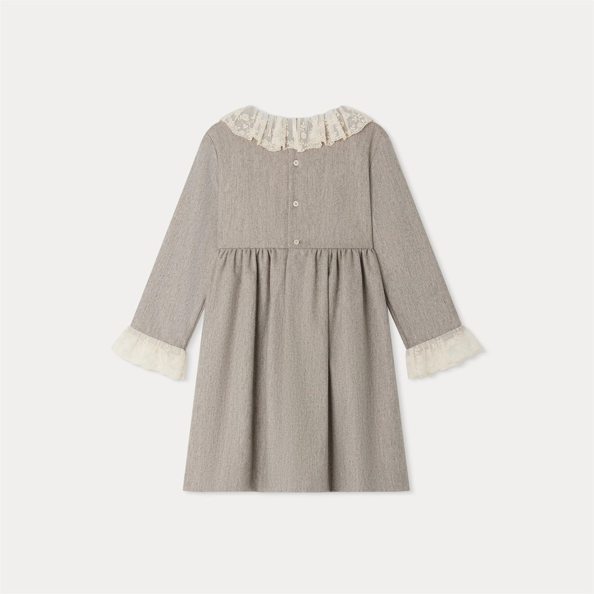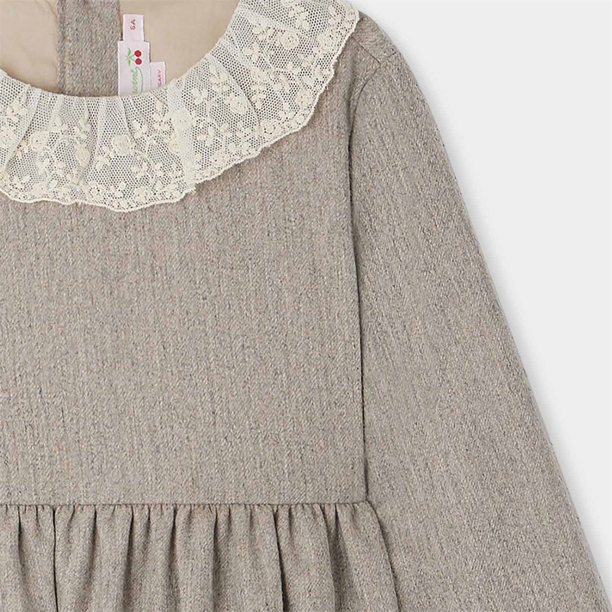 フリル付きの襟と刺繍入りのチュールカフスがレトロな魅力を放つドレス。コットンポプリンの裏地付きで着心地も抜群。
