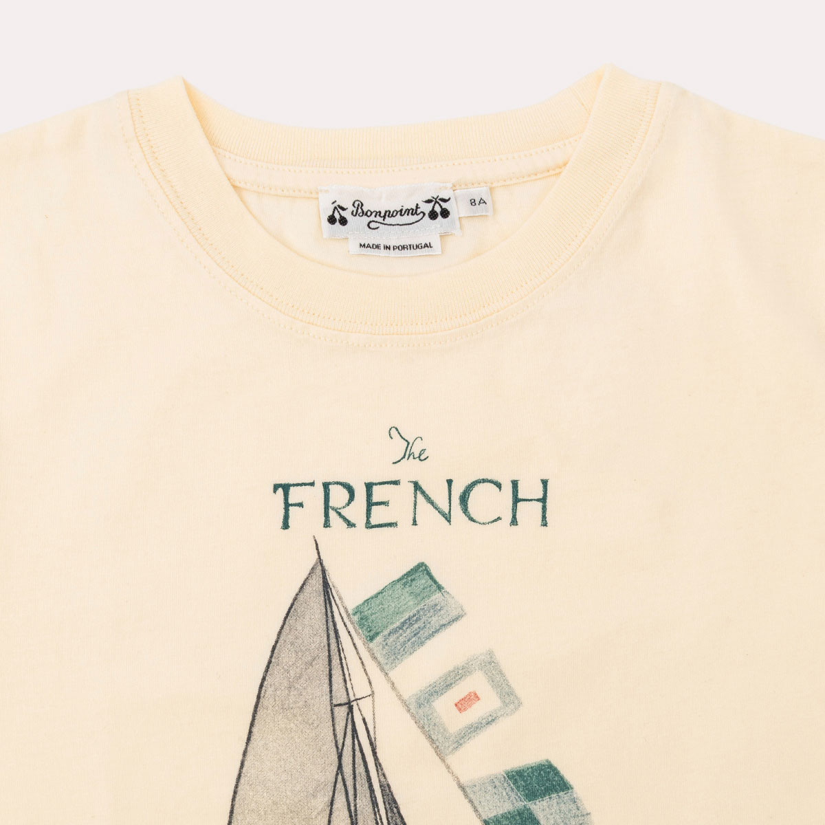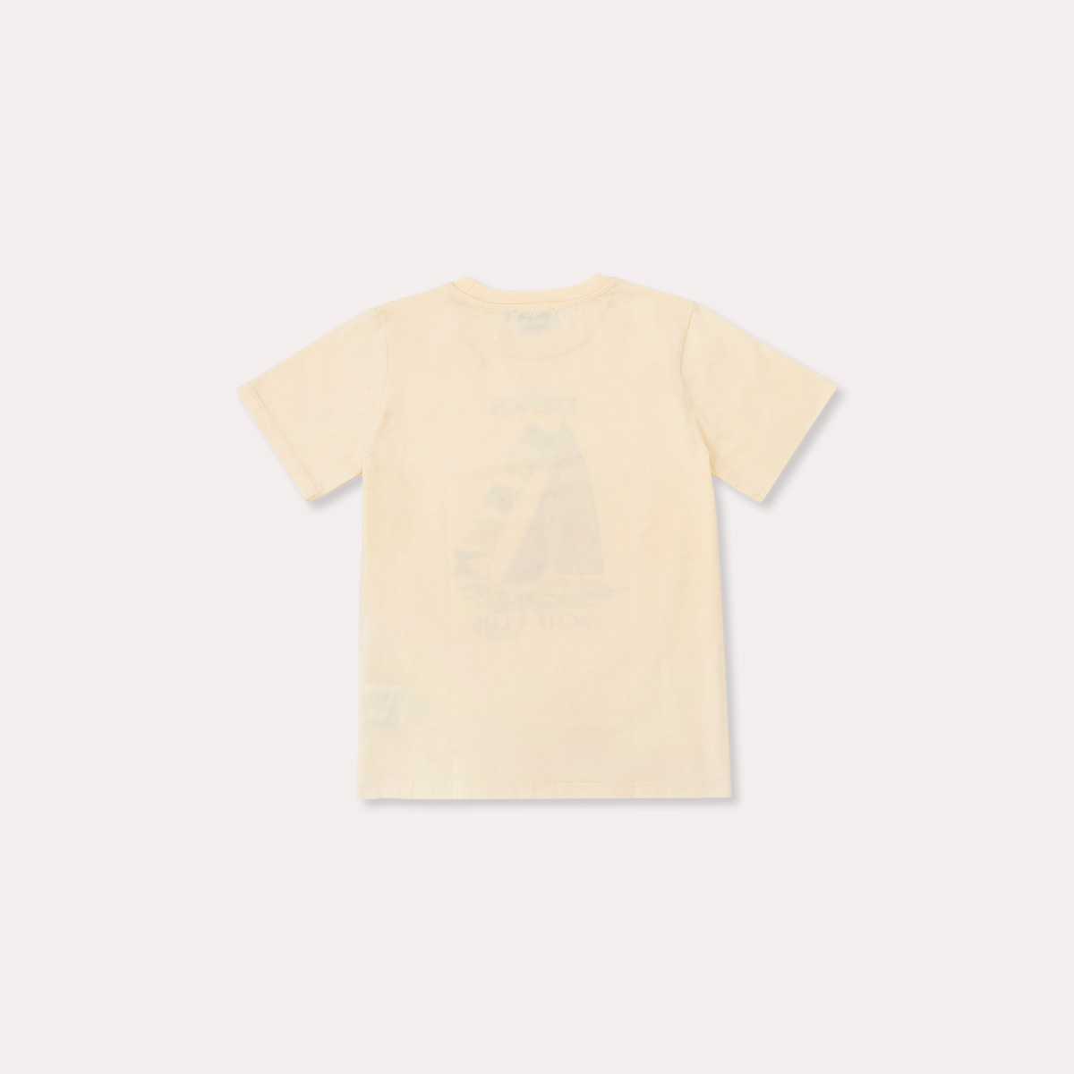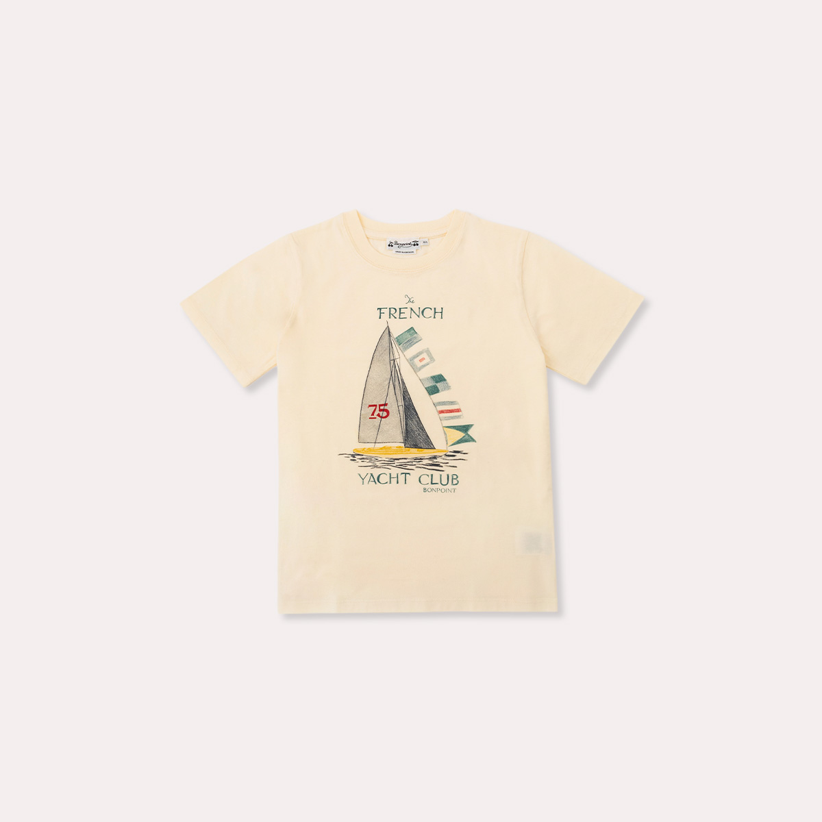 ティーボーTシャツは、前面に手描きのようなカラフルなヨット クラブ プリントが施されているため、オリジナリティのある1着です。このデザインはオーガニックコットンで作られています。認定オーガニックコットン。クルーネック。半袖ドロップショルダーでゆったりとした合わせがおすすめです。