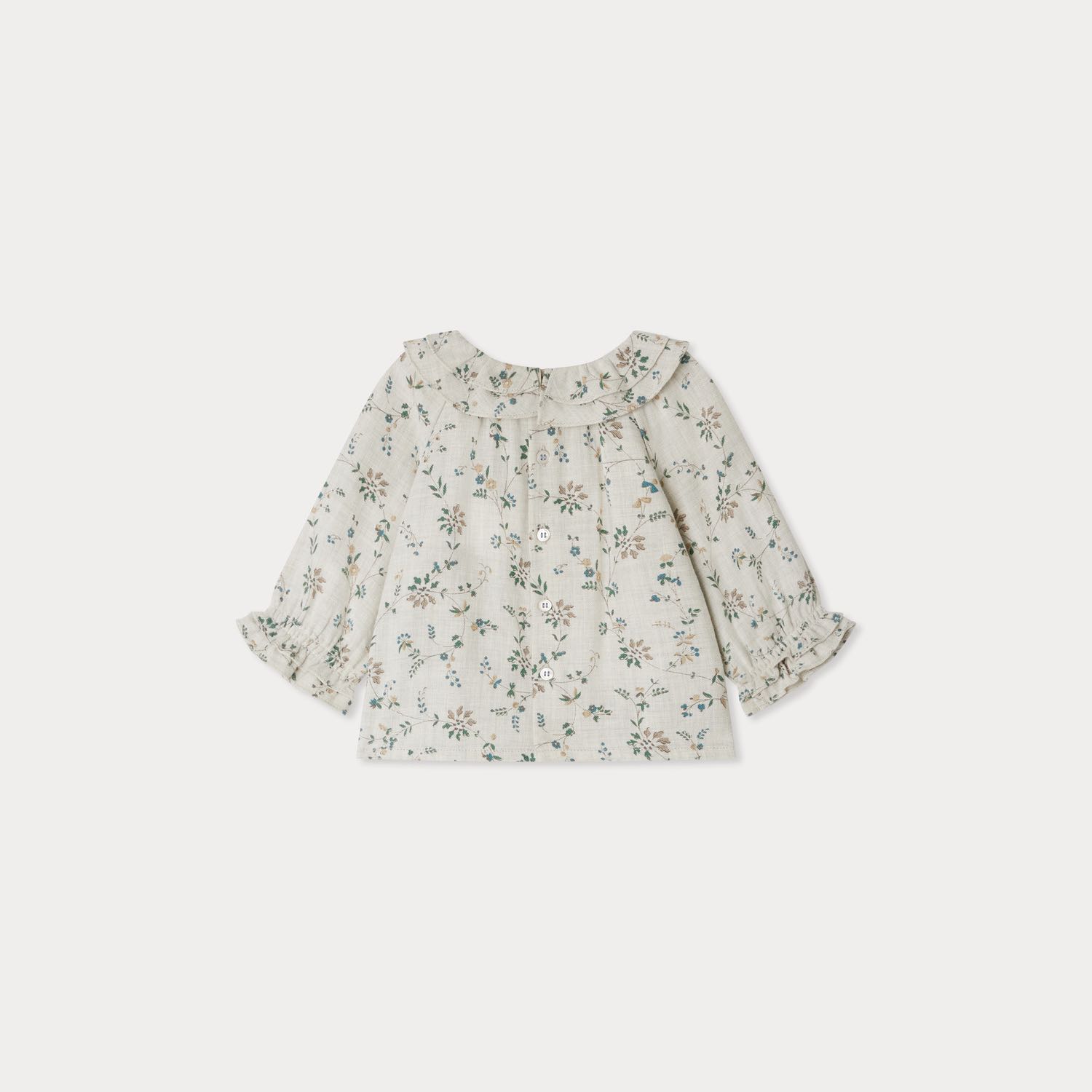 ロマンティックなボタニカルモチーフのプリントが目を引くベビーブラウス。ラウンドネックの下には二重のフリルカラーがあしらわれ、袖口にも同様のフリルを重ねることで、ふんわりとした華やかさを演出しています。背面には繊細な貝ボタンが並び、着替えもスムーズです。