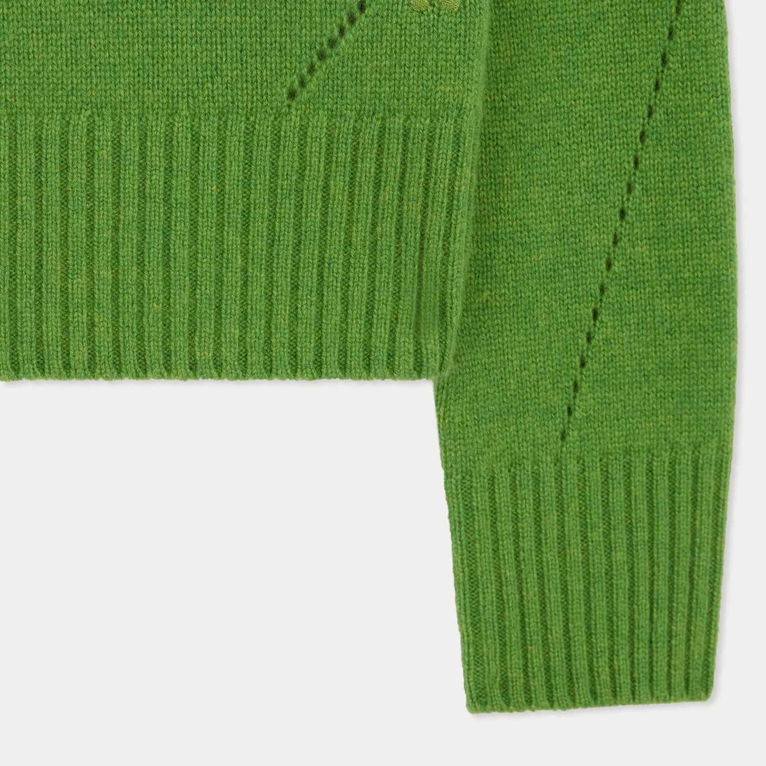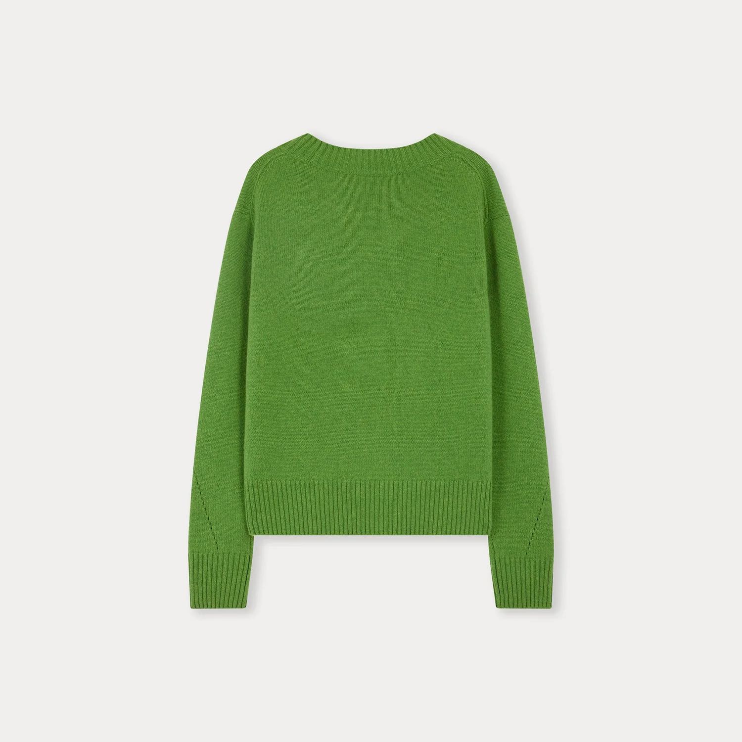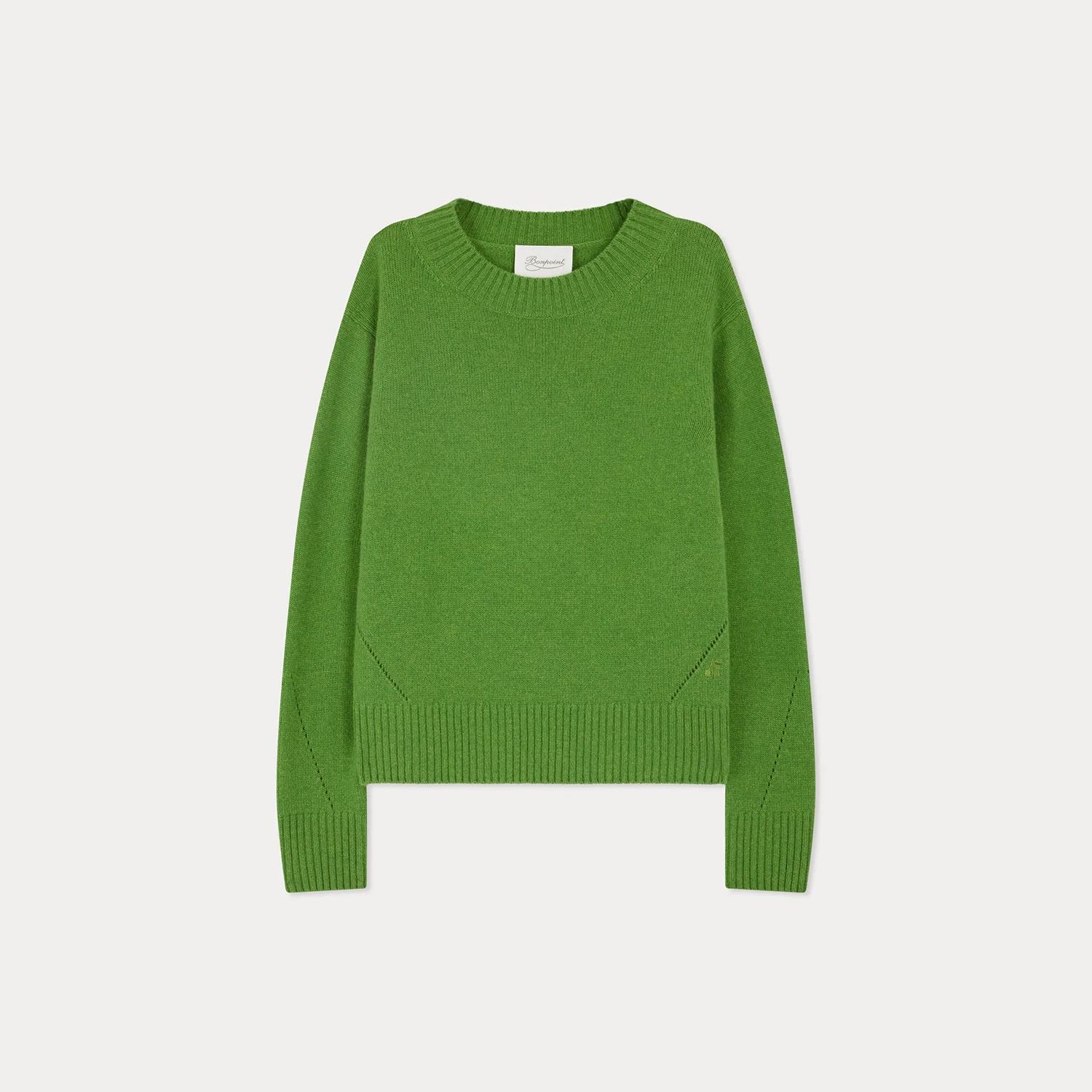 動物福祉に配慮した認証カシミヤを使用し、袖口と裾に透かし編みのディテールをあしらっています。