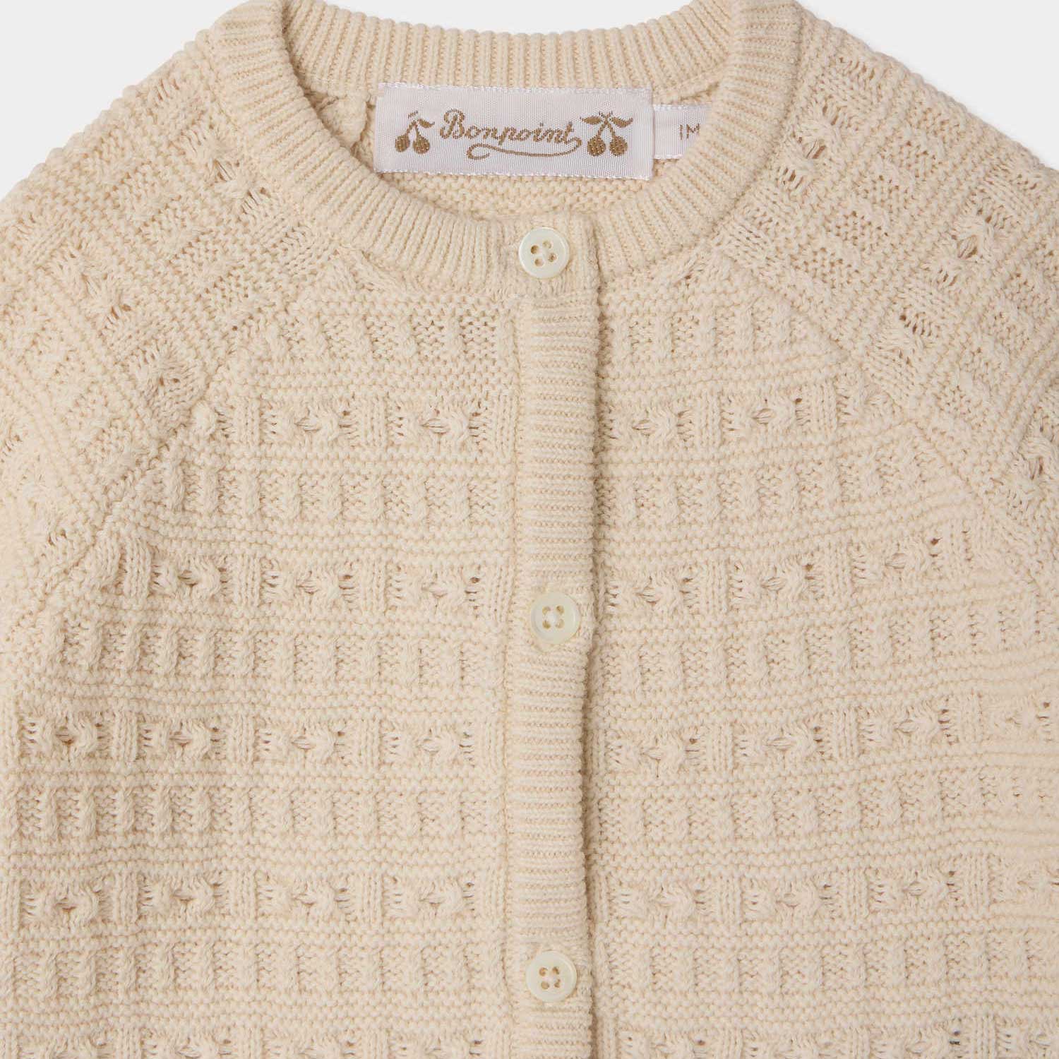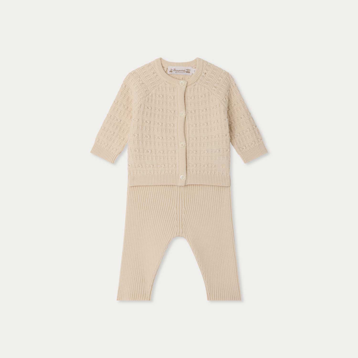 クルーネックのカーディガンに、愛らしく遊び心のあるニットが映えるセット。裾には、メゾンを象徴するチェリーモチーフの刺繍をあしらっています。新生児にも適したアイテムです。--・無地のオーガニックコットン-・ゴムウエストパンツ-・ロングラグランスリーブ