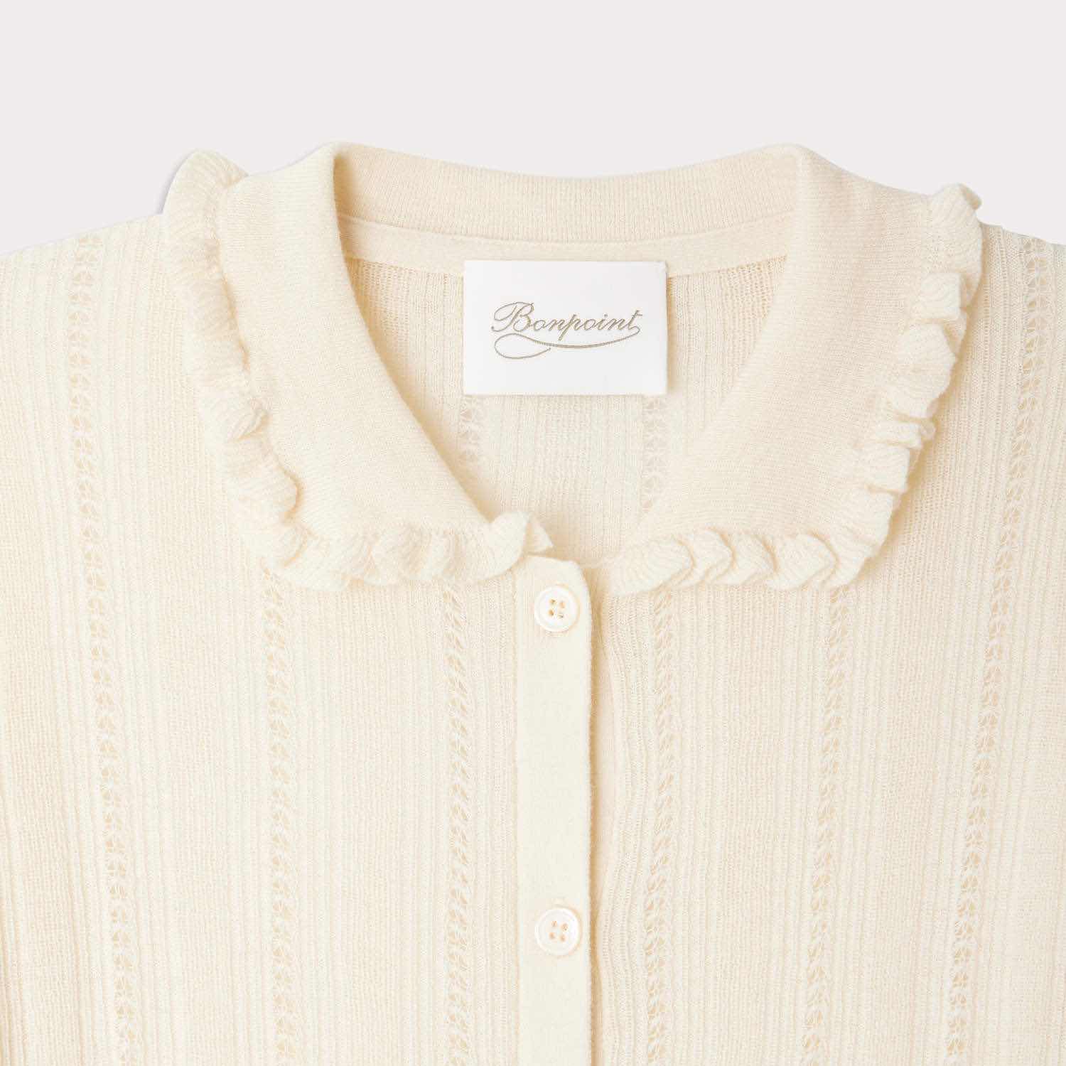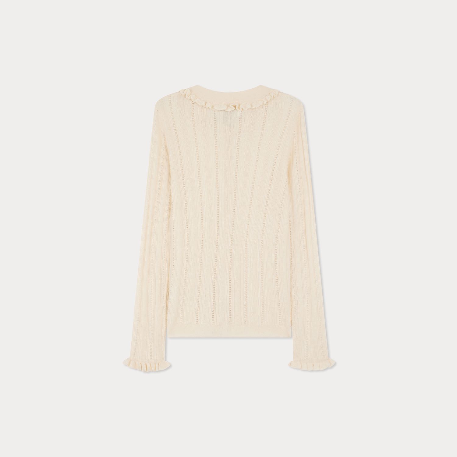 襟元と袖口のラッフルがレトロな雰囲気を漂わせ、透かし編みのニット柄が個性を引き立てます。