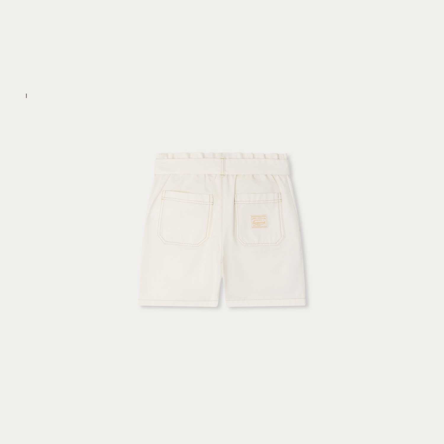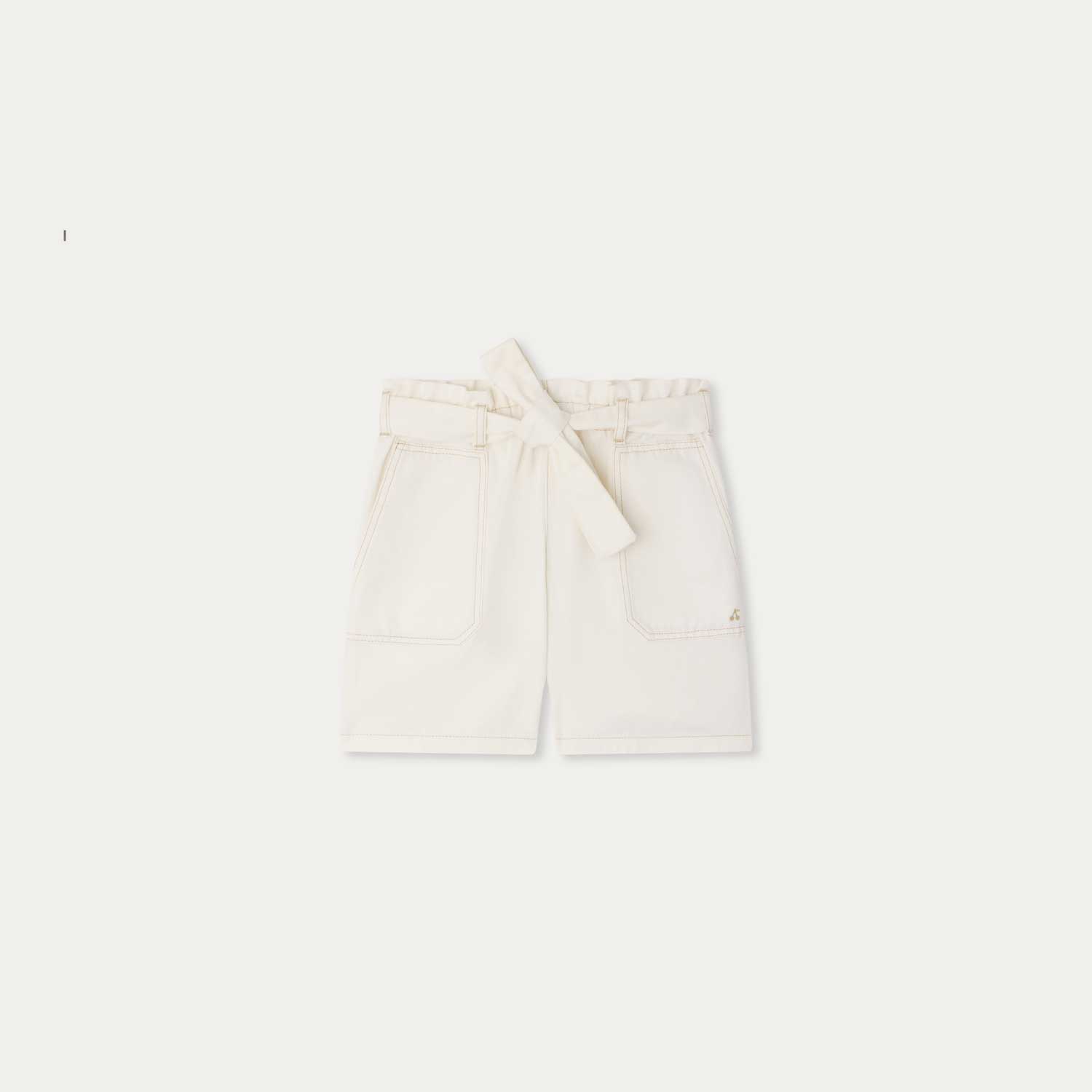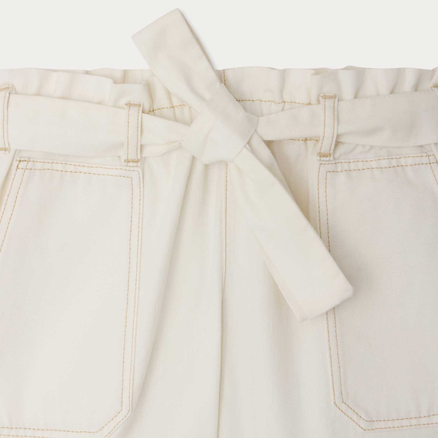 4つのポケットとゴムウエスト、結べるベルトを備えたショートパンツ。コントラストの効いたステッチを施したストレートレッグシルエットで、ガーメントダイ加工を施しています。--・軽やかなオーガニックコットンデニム-・チェリー刺繍-・バックラベル付き