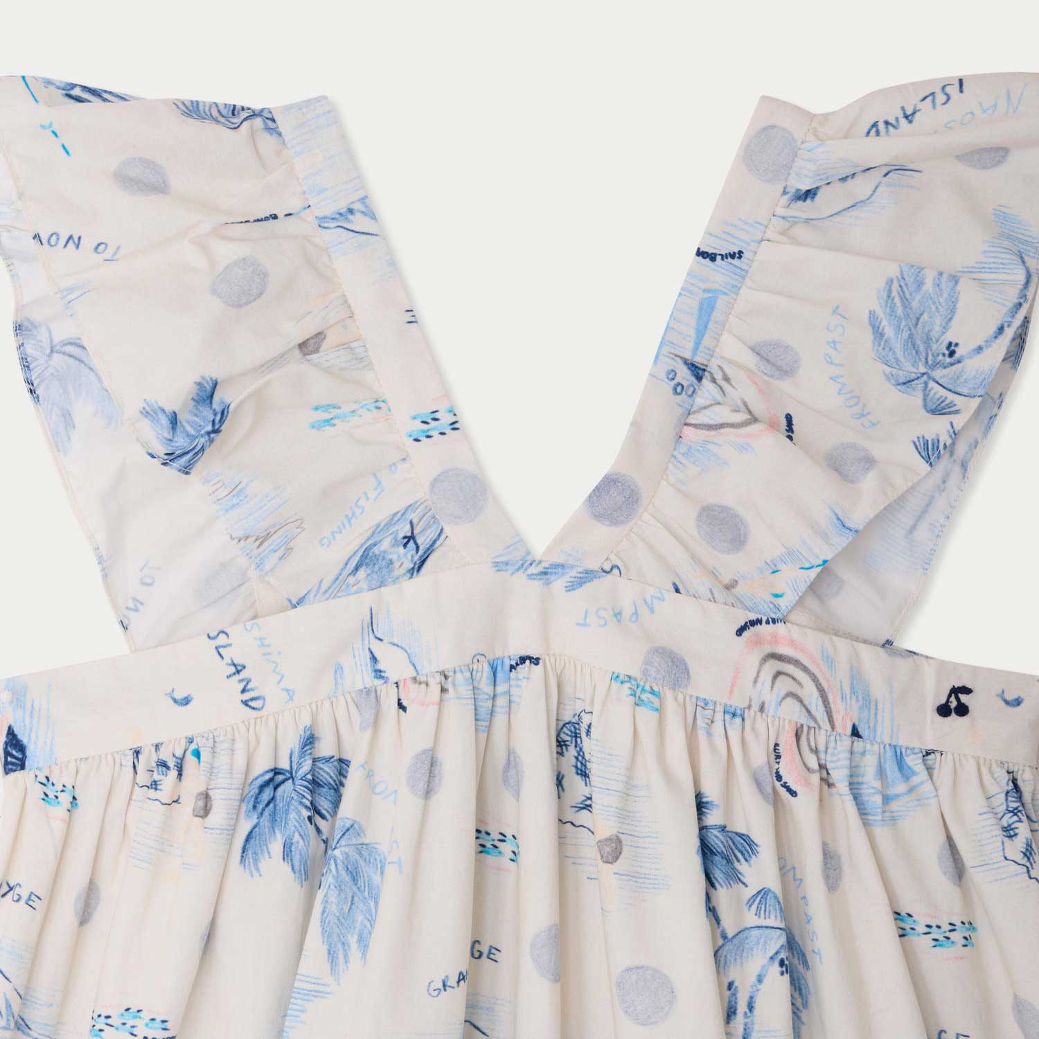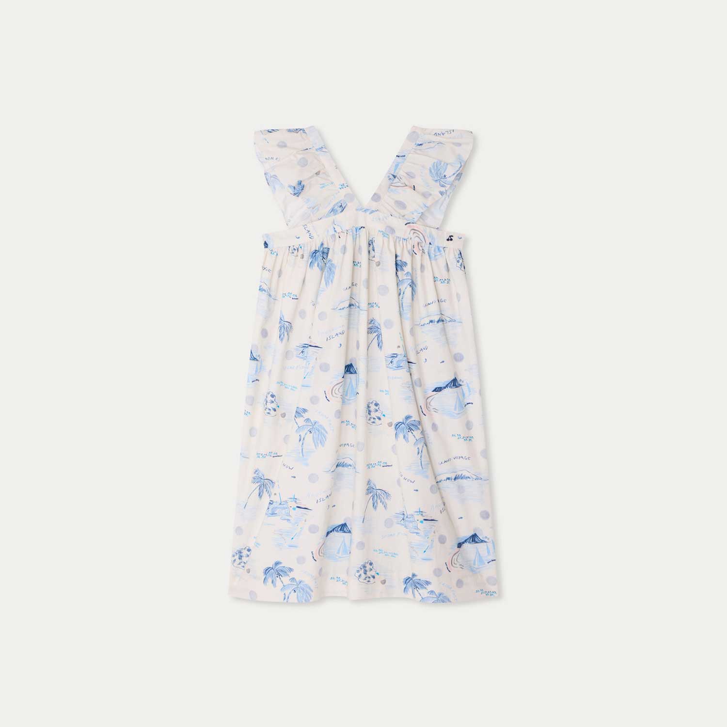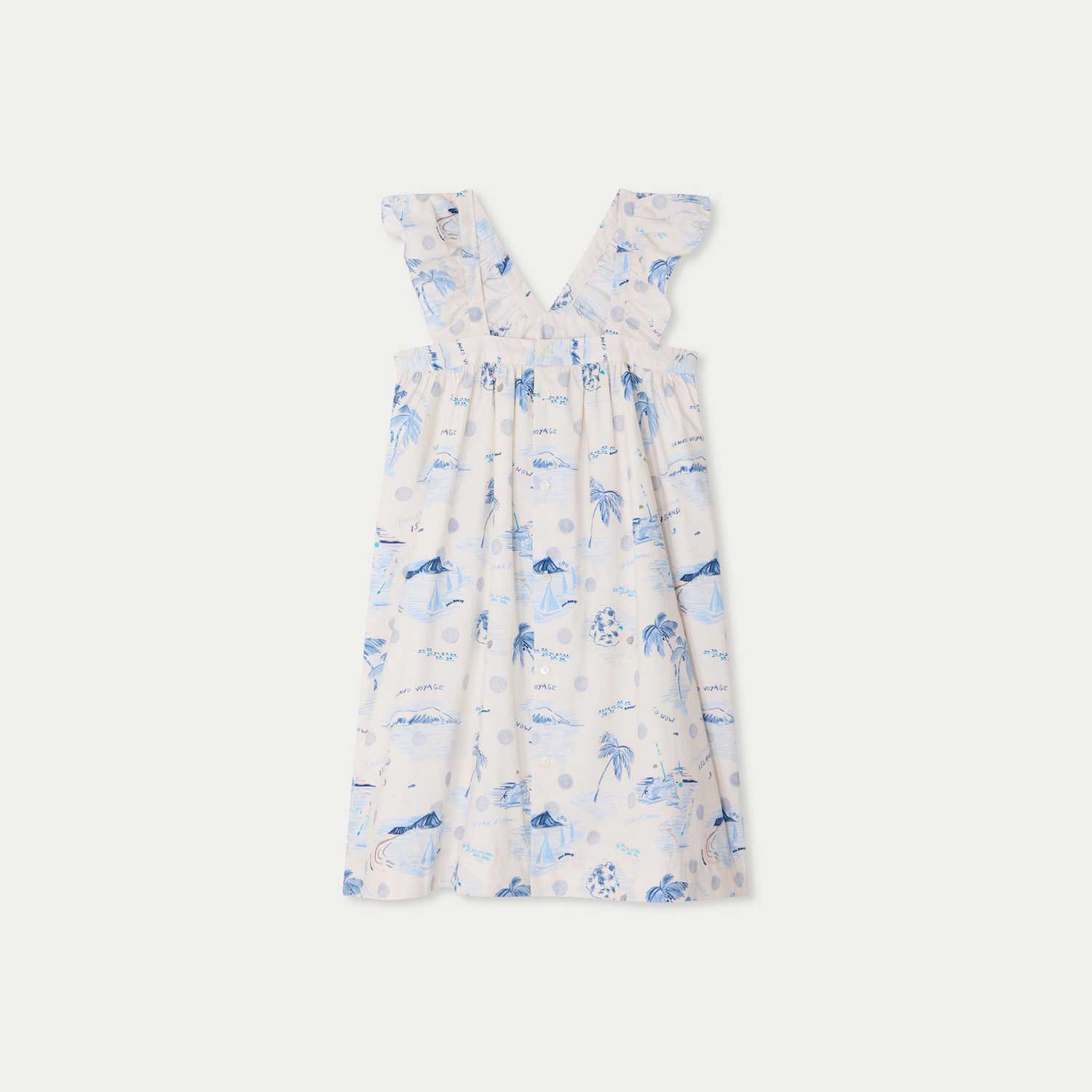 パステルカラーで描いたトラベルモチーフの総柄プリントが愛らしいドレス。V字に配したフリルストラップが、軽やかで可憐な印象を添えています。オーガニックコットンポプリン素材を使用し、裏地にはコットンボイルを配しました。背面はボタン留め仕様です。--・オーガニックコットンポプリン-・ノースリーブ-・コットンボイル裏地-・総柄プリント-・フリルストラップ-・背面ボタン開閉