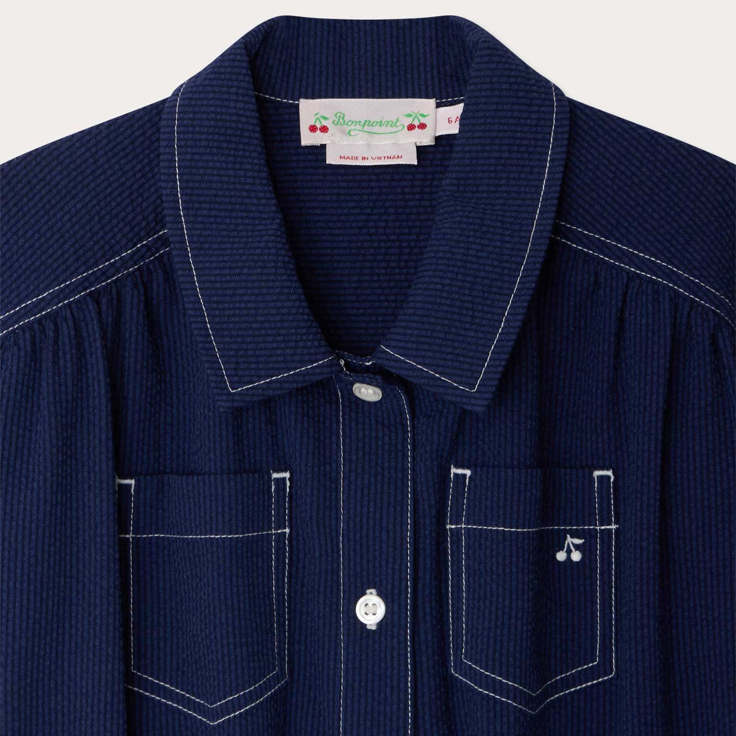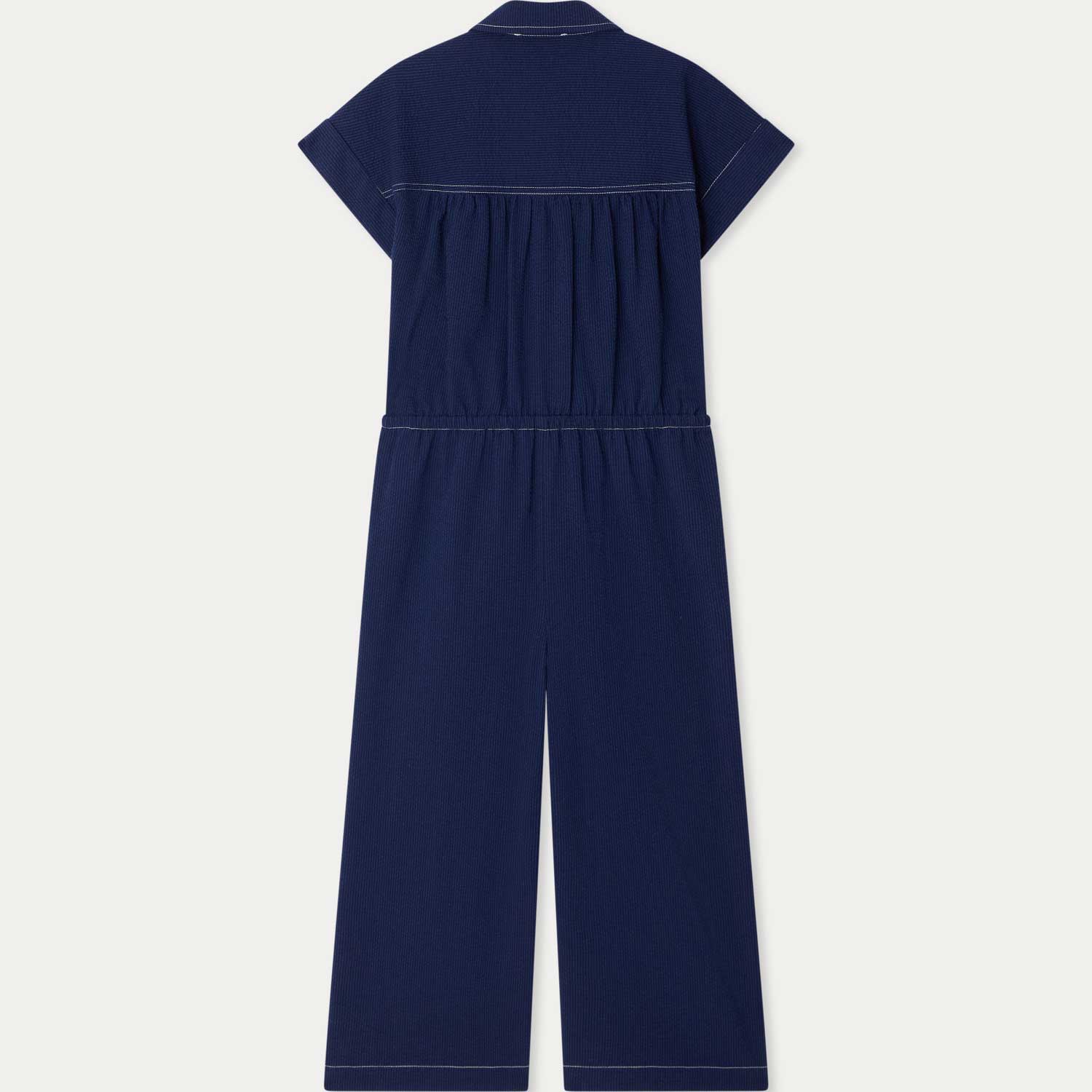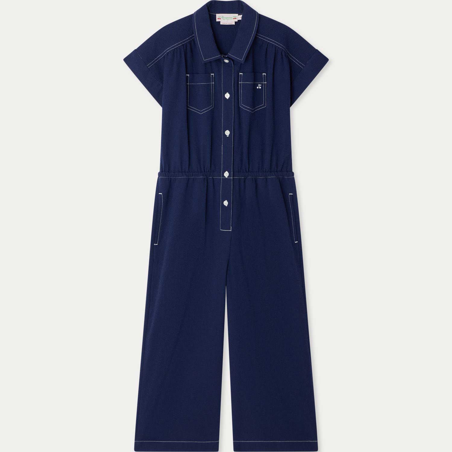 ワークウェアから着想を得たデザインのプレイスーツ。表情のあるシアサッカー素材と、コントラストの効いたトップステッチが特徴です。ウエストはゴム仕様で、快適な着心地を叶えます。--・オーガニックコットン-・折り返しカフス付きショートスリーブ-・刺繍入りパッチポケット×2