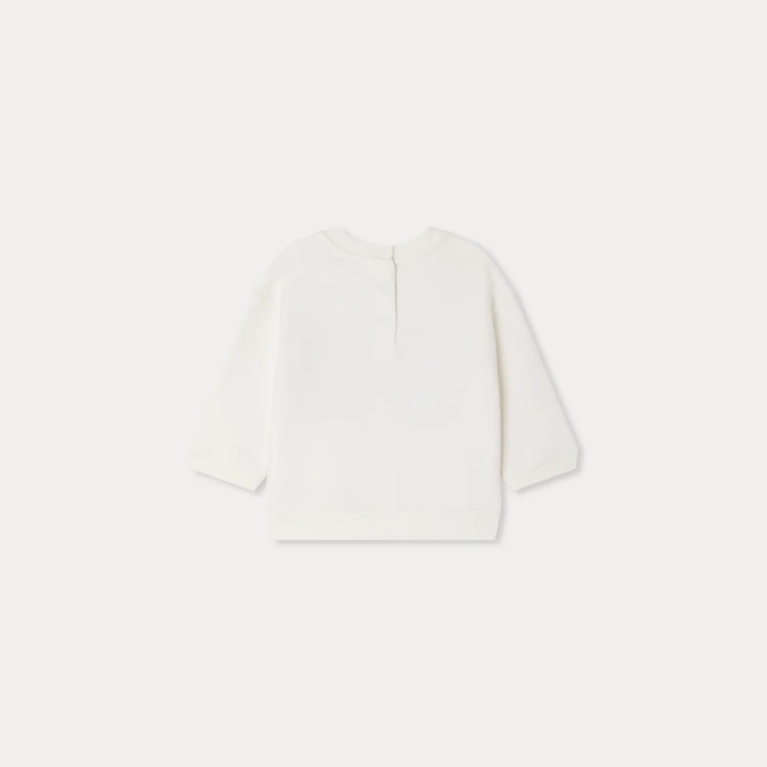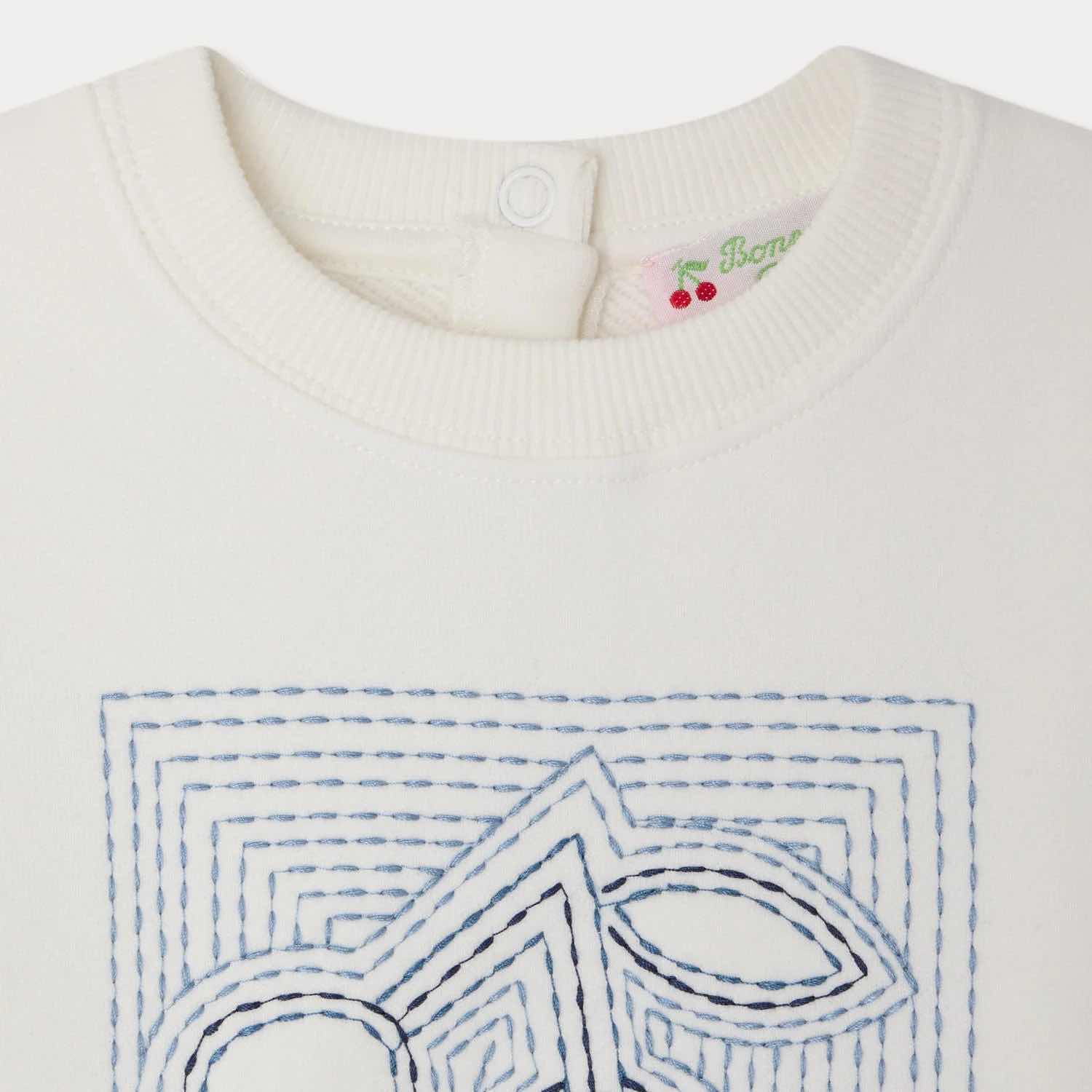 オーガニックコットンのフリース素材を使用したスウェット。フロントには、モダンなデザインのチェリー刺繍をあしらっています。背面はスナップボタン留めで、着脱しやすい仕様です。--・オーガニックコットン-・クルーネック-・リブ仕様の襟・袖口・裾