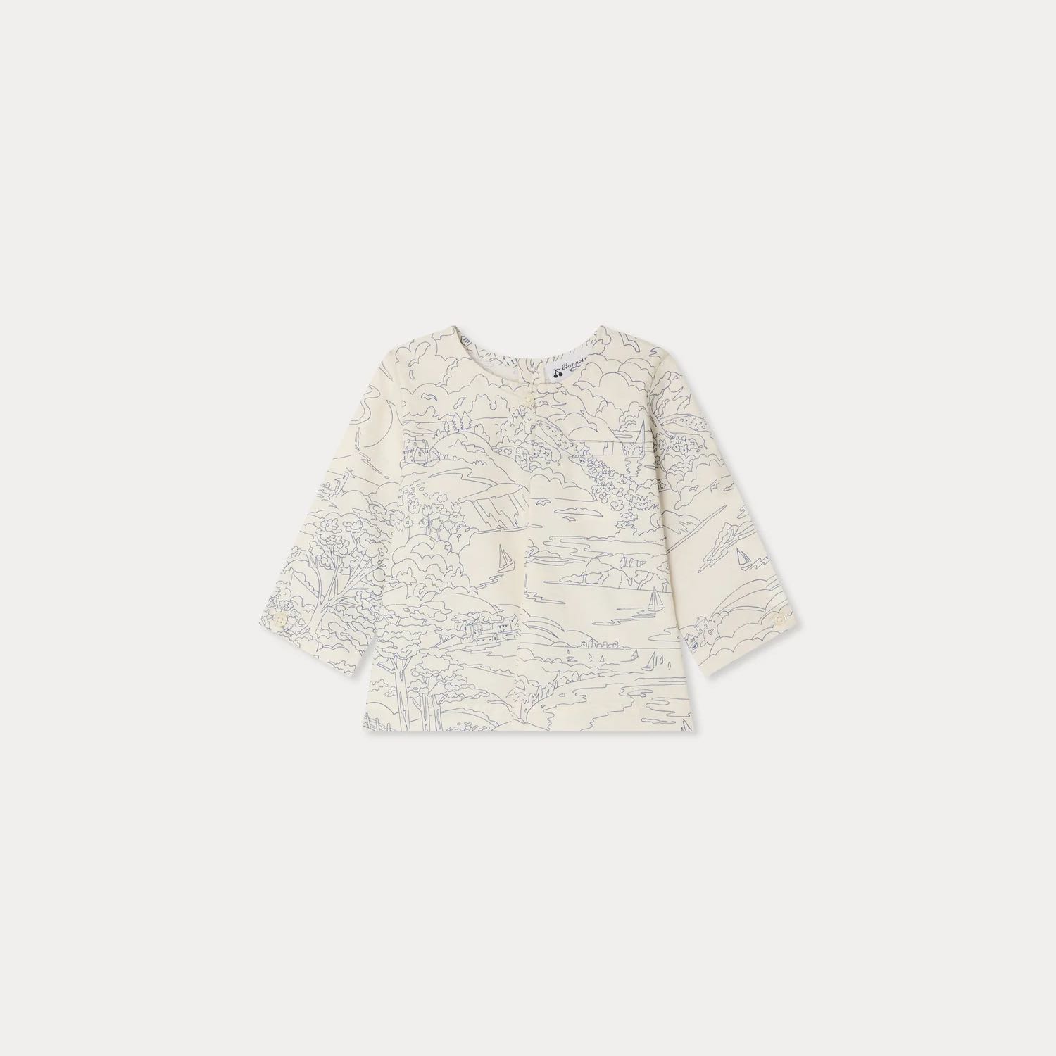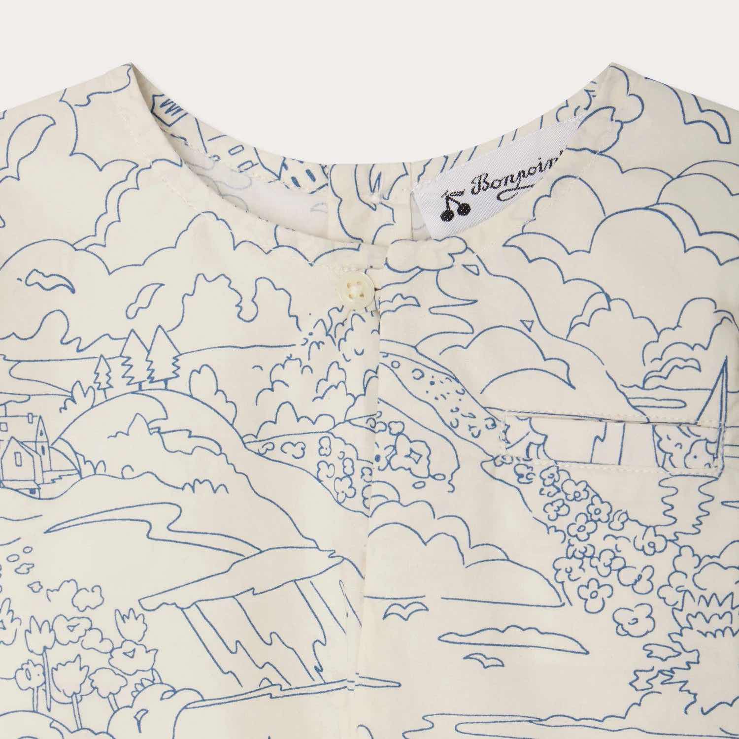 モダンなトラベルプリントが目を引く、リバティファブリックのチュニック。オーガニックコットン素材を使用し、サイズ3〜12か月では背面にボタン留めを備えたデザインです。--・オーガニックコットン-・パイピング付き胸ポケット-・襟元ボタン留め