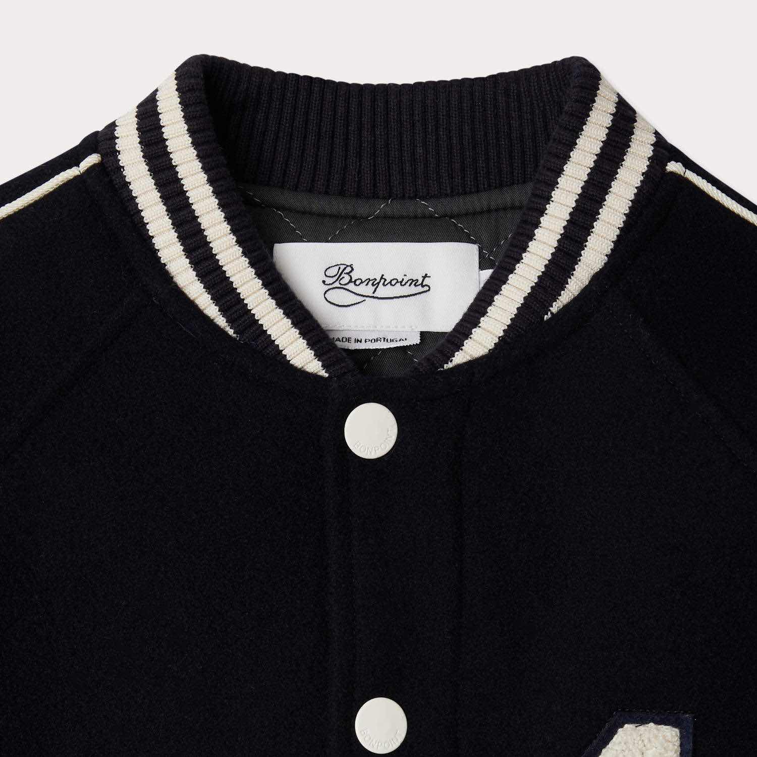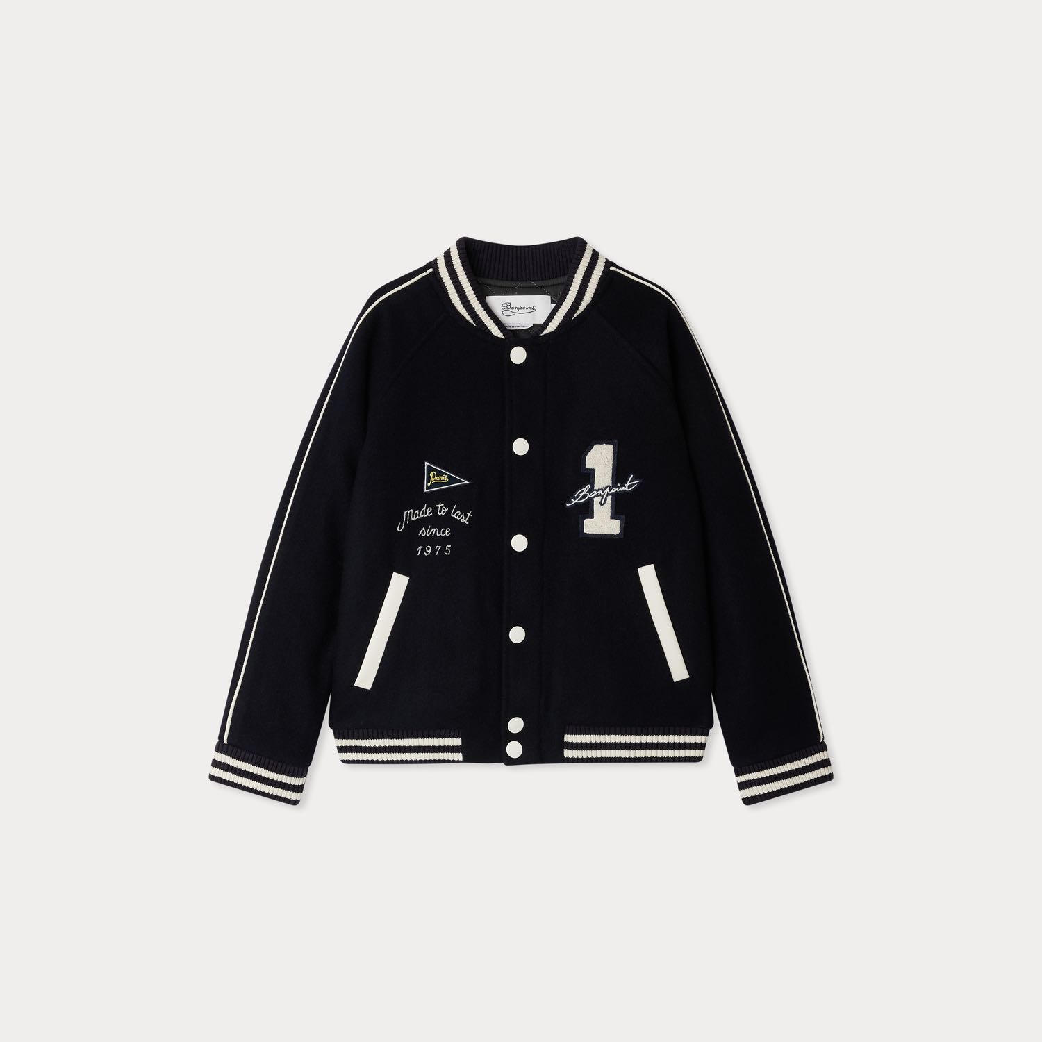 ジョシアス ジャケットは、ヴァーシティジャケットにインスパイアされた、レトロなムード漂うボーイズ向けアウター。フロントには、ブークレニットで表現された「1」のナンバーモチーフをはじめ、オリジナルパッチや刺繍があしらわれ、存在感のあるデザインに仕上がっています。