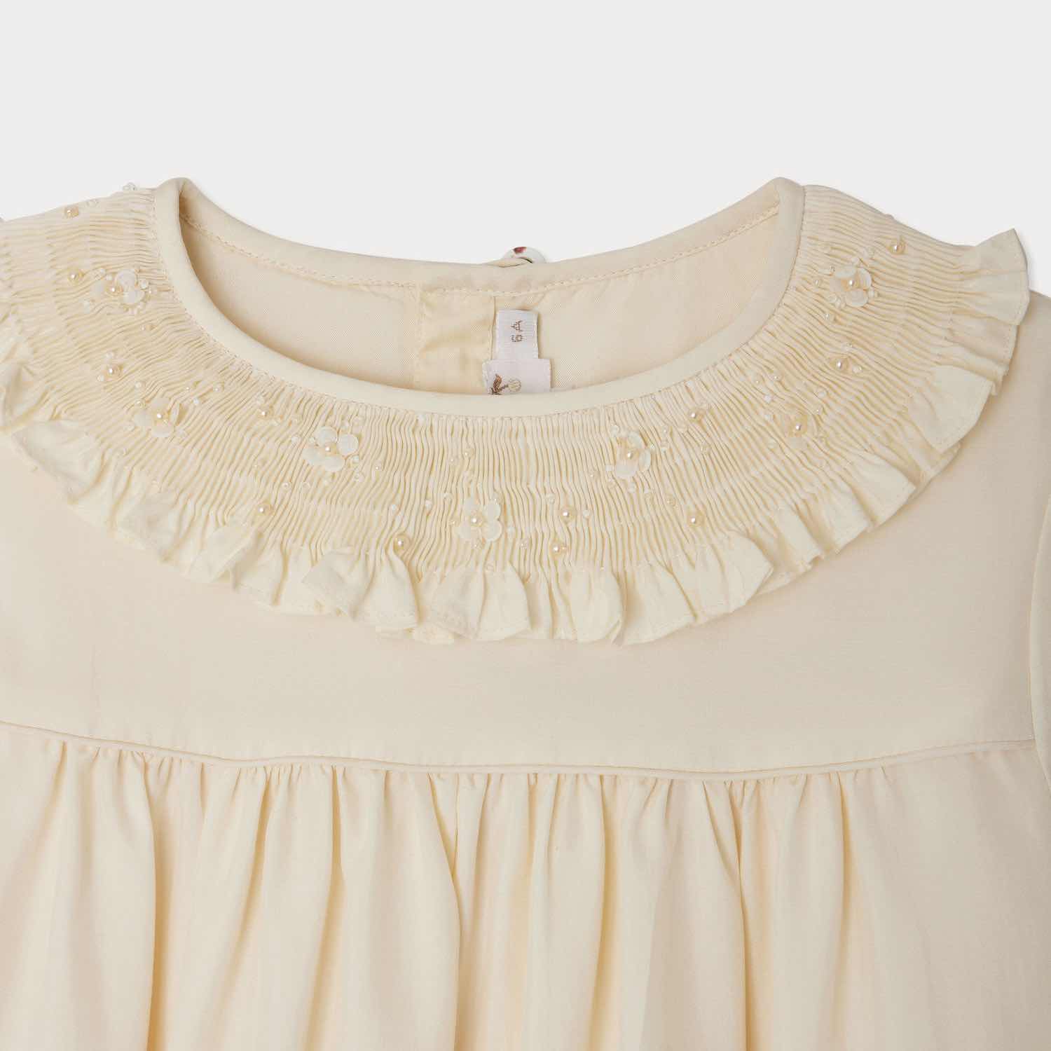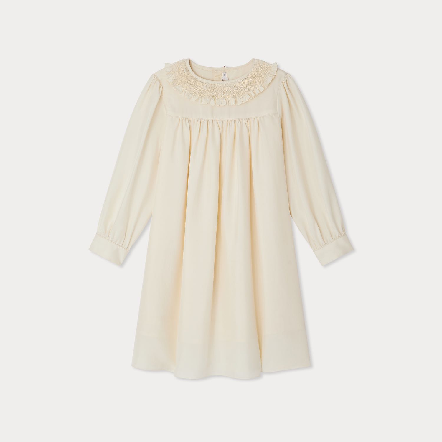 ジャニーヌ ドレスは、特別な日の装いにふさわしい、やわらかく流れるようなシルク素材のガールズドレス。スモッキングとフリルをあしらった襟元には、同色のビーズとスパンコール刺繍が施され、さりげないきらめきを添えています。ふんわりとしたパフスリーブの袖口には幅広のボタンタブが付き、上品なアクセントに。背中上部は、ラインストーンをあしらったマザーオブパールボタンで留める仕様です。