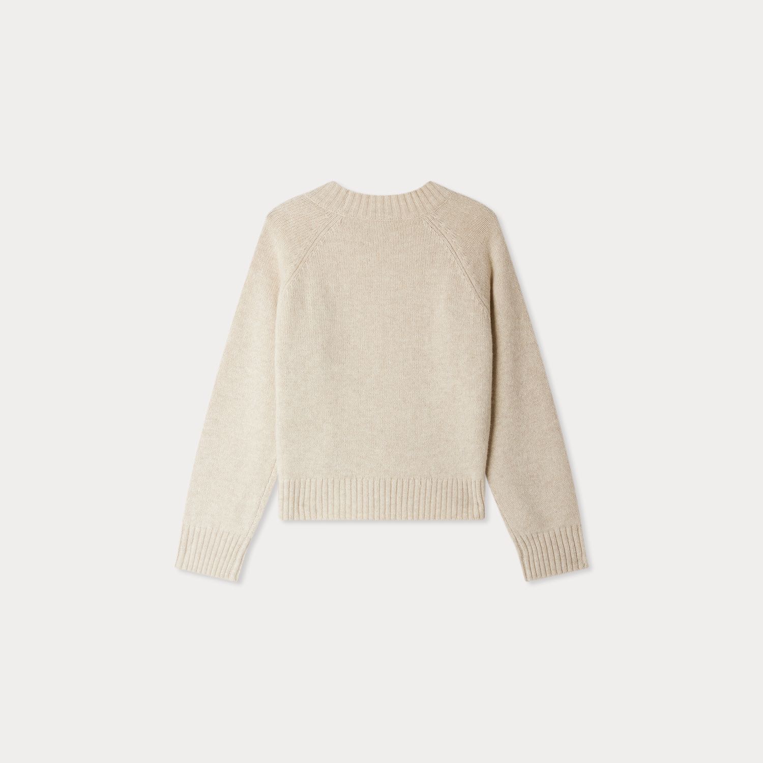 動物福祉に配慮した認証ウール、リサイクル素材、そして認証オーガニックコットンを使用し、サステナブルな価値も備えた一枚です。