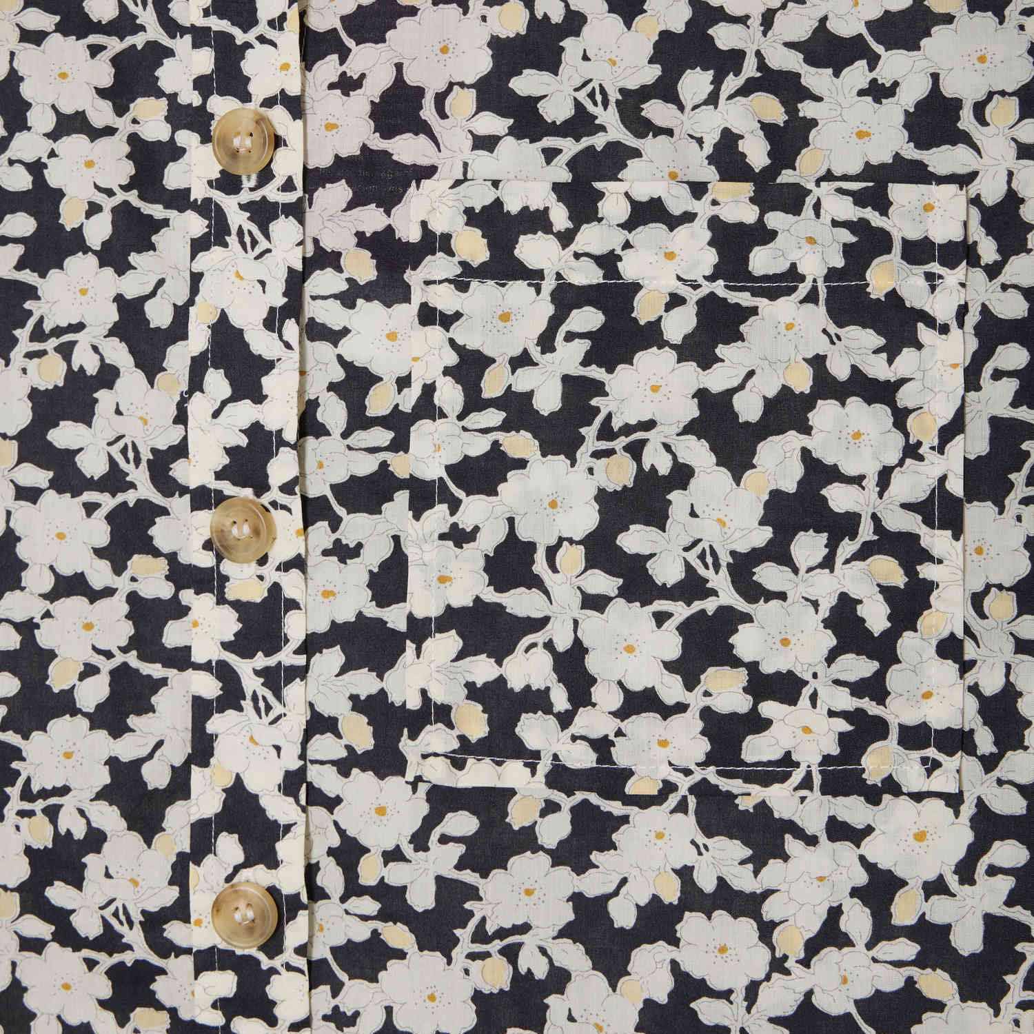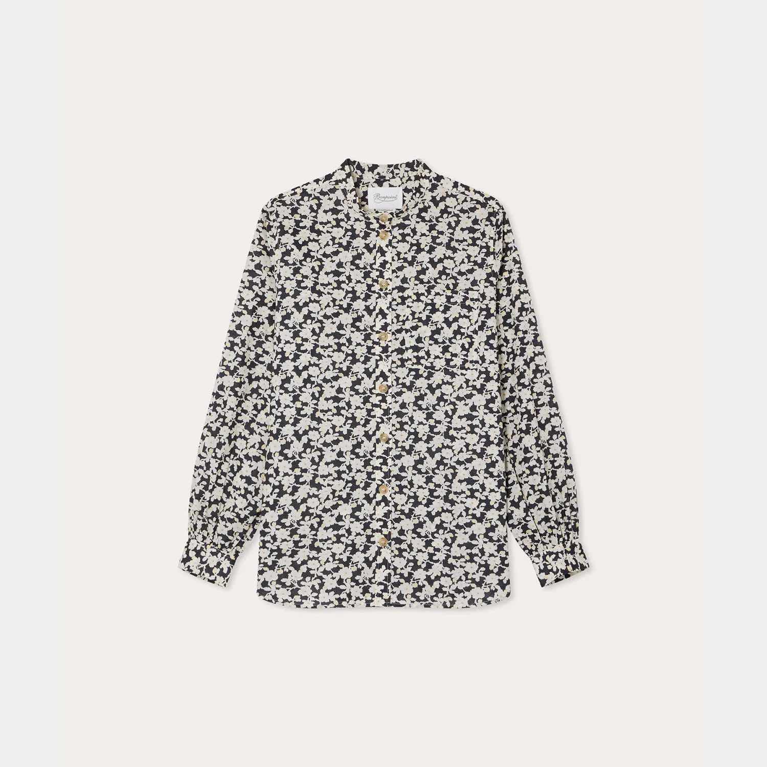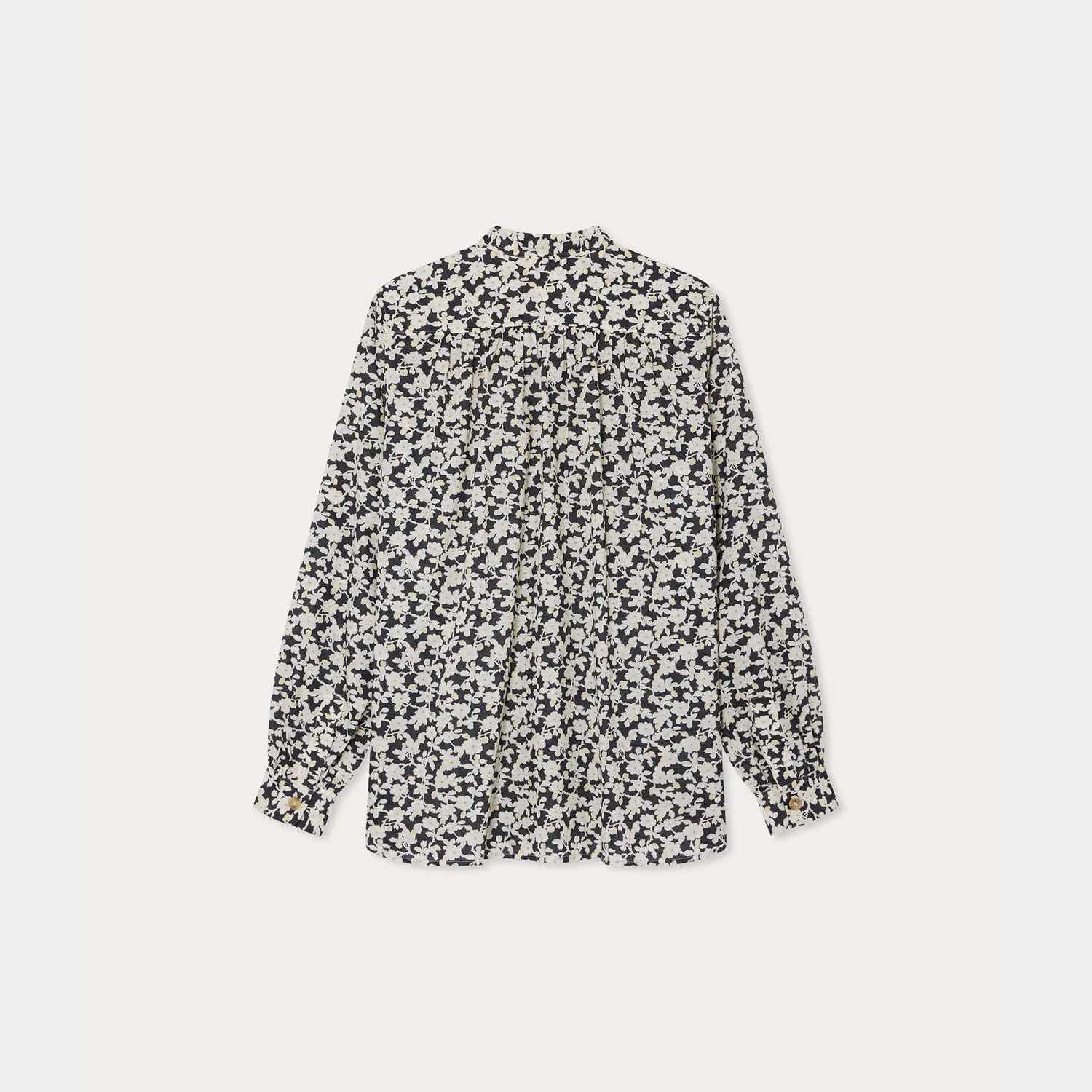 コントラストカラーのフローラルプリントをあしらったスタンドカラーが華やかさを添えます。
