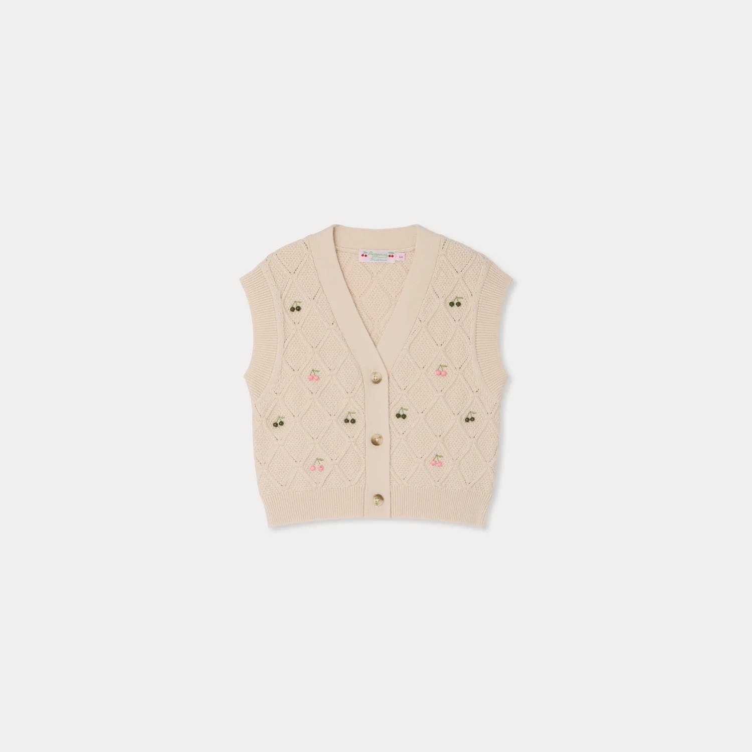 ノースリーブの軽やかなシルエットに、フロントにあしらわれたカラフルなチェリー刺繍が愛らしいアクセントを添えます。