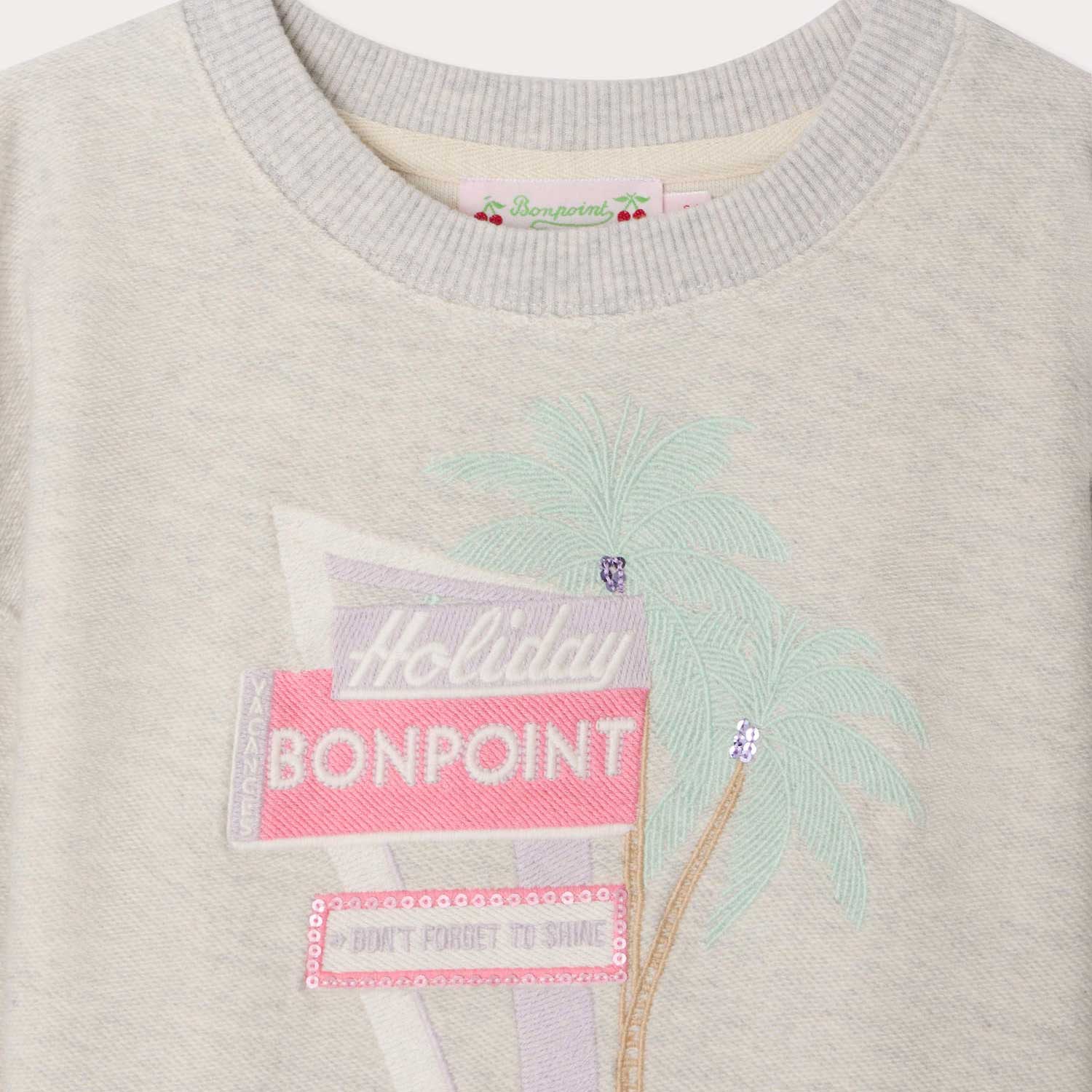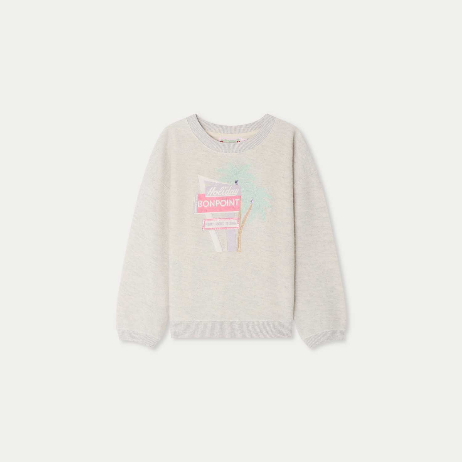 フロントには陽気な雰囲気を添えるBonpointのホリデーメッセージ刺繍をあしらい、ドロップショルダーでリラックス感のあるシルエットに仕上げています。
