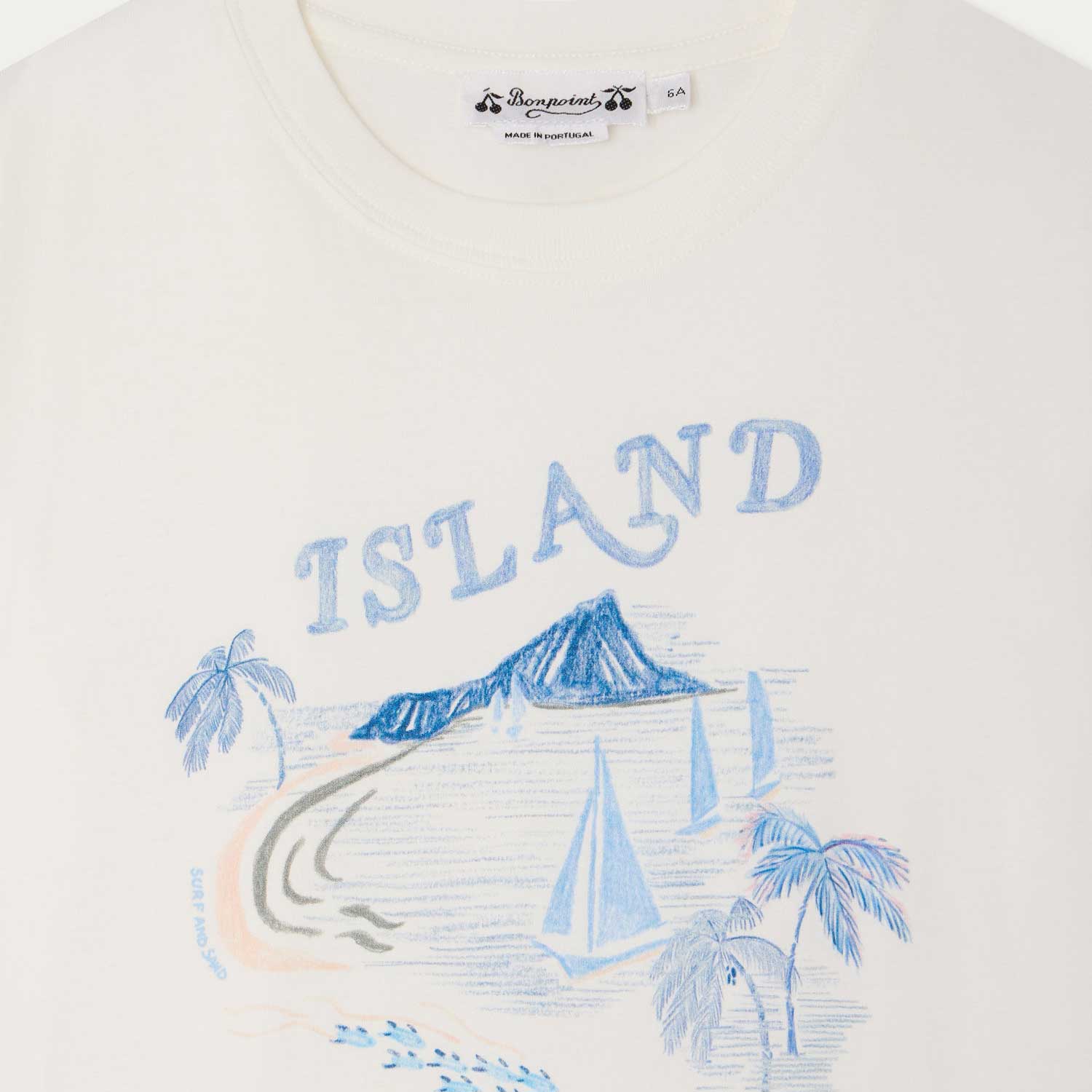 フロントに「Island」の文字と島の風景モチーフをあしらったTシャツ。オーガニックコットン素材を使用し、袖にはBonpointのプラネットラベルを添えています。