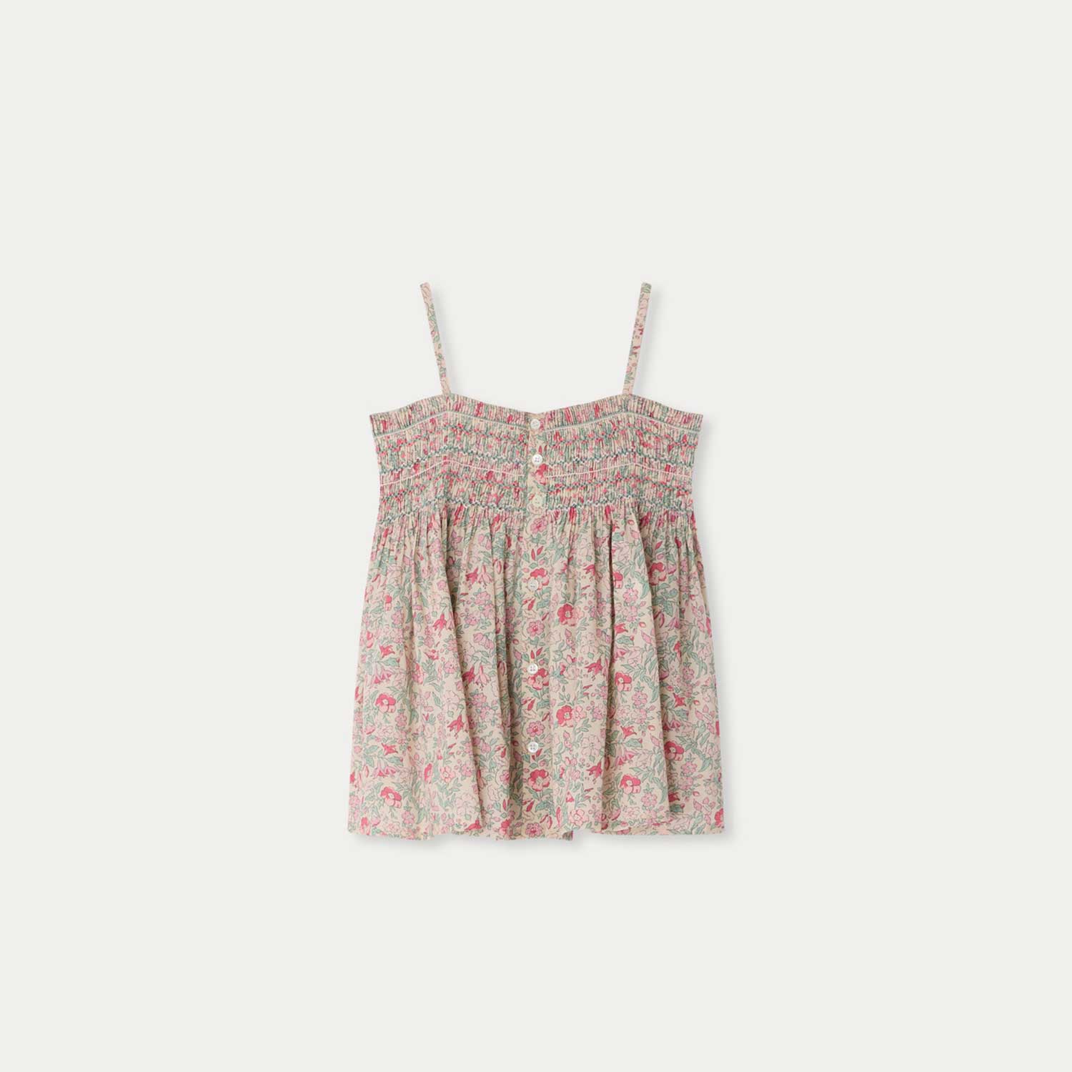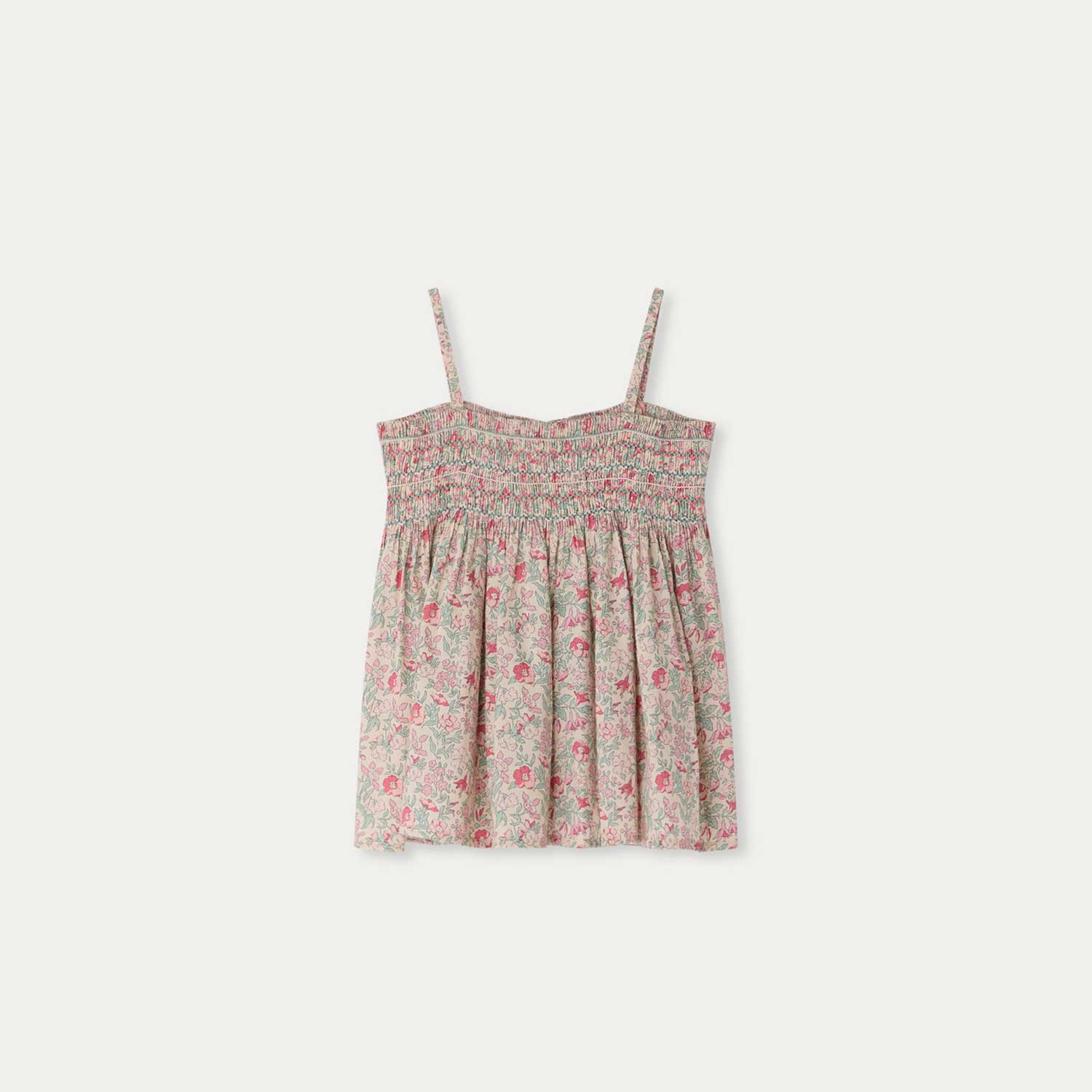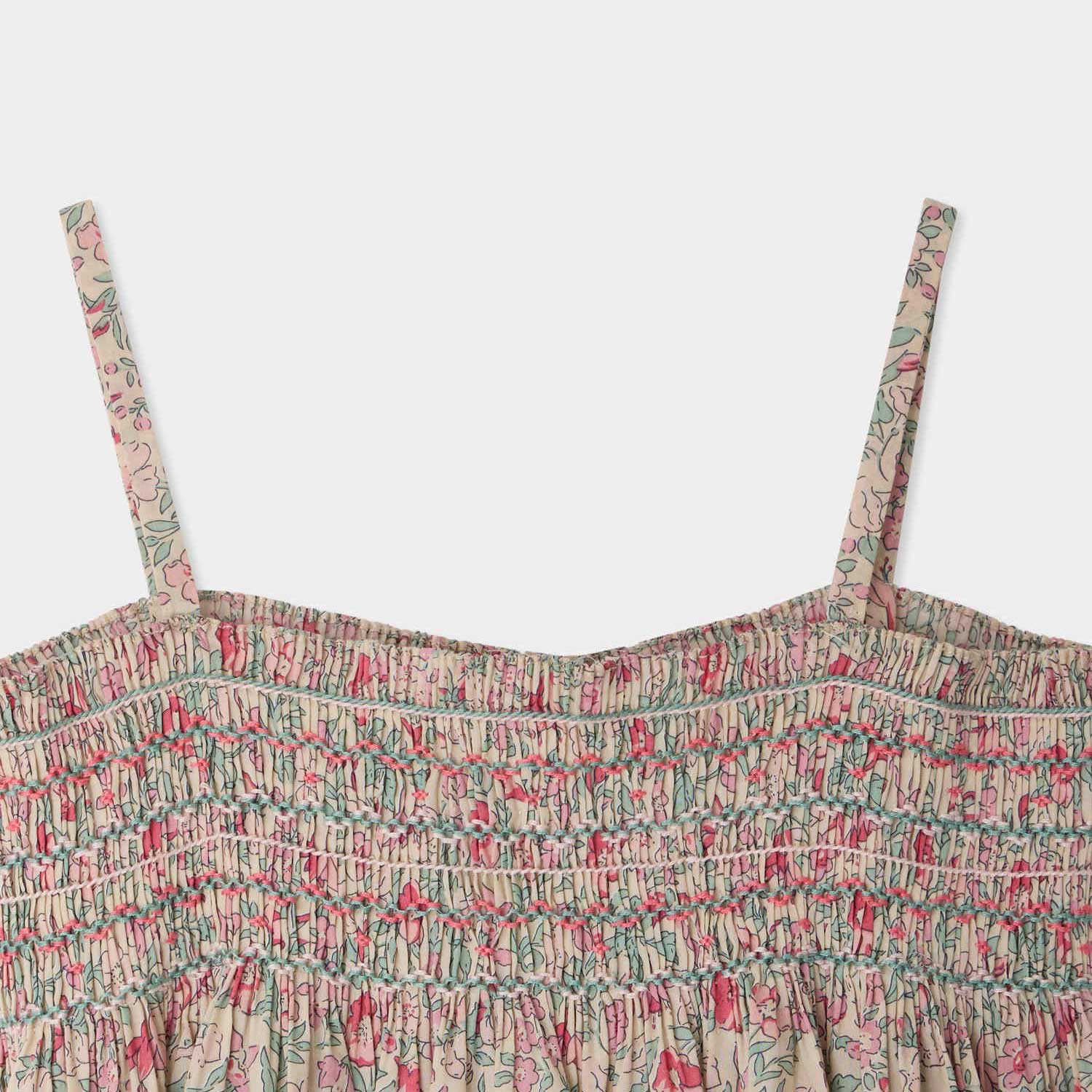 フローラルプリントのリバティ生地を使用した、オーガニックコットンのブラウス。スクエアネックラインに沿って施した手刺繍のスモッキングが、爽やかで洗練された印象を添えています。スパゲッティストラップ仕様で、背面はパール調ボタンによるフルオープン仕様です。
