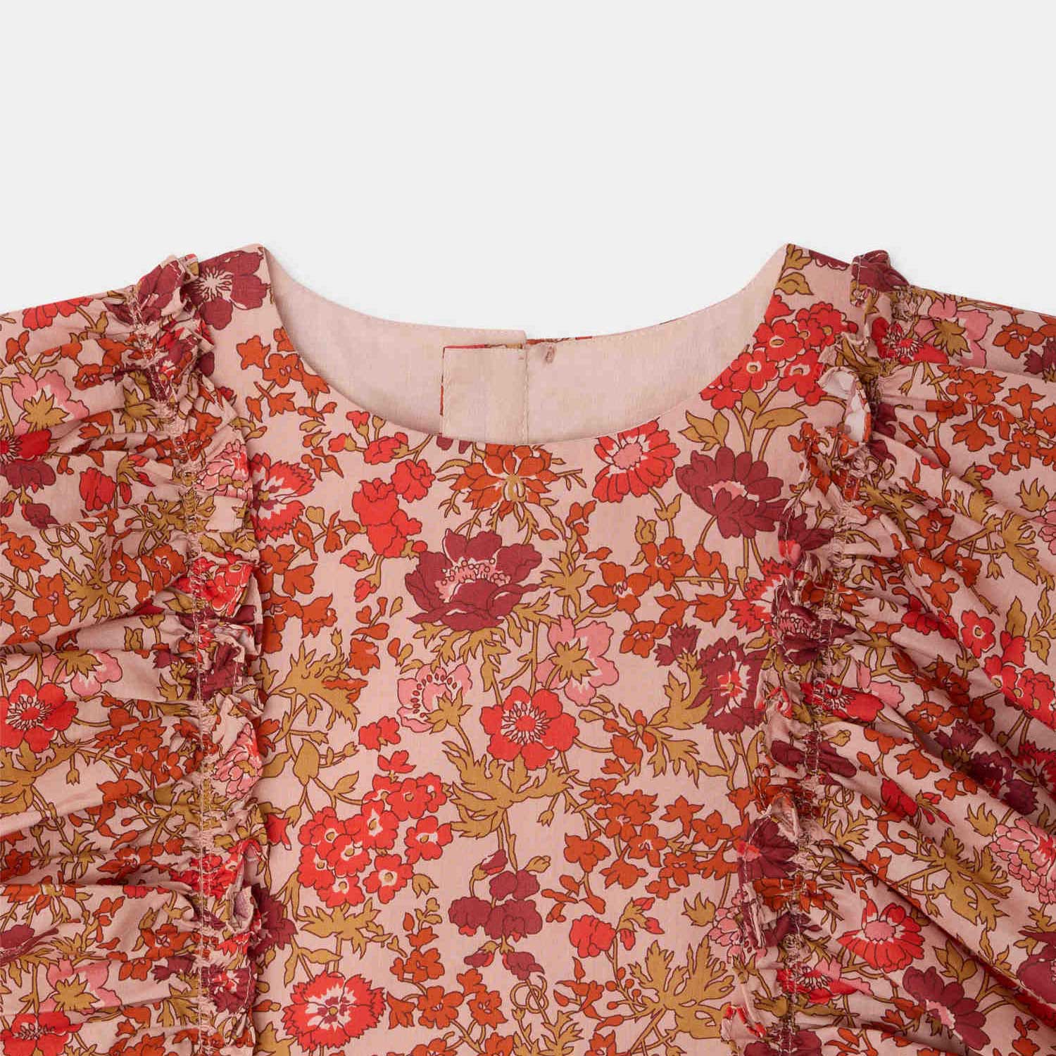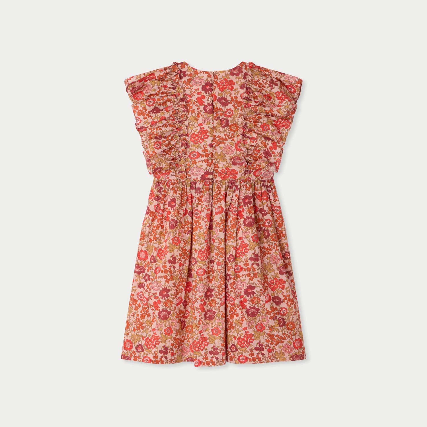 やわらかなオーガニックコットン素材を使用した、ノースリーブドレス。リバティ・タナローンならではの明るく華やかなフローラルプリントが印象的です。肩まわりにはプリーツを施した幅広のフリルを配し、背面は控えめなパール調ボタンで留める仕様になっています。