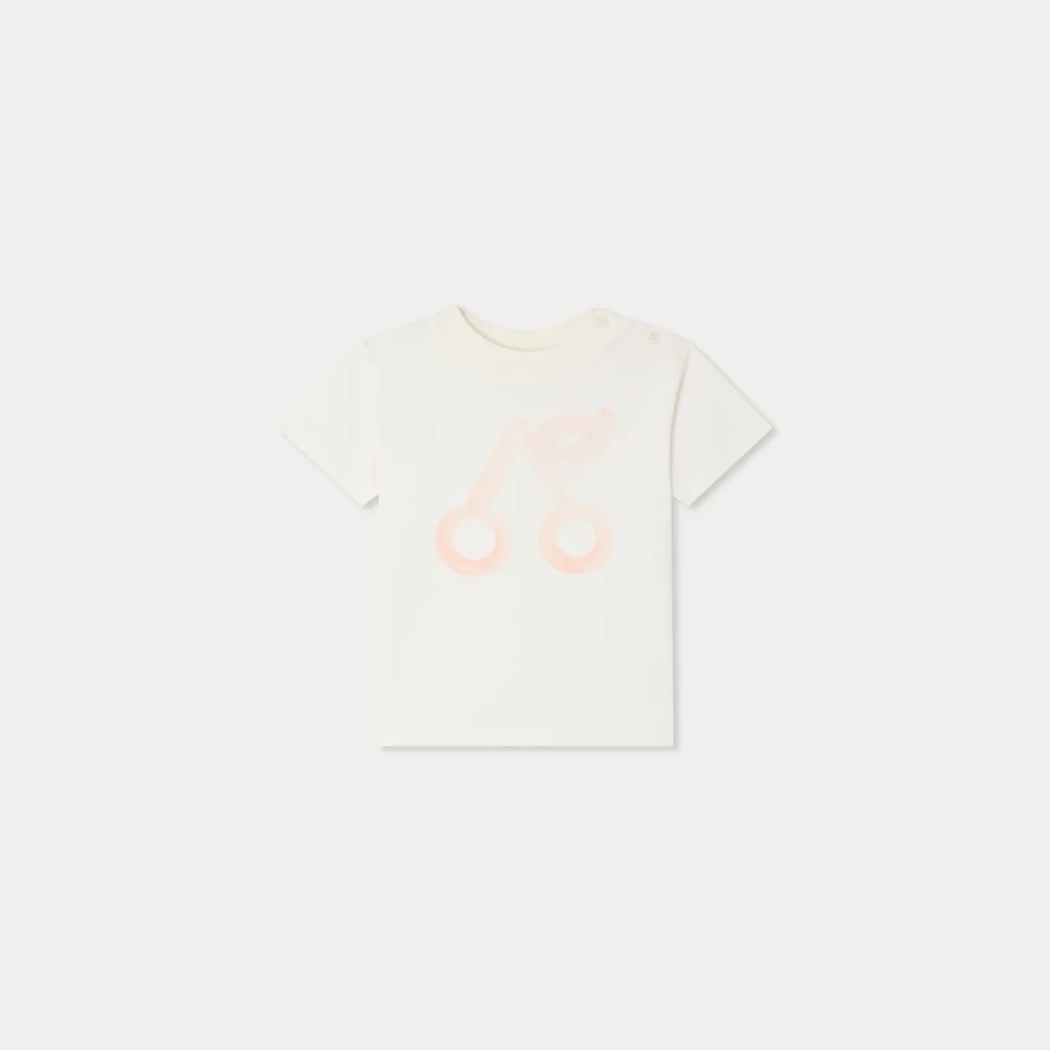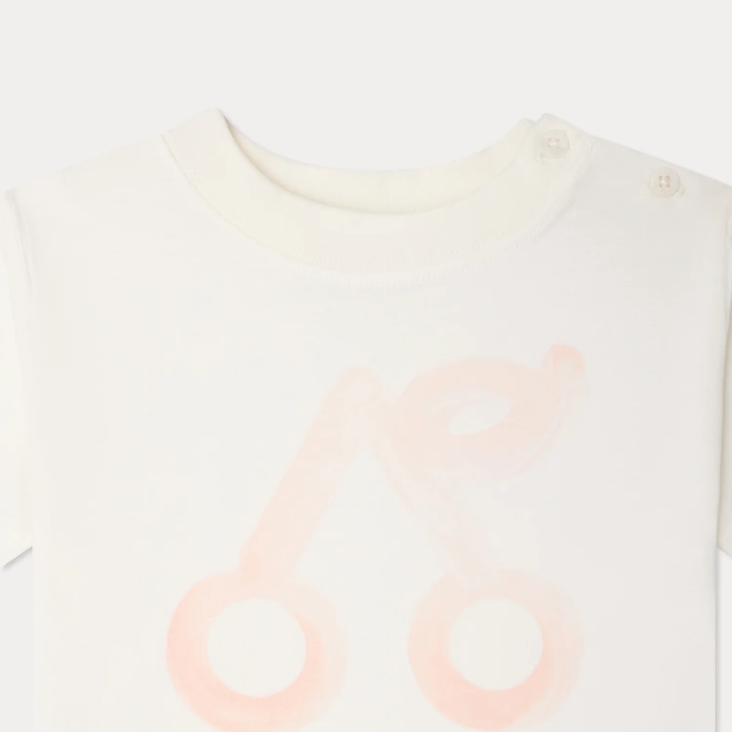 アイコニックなチェリーモチーフを大胆に表現したTシャツ。オーガニックコットン素材を使用し、ゆったりとしたフィット感で快適に着用できます。肩部分にはボタンを配し、着脱しやすいデザインです。